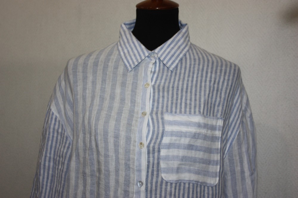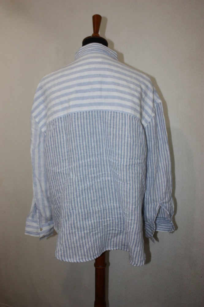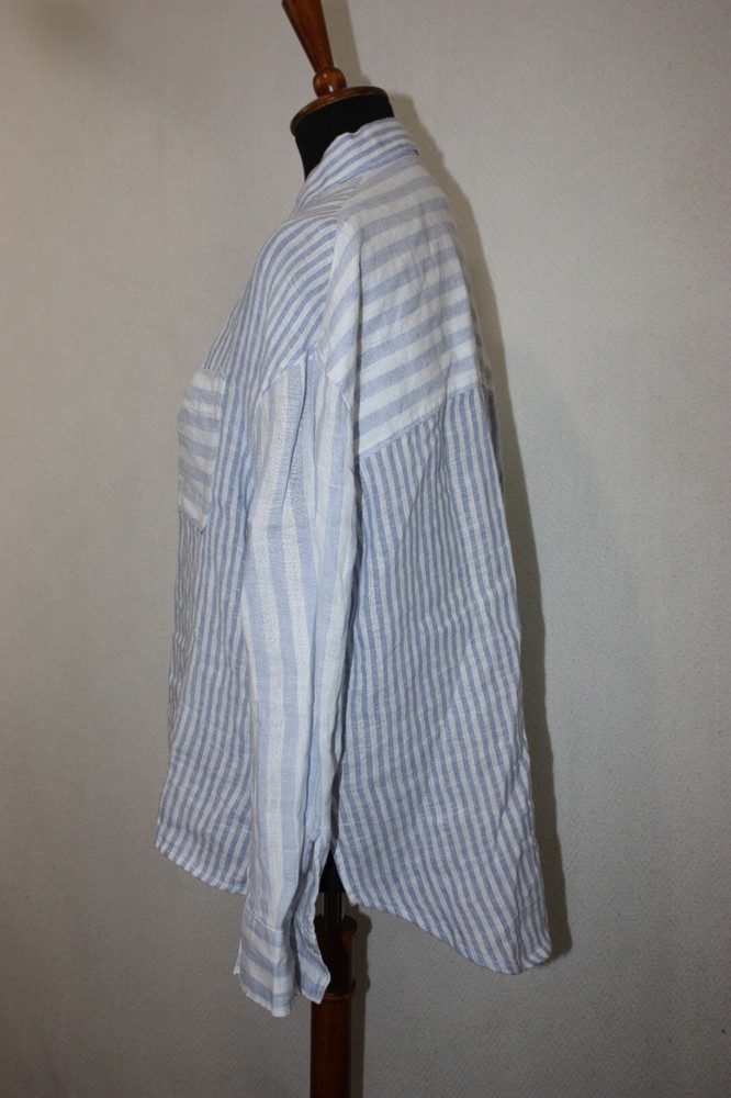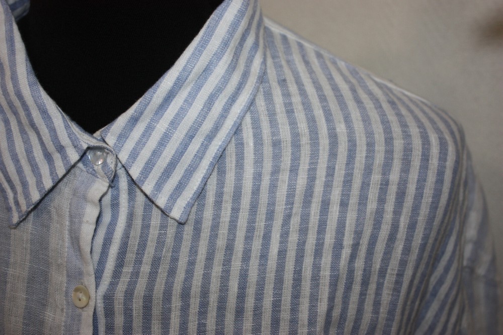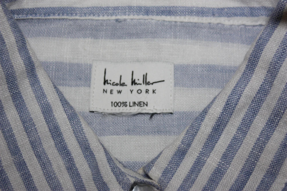 Welcome to Pim's clothing sales Great condition lightweight coarse weave shirt. Long sleeves. Single pocket. Light blue and white stripes in a color block pattern. Brand: Nicole Miller Material: 100% Linen Size : Tag removed - see measurements below Bust: 24 armpit to armpit Shoulders: 22 Length: 28 back of collar to hem (Ask if you need more measurements) Please Remember all Clothing Items may fit differently depending on Brand, Fit, Use or Prior customization. We strongly urge our customers to check measurements first to guarantee proper fitting. Please be sure to check out our listings frequently for more high quality Designer Brand clothing items at a fraction of the price. We are getting new inventory all the time! You never know what amazing deals you may find :) Shipping discounts will be provided for multiple purchases - Please contact us after multiple purchases for an updated invoice.