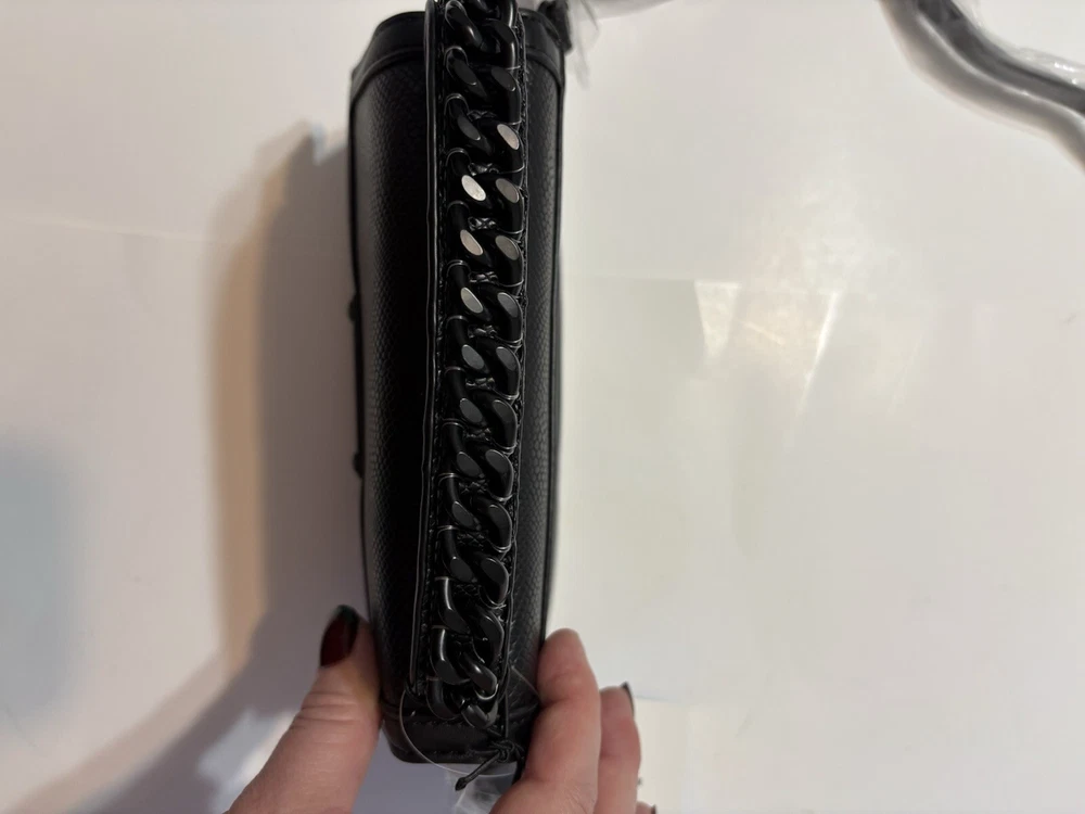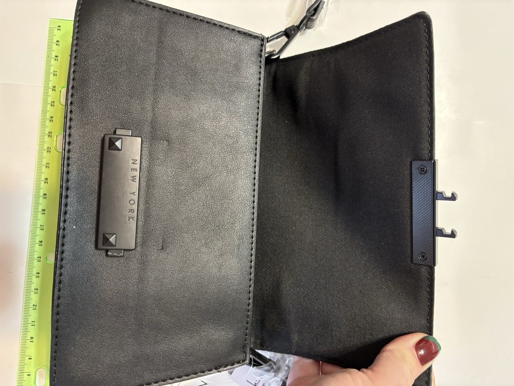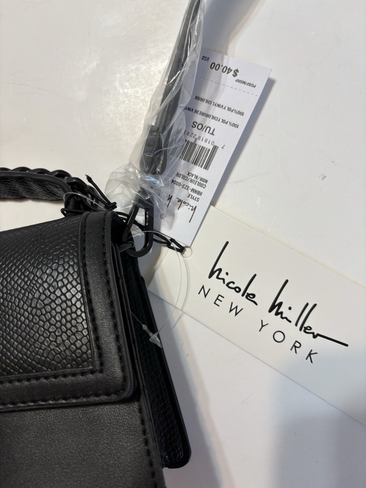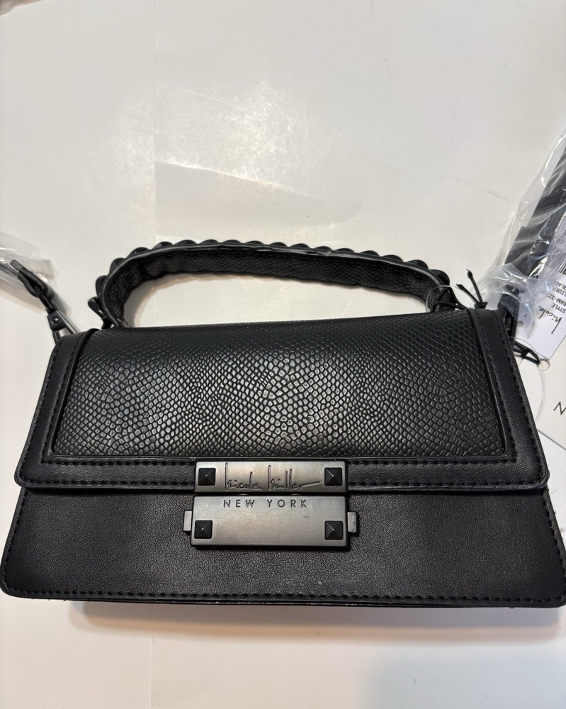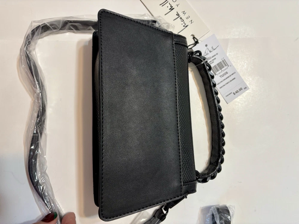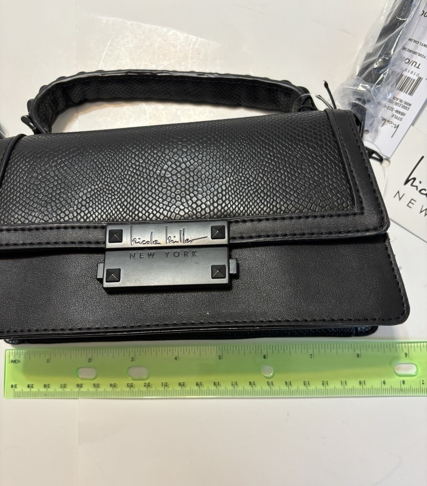 This Nicole Miller NY crossbody bag is a must-have for any stylish woman. With a sleek black exterior made of polyvinylchloride, this bag is perfect for any occasion, whether it's for travel, a party/cocktail event, or just for casual use. The bag features a top handle, an adjustable strap drop, and a squeeze fastener closure for added convenience. In addition to its functional features, this bag also boasts several stylish aspects, including a rectangular shape, inner card pockets and a lightweight design. The bag's exterior color is black, while the lining color is also black. The handle/strap material is made of PVC, and the hardware color is black. This small satchel is perfect for anyone who wants to add a touch of sophistication to their outfit without compromising on practicality.