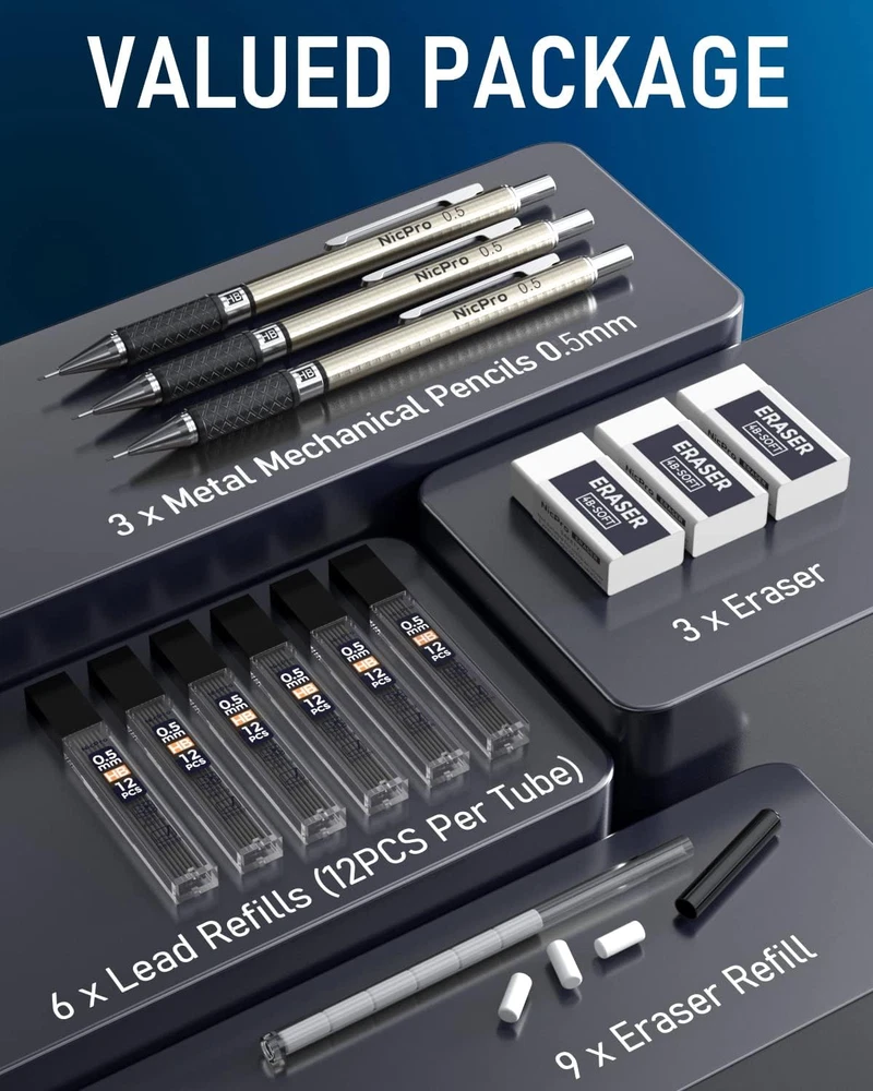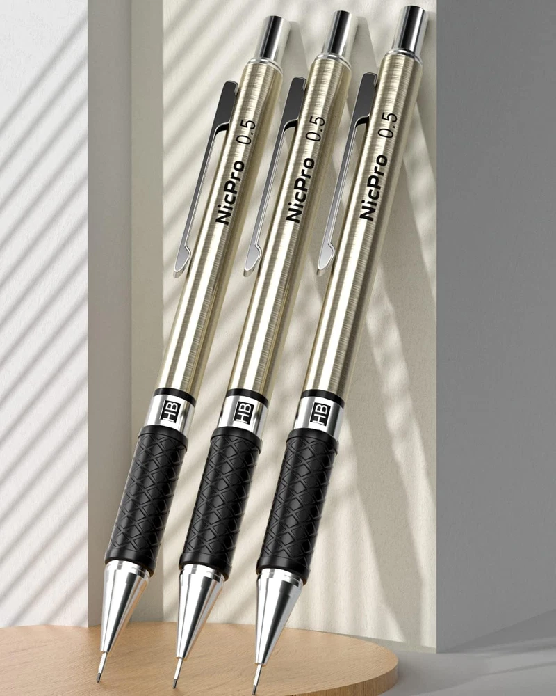 Value Mechanical Pencils Set: The drafting pencil set come with 3 pcs metal mechanical pencils 0.5, 6 tubes HB lead refill (12 pcs / tube), 3 pcs erasers, 9 pcs eraser refills, a plastic pencil case, easy to carry and storage Comfortable Grip: Non-slip chiseled metallic grip inlaid with soft latex-free pads, comfortable to hold. These drafting pencil provides fatigue-free writing and drawing Resists Breaking Lead: The good lead doesn't smudge and erases cleanly, pre-loaded with lead, never needs sharpening, is very durable and will not break easily. The lead advances easily at the touch of a click for easy use Great Weight Balance: The metal mechanical pencil is full-brass metal body gives it a professional look, ideal weight balance at your fingertips for precise drafting and template work, brings you more effective and high quality tasks Ideal Gift Choice: Perfect for writing, draft, drawing, sketch. A great mechanical pencil set for artists, professionals such as engineers, technical, CAD drafting, teachers and students Product Description VALUED MECHANICAL PENCIL SET 1 For Drawing and Sketching 2 For Writing More Choices From Nicpro Mechanical Pencil Add to Cart Add to Cart Add to Cart Add to Cart Add to Cart Add to Cart Add to Cart Customer Reviews 4.6 out of 5 stars 1,613 4.7 out of 5 stars 2,273 4.7 out of 5 stars 2,273 4.6 out of 5 stars 1,613 4.7 out of 5 stars 117 4.6 out of 5 stars 830 4.6 out of 5 stars 830 Price $9.99 $ 9 . 99 $15.99 $ 15 . 99 $15.99 $ 15 . 99 $13.99 $ 13 . 99 $23.99 $ 23 . 99 $7.99 $ 7 . 99 $13.99 $ 13 . 99 Material Metal Metal Metal Metal Metal Plastic Plastic Size 0.5MM 0.5, 0.7, 0.9, 2.0 MM 0.3, 0.5, 0.7, 0.9, 2.0 MM 0.5MM 0.5, 0.7, 0.9, 2.0 MM 0.5MM 0.5MM Lead Refill 6 Tubes Lead Refill 10 Tubes Lead Refill 11 Tubes Lead Refill 6 Tubes Lead Refill 20 Tubes Lead Refill 8 Tubes Lead Refill 8 Tubes Lead Refill Erasers 3 Pcs +9 Pcs Erasers Refill 3 Pcs +9 Pcs Erasers Refill 2 Pcs +9 Pcs Erasers Refill 18 Pcs Erasers Refill 4 Pcs +18 Pcs Erasers Refill 1 Pcs +9 Pcs Erasers Refill 3 Pcs +20 Pcs Erasers Refill Built-in Eraser √ √ √ √ √ √ √