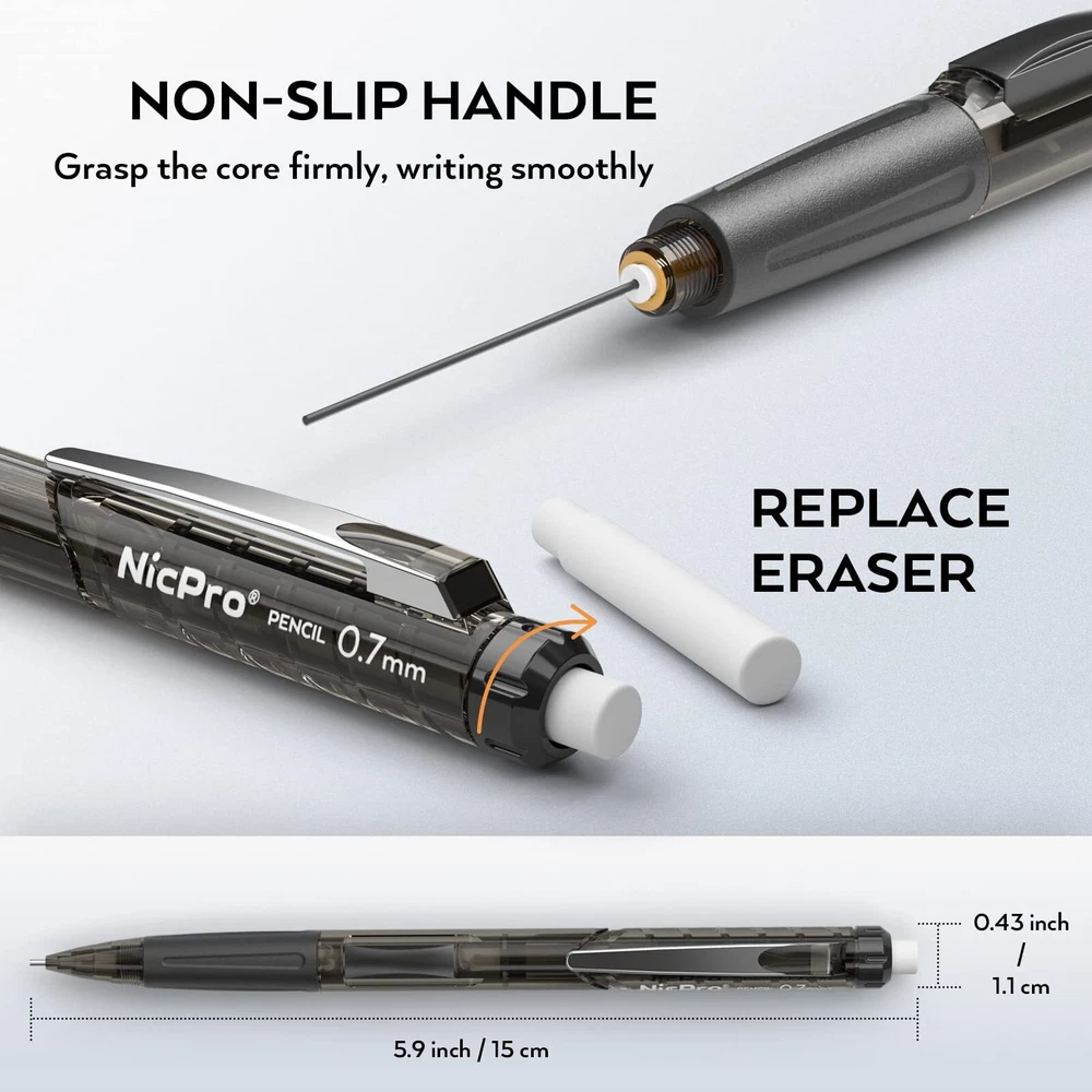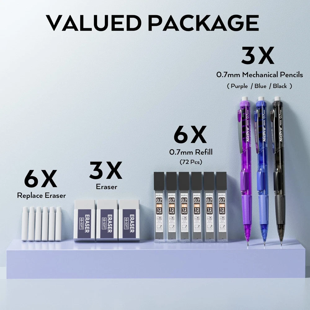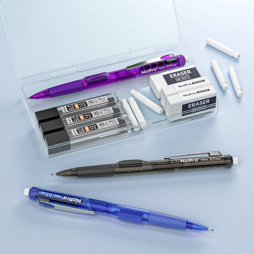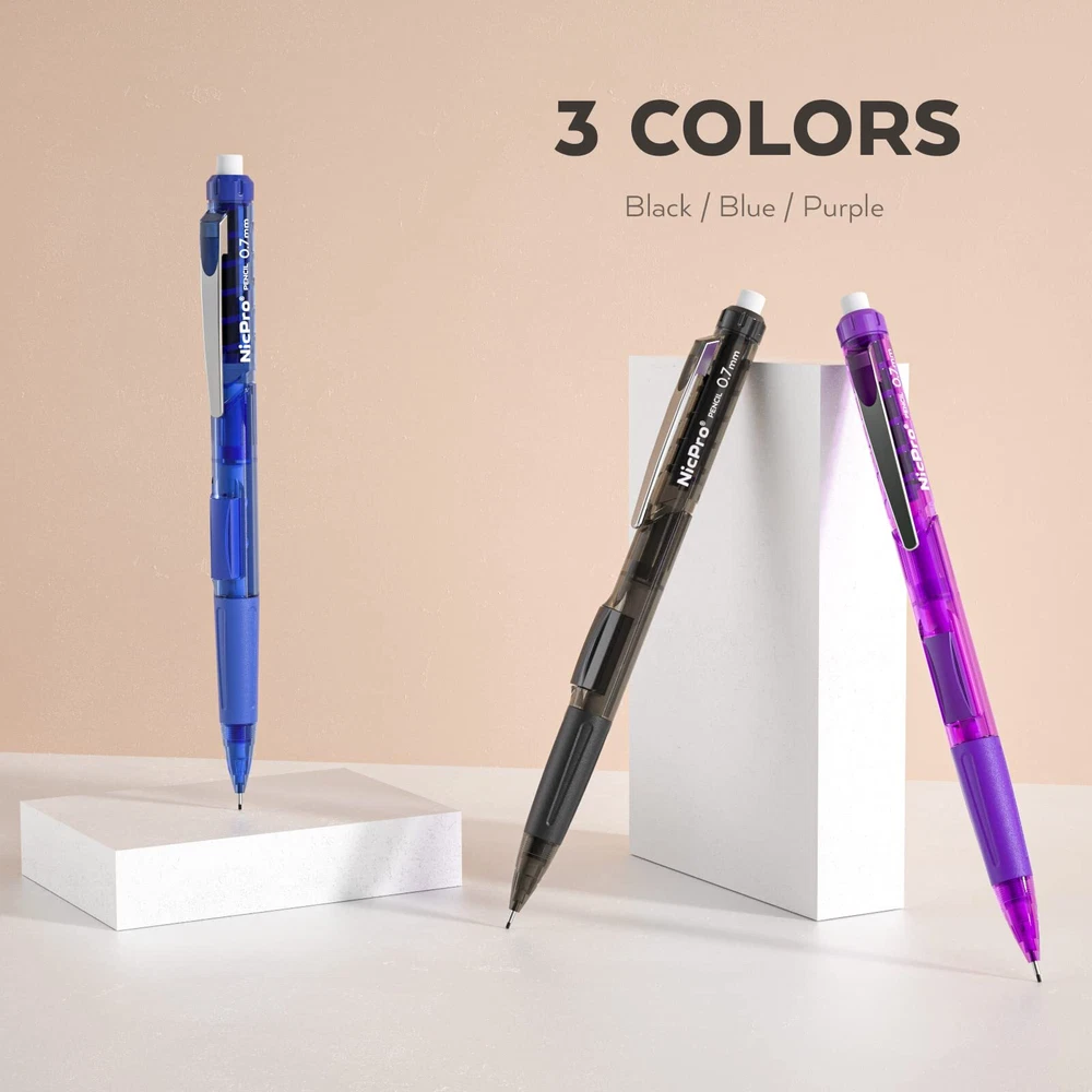 Specification Type: Self Sharpening Mechanical Pencils Size:0.7mm Material:Plastic Color: Black, Blue, Purple Lead Refill Material:resin Color: Black Size: 0.7 mm HB Value Package: Come with 3 pcs 0.7mm mechanical pencil in black, blue and purple colors, 6 tube lead refill and 3 pcs 4B erasers and 6 pcs twist up replaceable eraser refills, a storage case. Easy to click: Convenient click advance button on the side lets you easily advance lead without releasing the pencil. Compact and lightweight Comfort grip: Comfortable, non-slip & extra-soft rubber grip for less writing fatigue. Translucent barrel,refillable erase design. Ideals for artists, professionals, teachers and students alike. Perfect for writing, draft, drawing, sketch, must have for everyday use. 100% RISK FREE PURCHASE: If you are not satisfied with Nicpro mechanical pencil set , we’re very happy to either provide a no-questions-asked Refund or Replacement. Order today risk free!