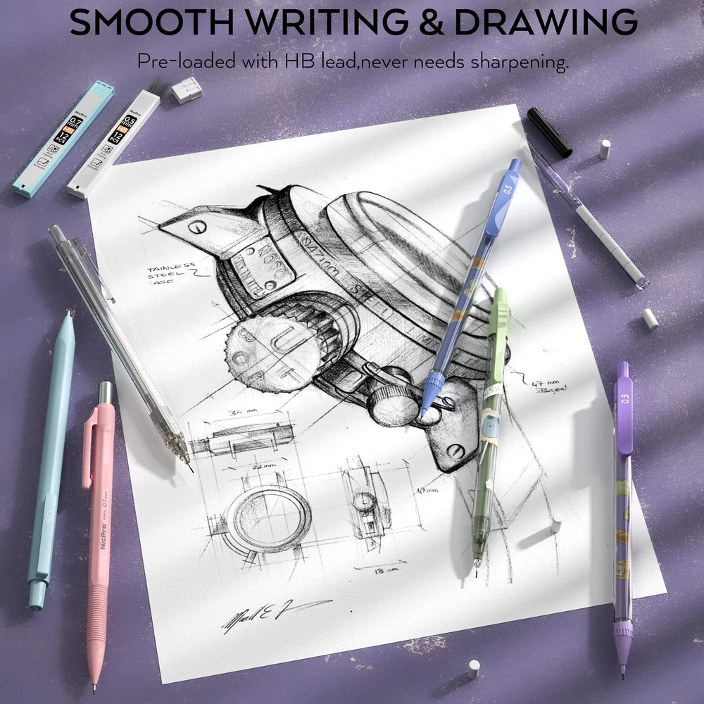 Features:Professional pencils set comes with mechanical pencils, erasers and refills, which can meet people's various needs. Besides, Here's a very nice plastic bag to hold all your pencils and you can store your stationery well.Fancy pencils gift set is a best gift for school season, graduation ceremony, birthday parties. They also can be applied as school prize or class rewards for students. , Cute mechanical pencil can be applied for a long time.Value Package:13 X 0.5 mm mechanical pencils13 X 0.7 mm mechanical pencils16 of the 26 drafting pencils come with top small erasers2 tubes eraser refills3 X 0.5 mm black lead refills3 X 0.7 mm black lead refillsMaterial: PlasticColor: colorful 【Mixed Mechanical Pencils】: The exquisite mechanical pencil set come with 26 pcs drawing pencils (13 pcs 0.5mm and 13 pcs 0.7mm), 6 tubes of lead refill in 0.5 mm & 0.7mm, 18 cap eraser refills. 【Smooth Writing】: It's pre-loaded with black lead, NO needs sharpening, create clear, precise lines. 0.5 & 0.7mm medium point is ideal for a variety of everyday writing and drawing. 【Featuring Colorful Barrels】: Various styles of cute mechanical pencils for kids, girls, boys and adults. You can share your mechanical pencil with your friends. 【High-Quality Lead】: The good lead doesn’t smudge and erases cleanly. so your work looks very neat. With the 26 pack of mechanical pencils, you can write with style all year long. 【With Exquisite Packaging】They’re the perfect mechanical pencils for school supplies.We provide beautiful packaging for you to carry and give as gifts to friends.Nicpro offers dependable performance and value.