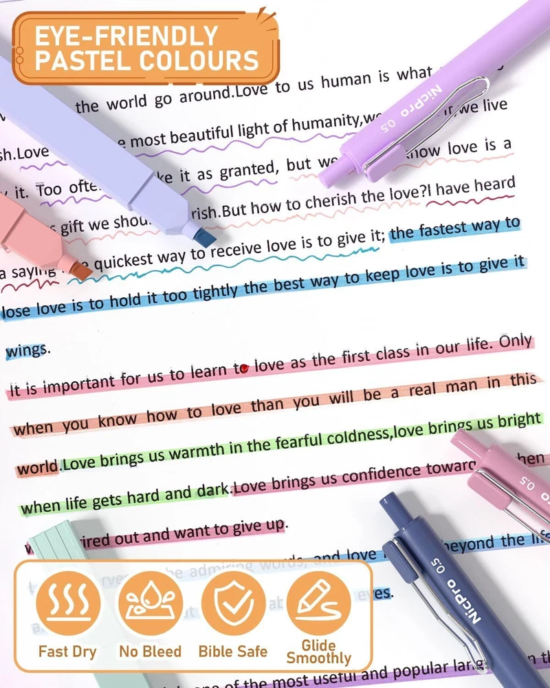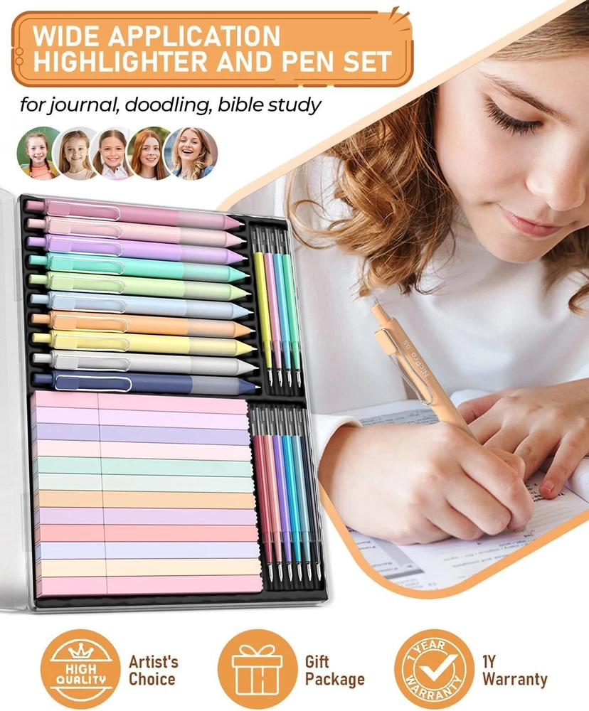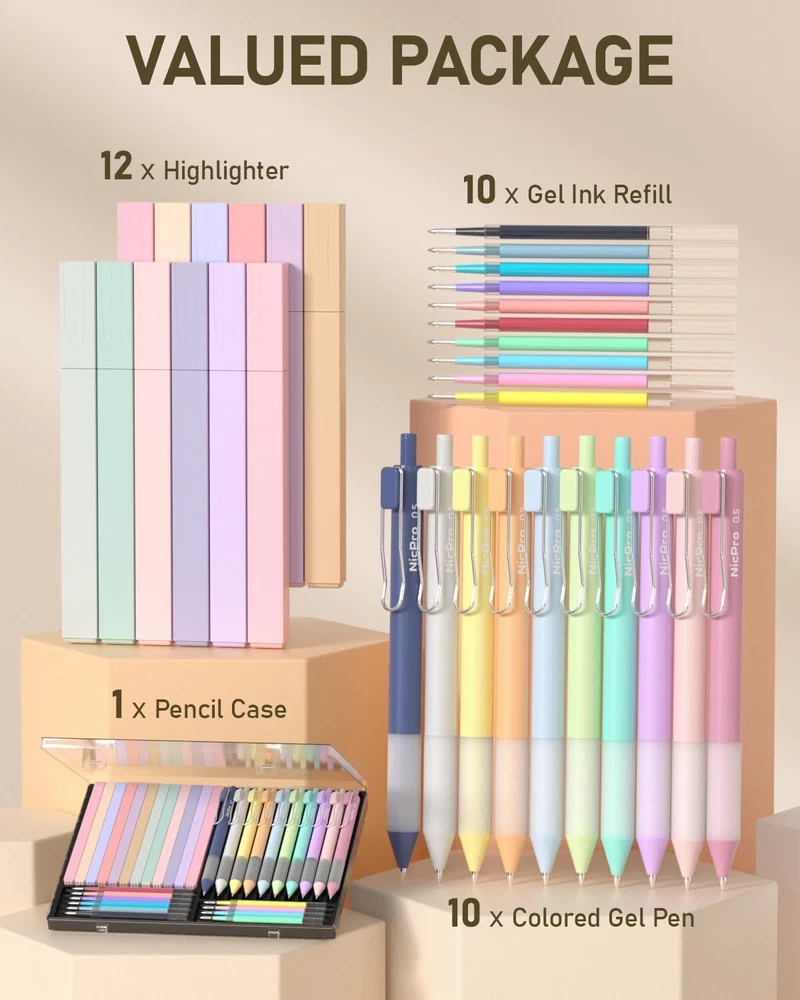 Nicpro 33PCS Aesthetic Highlighter and Gel Pen 5 Count (Pack of 4), Pastel Product Details Manufacturer: NICPRO CO.,LTD Brand: Nicpro Item Weight: 12.3 ounces Package Dimensions: 9.72 x 7.05 x 0.75 inches Color: Pastel Closure: Snap Material Type: Plastic Number of Items: 4 Size: 5 Count (Pack of 4) Point Type: Fine Line Size: 0.5mm Ink Color: Multicolor Manufacturer Part Number: MG679 Brand: Nicpro Ink Color: Multicolor Number of Items: 4 Point Type: Fine Recommended Uses For Product: Office Assorted Colors Pen and Highlighter Set:This gel pen set Includes 12 pack bible highlighters, 10 Pack aesthetic pens. In addition, we also come with 10 extra colorful refills that can be replaced Fast Dry and No Bleed: Nicpro pastel ink pens dries faster than many other types of ink, which is keep your work stays smudge-free, no blood and resists smearing. Ideal for left-handed individuals or anyone who tends to drag their hand across the page while writing Smooth Writing Pens:Each bible pens with premium ink delivers skip free glides all the time. perfect for detailed artwork, coloring, writing. And the planner pens with soft rubber grip for a comfortable writing experience Vibrant Colours:This color ink pens with Morandi colour design. Soft pastel colors. Not only group notes and keep organized easily, it's also give you more fun in daily life and make you feel relaxed Wide Application:The aesthetic pens and highlighter set is Ideals for student daily writing, color coding, planner, journal, doodling, memorizing your bible etc., in school, office and at home. A variety of colorful pens all in a exquisite box, also is an ideal back-to-school gift for girls and friends