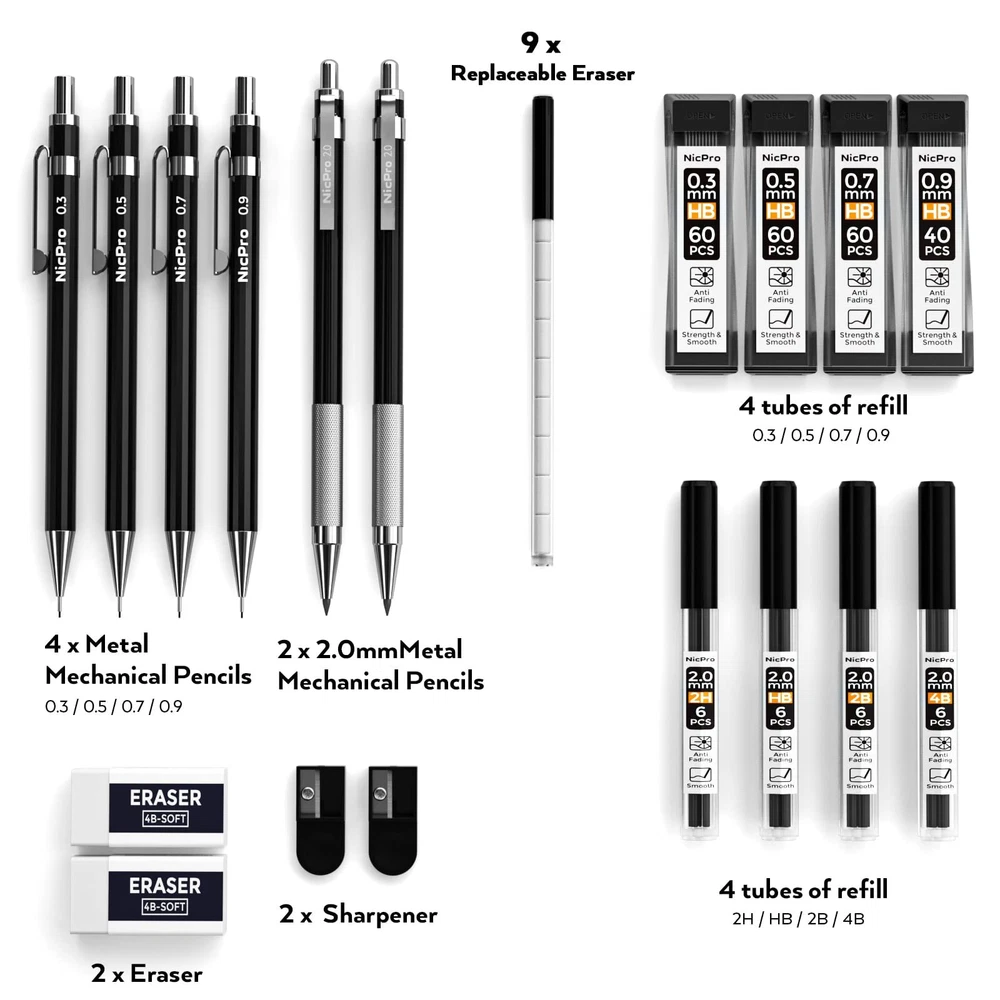 Package Included 0.3 mm mechanical pencil x 1 0.5 mm mechanical pencil x 1 0.7 mm mechanical pencil x 1 0.9 mm mechanical pencil x 1 2mm mechanical pencil x 2 4 tube HB lead refills (0.3mm/0.5mm/0.7mm/0.9mm) 4 tube 2mm lead refills(2H HB 2B 4B) 4B soft eraser x 2 lead sharpener x 2 cap eraser replacement x 9 Durable Metal Body: The full-brass metal body provides ideal weight balance for fatigue-free writing and drawing. Versatile Tip Sizes: Comes with 4mm mechanical pencils with 0.3mm, 0.5mm, 0.7mm and 0.9mm tips for various line sizes. Lead Holder and Sharpener: Includes 2 metal threaded anti-skidding pen tubes with sharpeners for the 2.0mm lead. Erasers and Refills: Comes with 2 erasers and 8 refill tubes for the mechanical pencils. Ideal for Artists and Students: Perfect for writing, drawing, sketching, drafting and more for artists, professionals, teachers and students.