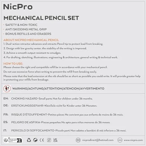 Come with 6 PCS drafting pencils and 8 tubes of lead refill in 0.3mm 0.5 mm & 0.7mm & 0.9mm (HB) + 2.0 mm(4B, 2B, HB, 2H) carbon based , 2 pcs erasers, 9 pcs cap eraser refill, 2 lead sharpener, updated storage case packaging The full-brass metal body provides ideal weight balance for fatigue-free writing and drawing. It brings you more effective and high quality tasks. 4 PCS Mechanical Pencils : 4 mm tip length makes it ideal for use with rulers and templates, various line size (0.3 mm,0.5 mm,0.7 mm & 0.9 mm) satisfy your demand. Polygon shape of these mechanical writing pencils avoids sliding on drawing tables. In addition, the pencil is pre-loaded with a 90mm-lead. 2 PCS 2mm Lead Holder: Metal Threaded Anti-skidding pen tube with sharpener in the cap of 2.0 mm mechanical pencil, Extra 2pcs lead sharpener are also provided for the 2.0 lead to keep the fine point as they dull. Perfect School Supplies:Ideals for artists, professionals, teachers and students alike. Perfect for writing, drafting, drawing, sketching