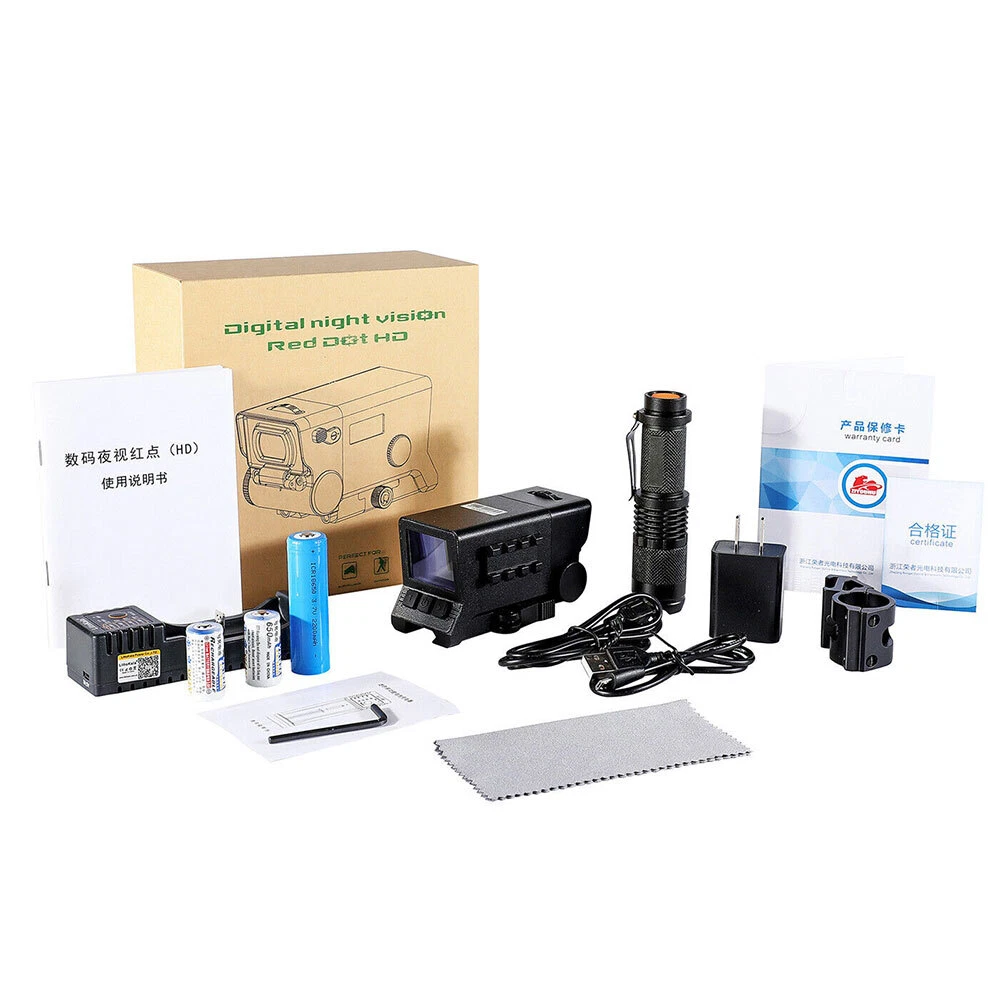 Product Description MS32 HD Night Vision Scope Description: ✔ The MS32 HD night vision scope is a rugged, reliable red dot sight that is at home in a variety of shooting applications. It allows the shooter to operate between 5 dot colors and 7 brightness settings to easily adjust for changing conditions. ✔ Fully multi-coated lenses provide a clean and bright, unobscured point of view. Unlimited eye relief allows for rapid target acquisition. Max Elevation Adjustment- 24Mil / 60MOA. Max Windage Adjustment- 32Mil / 80MOA. ✔ The single-piece chasis is compact and lightweight but still delivers shockproof performance withstanding both recoil and impact. Nitrogen purging and o-ring seals ensure fogproof and waterproof performance. ✔ High resolution MS32 HD is based on the latest optoelectronic technology research and development of new products. The night vision sight scope adopts the high-performance generation II/III image intensifier, with excellent performance, small szie, lightweight, clear imaging, easy operation, and high cost-effective. ✔ The MS32 HD tactical night vision scope has strong practicability and can be applied to military observation, coastal defense reconnaissance, public security surveillance, forensics, customs anti-smuggling, etc. in no illumination environment at night. ✔ Easy to connect to the scope. This is also a lightweight digital night vision scope attachment, which allows you to quickly and easily convert the day scope into an advanced night vision scope, which can be used for close and long-range hunting during the day or night. Features: ◆ This product integrates the digital zoom function: instantly shorten the distance with the shooting target; ◆ Video recording function: record every wonderful moment and share it with many people; ◆ A variety of reticle: close-range, medium-distance, reticle for various usage scenarios; ◆ A variety of reticle and colors: the type and color of the reticle can be selected according to personal preference and use environment; ◆BDC (Ballistic Assist Function): Quickly assist aiming, according to the measured target distance, operate the button, the system will automatically prompt the appropriate center assist aiming position; the upper right corner shows: give the calibration value for reference calibration; ◆Ranging: Turn on/off the ranging caliper, take the target with a height of 1.7 m as the reference object, and measure the distance from bottom to top according to the image of the target in the display screen; ◆Mil/MOA switch: It can be switched according to the habits of users in different countries; ◆Convenient calibration: After the first shot, move the center point of the reticle to coincide with the impact point to complete the calibration; ◆ Multi-language: built-in 7 languages, you can choose by yourself; ◆ Specifically designed for rifle and shotgun shooting: it can be mounted directly to a Picainny rail, also known as a fishbone, also known as a MIL-STD-1913 rail or STANAG 2324 rail, the night vision Aiming is IP67 waterproof grade; Specifications: TRD10 VS MS32 HD 1. This product is a night vision device for observing objects in dark or weak light, with infrared light, the distance beyond 250M can be observed in dark environment. 2. The objective lens of the MS32 HD night vision sight scope is 32mm, and the optical magnification is powerful 3.5X; 3. The display screen has been upgraded from the previous TFT to IPS, with higher definition and expressiveness; 4. The focusing method is knob-type focusing, which is easy to operate; 5. The waterproof level reaches IP67, which is suitable for various outdoor environments. Digital night vision rifle scope Hardware parameters model TRD10 MS32 HD sensor 1/3”CMOS Sensor 1.2M pixel 1288X968 1/3”CMOS 1288X968 Display screen 1.6 inch 640X480HD TFT 1.6 寸 640X480HD IPS Optical parameters Objective lens 20mm 32mm Magnification 1X 3.5X Field of view 7.4°×5.5° Video parameters Standard video resolution 1920x1080P/30fps , 1280X720P/30fps 1280X720P/30fps, 848x480P/30fps Video format MP4 MP4 Segmented video time 5 minutes/10 minutes/15 minutes/30 minutes 1 minutes/3 minutes/5 minutes/10 minutes Loop video Yes Yes Slideshow Yes Yes Memory Card 8GB 16GB Operation function boot time < 3s < 3s Digital zoom support digital continuous zoom, up to 7X 2-7 Lv Video recording Yes Yes Screen brightness adjustment Yes Yes Image color Yes, black&white/color/fluorescent green/brown four image colors Yes, black&white/color/fluorescent green/brown four image colors Reticle selection Yes, 5 kinds of reticle,can be closed Yes, 5 kinds of reticle,can be closed Reticle color black/blue/red/green/white black/blue/red/green/white Center calibration of reticle Yes Yes time setting Yes Yes language Six languages including Chinese and English Simplified Chinese, English and other six languages Electronic parameters Battery 16340/18350 Rechargeable Lithium Battery(3.7V) 16340/18350/CR123A rechargeable lithium battery (3.7V) Power Adapter 5V/2A 5V/2A Charging time Yes Yes Charging status indicator Yes Yes Battery life ≥3hour ≥3hour Battery indicator Yes Yes Battery reminder Yes Yes Shutdown timer Yes Yes Data interface Mini USB2.0 (charging/PC data connection) Mini USB2.0 (charging/PC data connection) Adjustment range MOA 1/4 MOA 0.2Mil / 0.5MOA Windage movement range 30 MOA 24Mil / 60MOA Elevation movement range 40 MOA 32Mil / 80MOA Environmental adaptability Operating temperature -40 ℃~ 55 ℃ -25℃~+55℃ Storage temperature -55 ℃~ 70 ℃ -55℃~70℃ Impact resistance >=600G >=600G waterproof level IP67 IP67 Other weight ≤300g ≤400g Dimensions 97×57×59mm 136×60×65mm Zoomable Focus IR850 nm LED Infrared Radiation IR Lamp Night Vision Flashlight : Torch: INVISIBLE IR LIGHT: Emits infrared light with 850 nm wavelength, Suitable to use with a night vision scope, NVS, NVG DIY, camera phones, monocular, goggles and camera which doesn't block infra red li