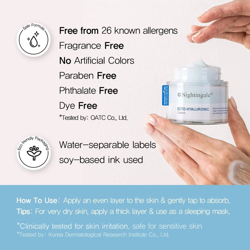 Nightingale Ecto-Hyaluronic Cream with 8 layer Hyaluronic Acid, Ectoin, Daily Face Moisturizer For Dry Skin, Fragrance Free, Hypoallergenic, Allergen Free, Cruelty Free, Vegan, Korean Skin Care - Buy Now with Fast Shipping! Nightingale Ecto-Hyaluronic Cream with 8 layer Hyaluronic Acid, Ectoin, Daily Face Moisturizer For Dry Skin, Fragrance Free, Hypoallergenic, Allergen Free, Cruelty Free, Vegan, Korean Skin Care Product Details Brand: Nightingale Item Volume: 100 Milliliters Item dimensions L x W x H: 1.57 x 1.57 x 1.57 inches Age Range (Description): 어른 Special Feature: Hypoallergenic Product Dimensions : 1.57 x 1.57 x 1.57 inches; 1.76 Pounds Item model number : 200189000 Manufacturer : Nightingale Key Features ✅ [Clinically Proven to Boost Skin Hydration] Proven through clinical testing to enhance moisture levels both deep within the skin (inner hydration) and on its surface (outer hydration), ensuring all-day hydration and a healthy glow. ✅ [Deep Hydration & Moisture Barrier] The 8-layered hyaluronic acid moisture-locking system provides deep hydration, while Ectoin, a natural stress-protective molecule, creates a moisture barrier to enhance retention, keeping skin hydrated for hours. ✅ [Clear and Hydrated Skin] Enriched with 42.3% birch sap, rich in amino acids and minerals, to refresh and hydrate the skin, improving clarity and moisture. Patented soothing and moisturizing ingredients help relieve dry skin. ✅ [Rapid Calming] Contains Centella Asiatica extract, allantoin, and xylitol, known for their excellent soothing properties. Helps quickly calm irritated and flushed skin, reducing redness and restoring the skin to a healthy state. ✅ [100% Vegan & Clinically Tested] Clinically proven to improve double moisture retention. Certified vegan cosmetic with no animal ingredients or testing. Allergen-free, fragrance-free, paraben-free, sulfate-free, and cruelty-free formula, suitable for sensitive skin. Product Description