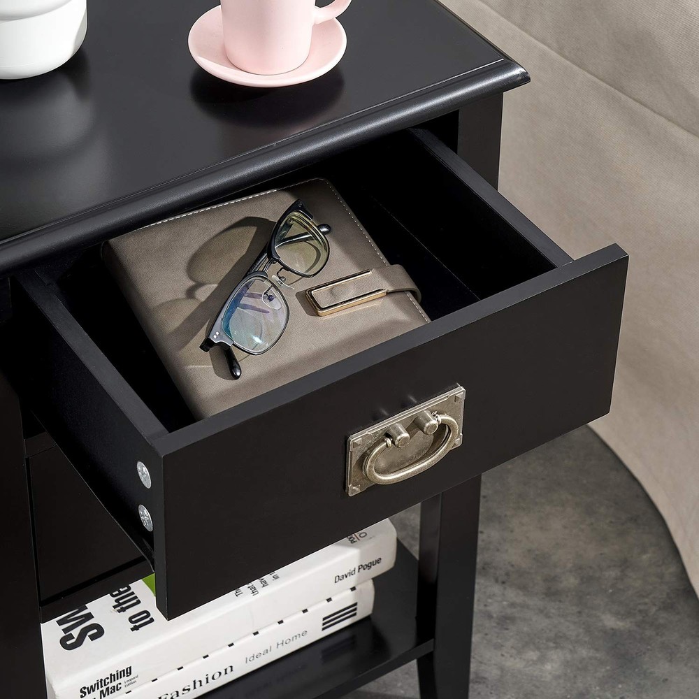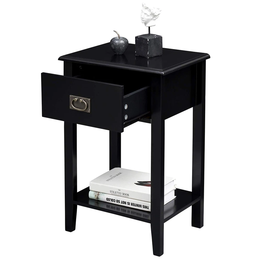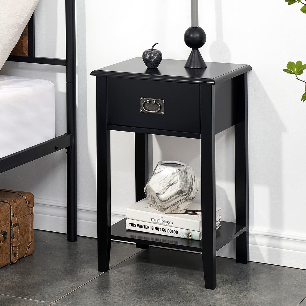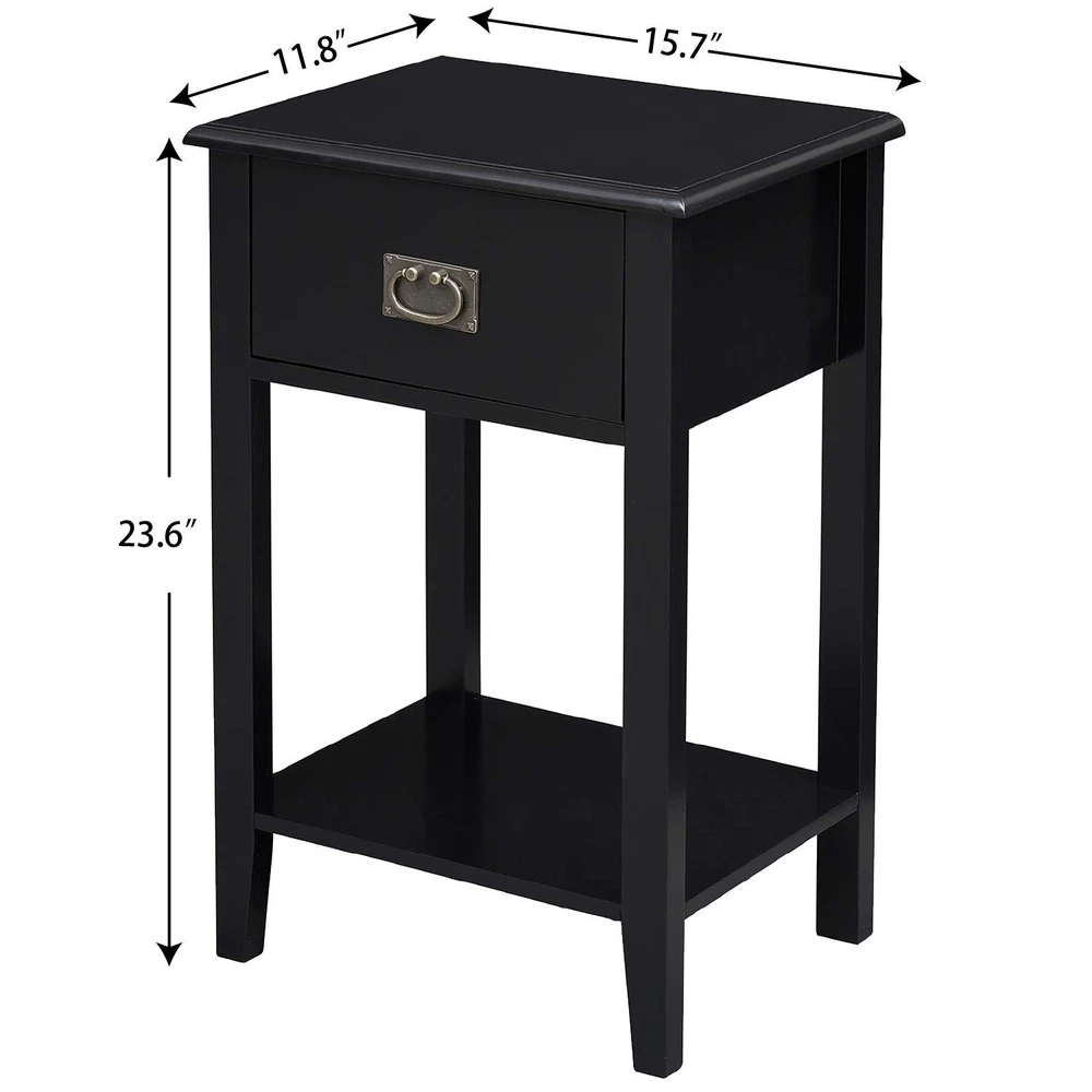 Material : Engineered Wood. No assembly required [Try Some New Chic] - New traditional end table with unmatched style is accented by sophisticated design for a bold elegant look. [Versatile] - The nightstand is perfectly fit next to your bed, sofa or set in the hallway. Add a fresh feeling to any room, ideal for any furniture, diverse home decoration and most interior style. [Ample Storage Space] - This nightstand inside and out is black painted for a complete look. Smooth running drawer provides sufficient storage space, round ring handle for easy pulled out. [Remarkable Durability] - Craft with E-1 grade high-quality MDF board and solid wood splicing. Waterproof & wearable top is easy to clean and ensure years of use.