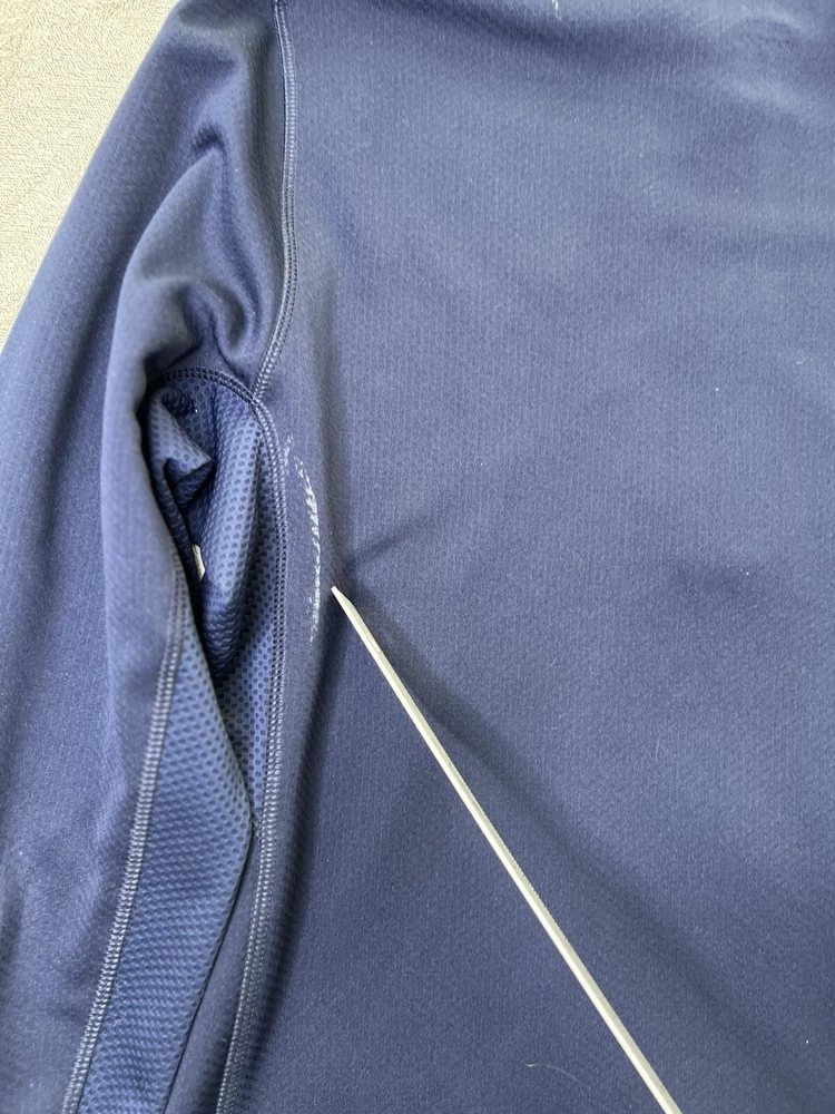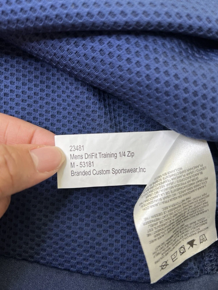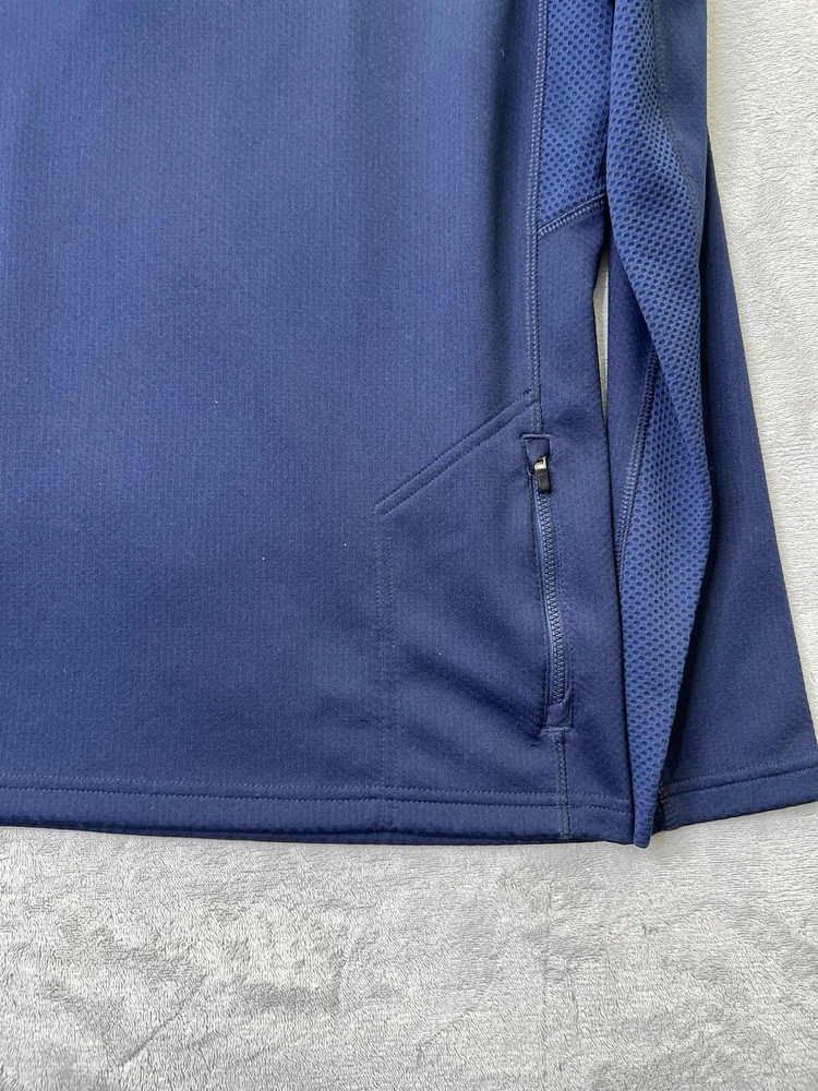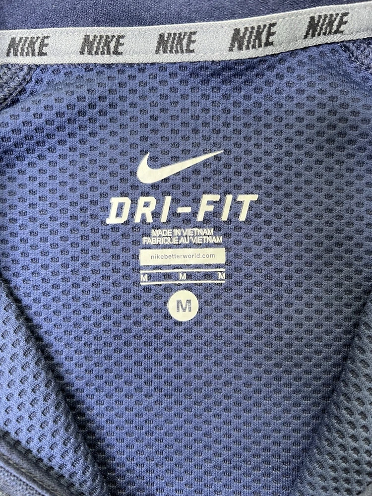 This Nike ACG Dri-Fit ADV pullover is a men's medium size with a half-zip closure and mock neck design. Featuring a USA Olympic Team graphic print and embroidered accents, this pullover is suitable for activewear during fall, winter, and spring seasons. The blue pullover is made of a blended fabric of polyester and wool, with thumb hole sleeves for added functionality. Perfect for activities like cycling, golf, cross-training, and running, this Nike Dri-FIT pullover embodies a patriotic USA theme with its design.