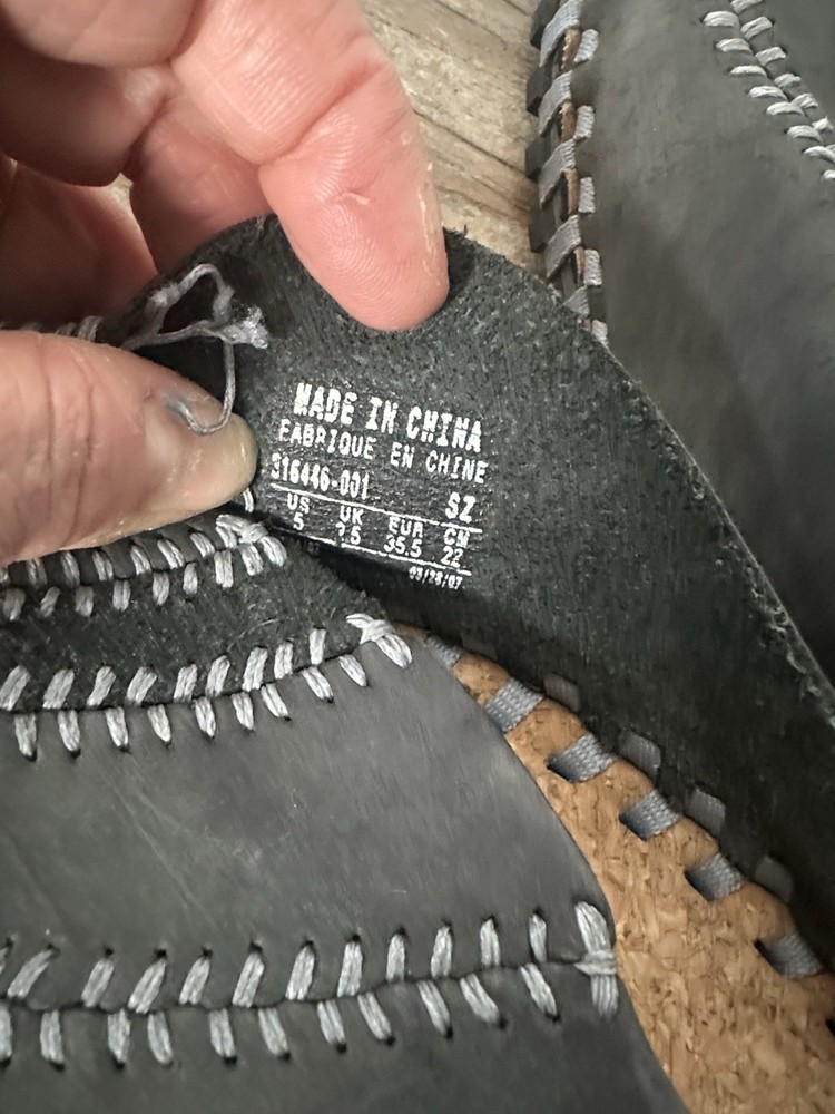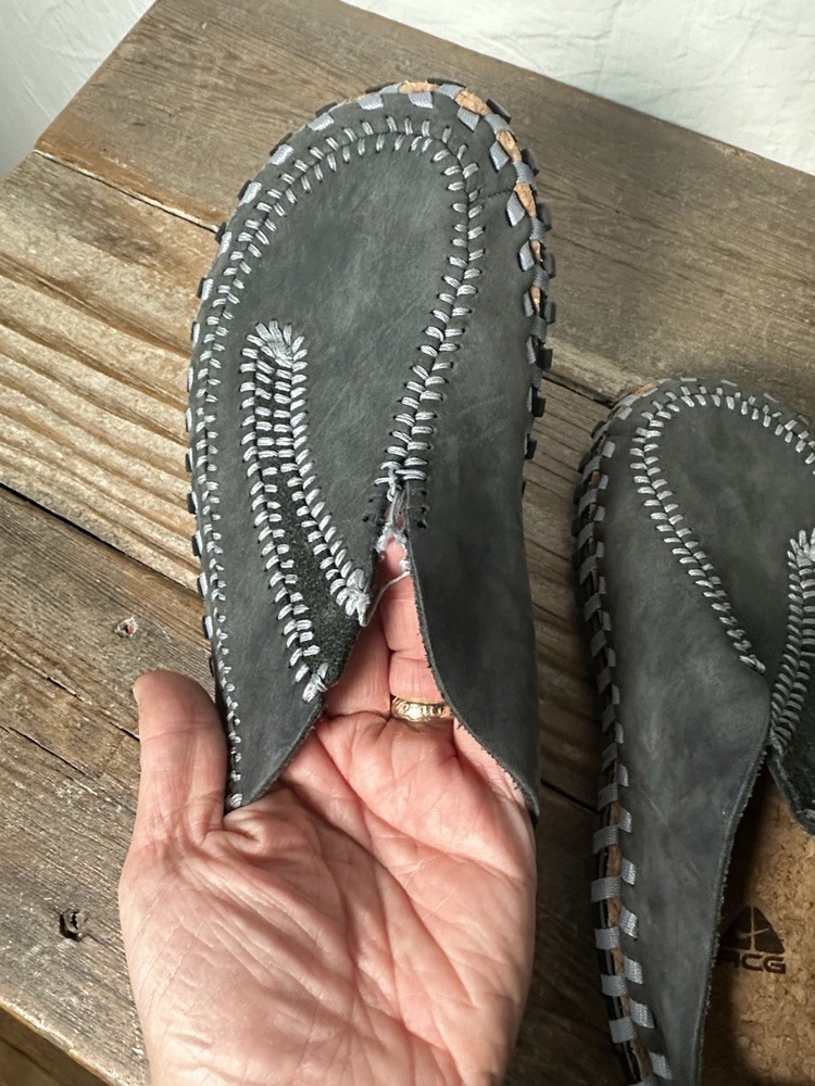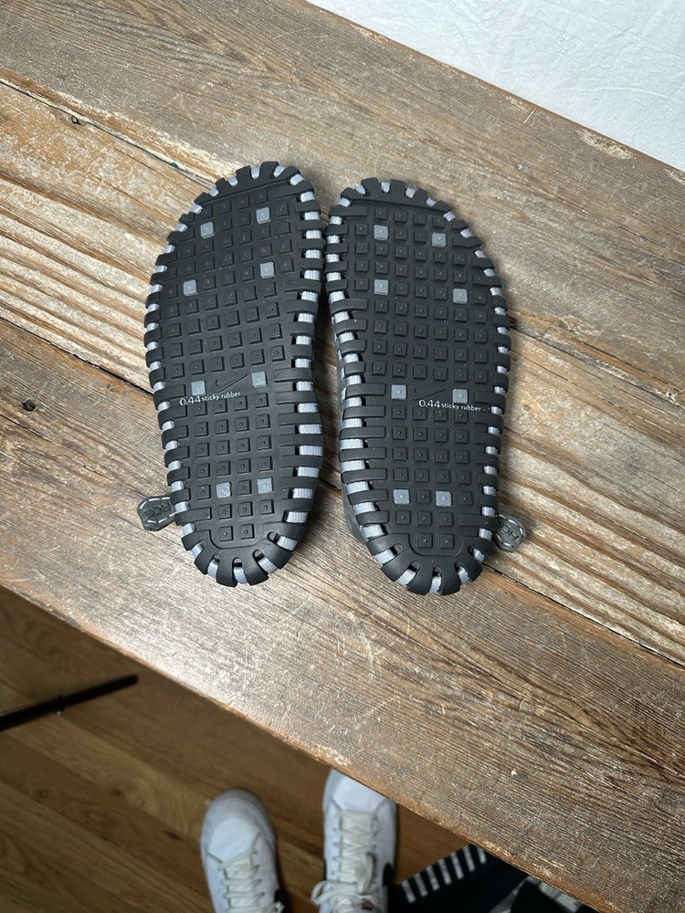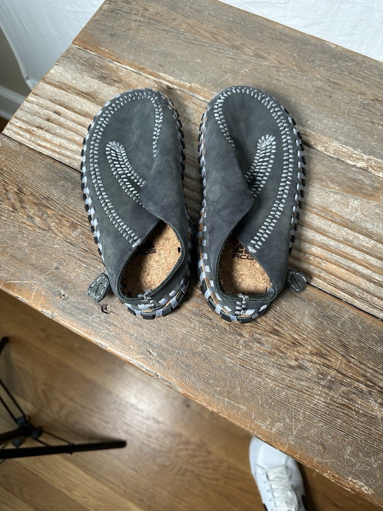 The Nike ACG Gray & Blue Considered Longball Leather Slip-On Shoe is a stylish and comfortable slipper for boys in size 5. The shoes feature a slip-on style with a durable leather construction, making them easy to put on and designed to last. With the iconic Nike ACG branding and a vibrant blue color, these shoes are both practical and trendy for active kids on the go. Perfect for casual wear or as a sporty option, these shoes are sure to be a staple in any young boy's wardrobe. Left shoe has some unraveling. See pic.