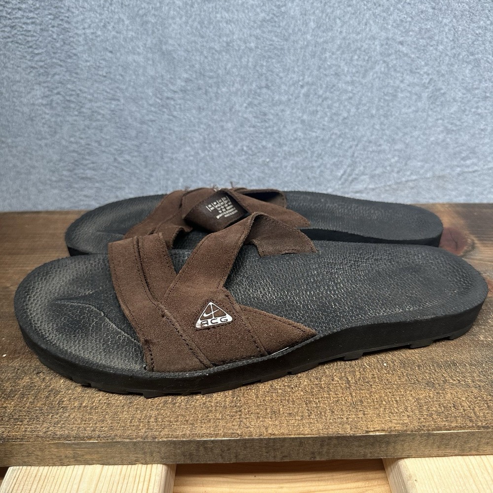 Slip into comfort with the Nike ACG Grind Slide, a perfect blend of style and ease for the active man. These size 12 sport sandals feature a solid brown color with black accents, complemented by the iconic Nike ACG design. Crafted with a durable leather upper and a comfortable synthetic insole, these sandals are tailored for everyday wear and outdoor adventures alike. The Nike ACG Grind Slide boasts a convenient slip-on closure, allowing for quick and effortless on-and-off. Ideal for sports enthusiasts and those who love colorful thematic designs, these sandals are a versatile addition to any wardrobe. The synthetic outsole provides long-lasting wear, making them a reliable choice for any activity that comes your way. In used condition with typical signs of wear. Any serious flaws or issues will be shown in the photos.