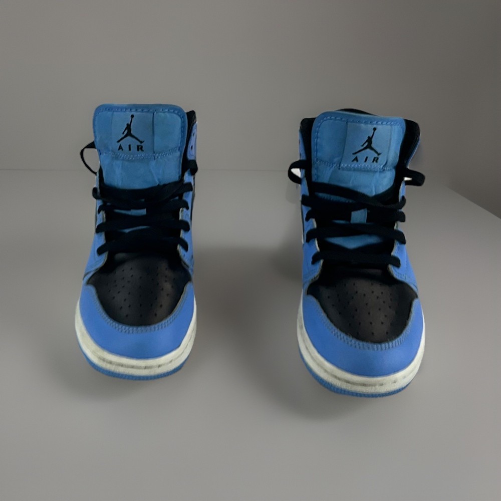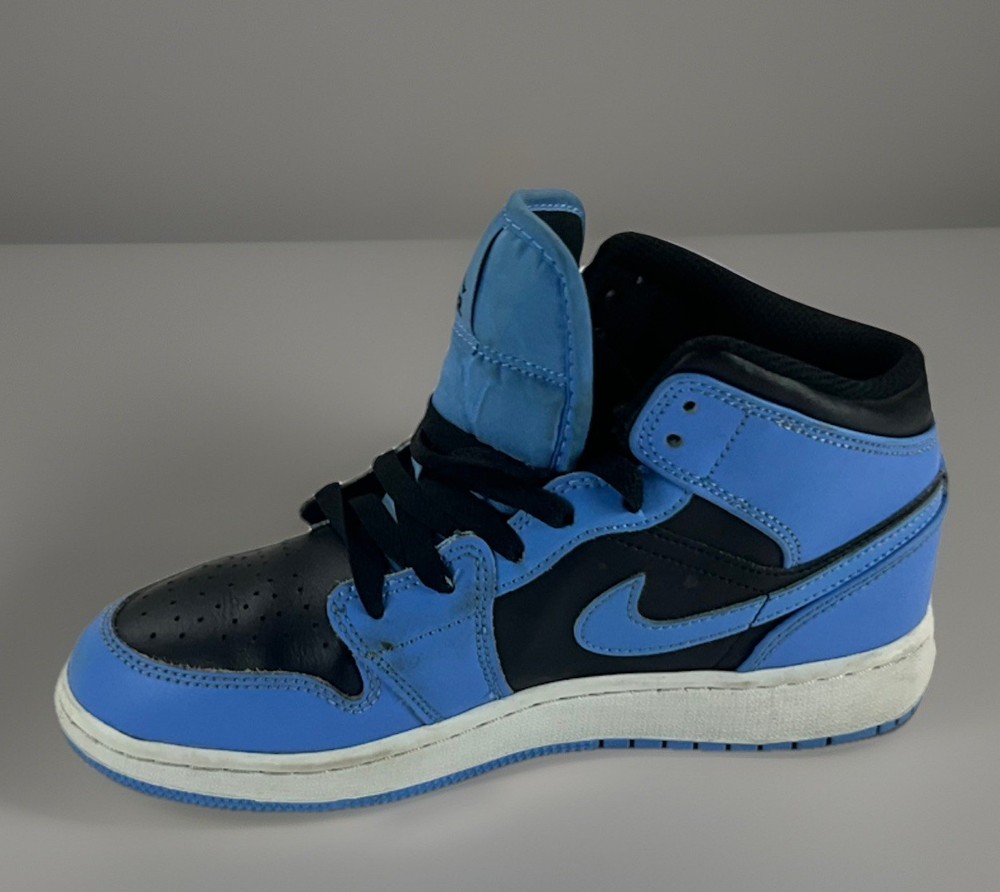 The Nike Air Jordan 1 Mid University Blue Black DQ8423-401 Youth Size 5Y is a stylish and comfortable sneaker designed for boys. With a lace-up closure and mid-top shoe shaft style, these sneakers feature a colorblock pattern in blue with the iconic Jordan character. Made with leather upper material and a rubber outsole, these athletic shoes are perfect for travel, activewear, and casual occasions. Additionally, the Air Jordan 1 Mid model offers adjustable features and is part of the Nike Air product line, making it a great choice for gym & training, walking, and school activities.
