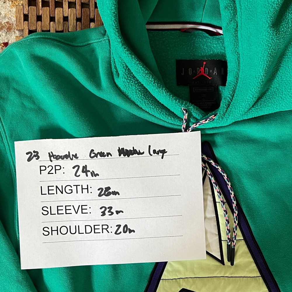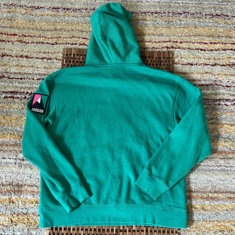The Nike Air Jordan Green Graphic Print Hoodie is a stylish and comfortable pullover designed for men in size large. Made of soft cotton fleece material, this hoodie features a solid green color and a crew neck with long sleeves. It is perfect for sports enthusiasts, particularly basketball players, and can be worn during the winter, fall, or spring seasons. The hoodie also includes a hood for added warmth and is easy to care for with machine washable fabric. Perfect for casual wear or athletic activities, this Nike Air Jordan hoodie combines style and functionality in one.