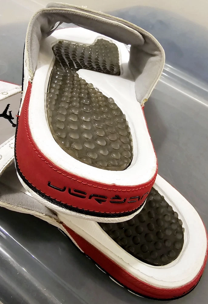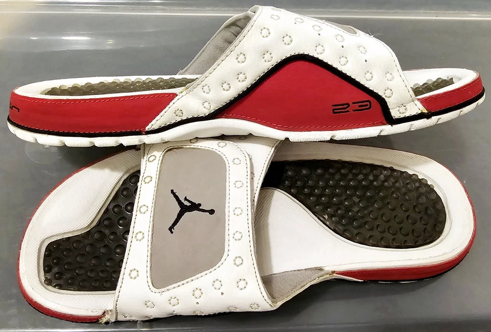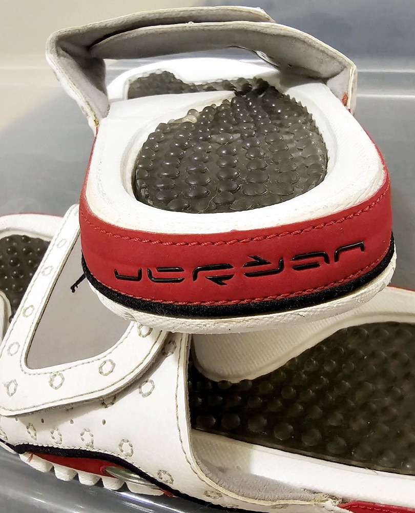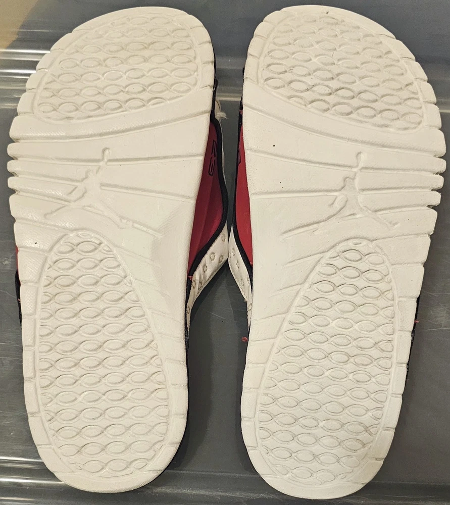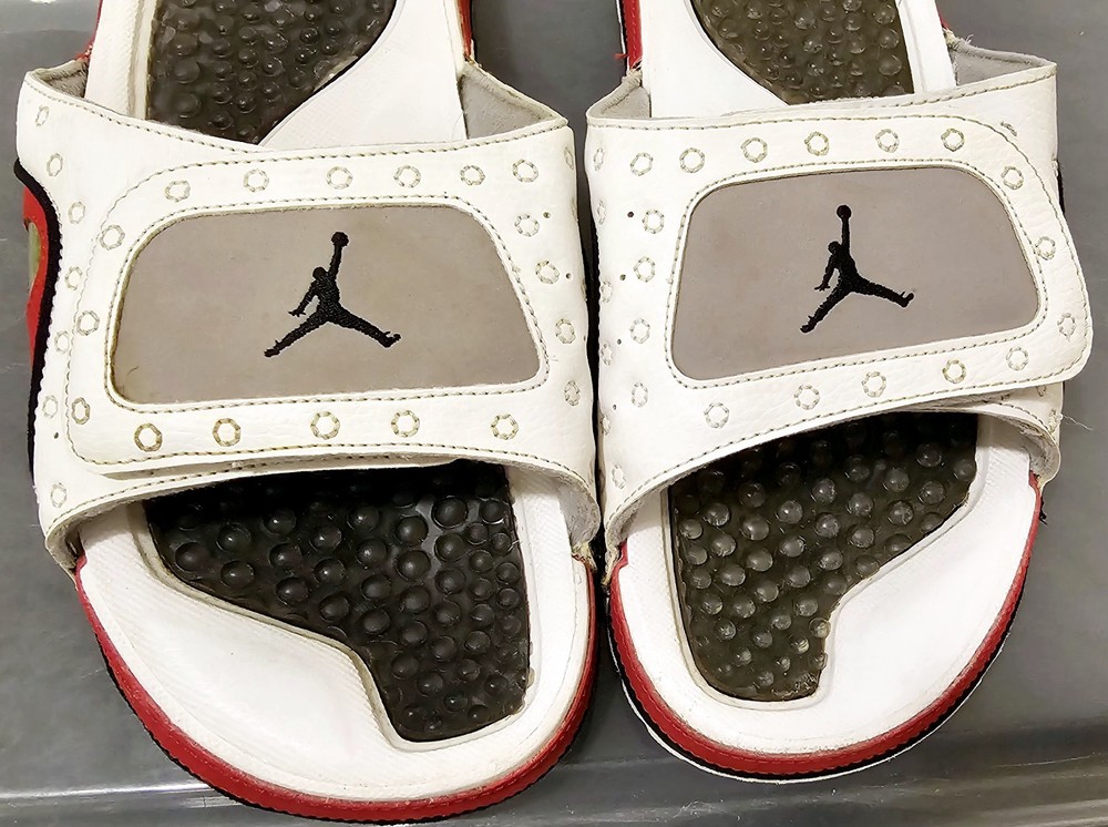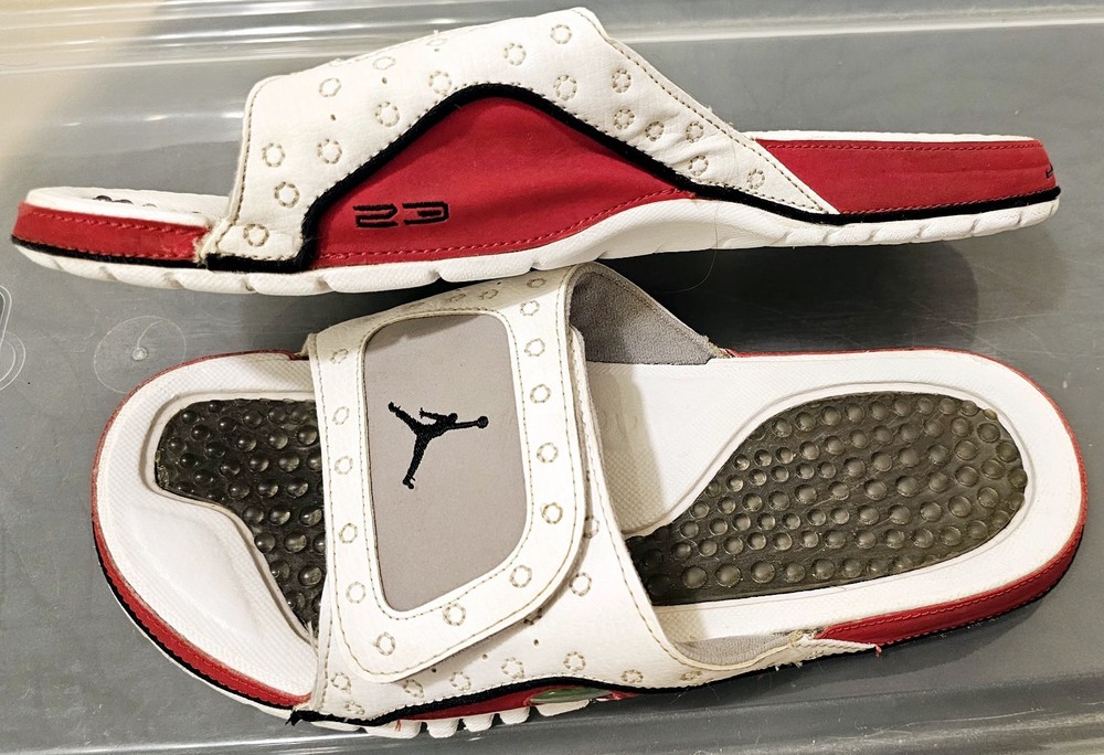 The NIKE AIR JORDAN HYDRO XIII 13 RETRO Men's Slides in White/Red are a highly sought-after and rare pair of sandals featuring the iconic Jordan Jumpman logo. These slip-on slides are perfect for casual or activewear occasions, with a solid pattern and adjustable strap for a comfortable fit. Made with synthetic material and a rubber insole, these retro-themed slides are a stylish addition to any slide collection, combining the classic Air Jordan product line with a modern twist on the slide style.