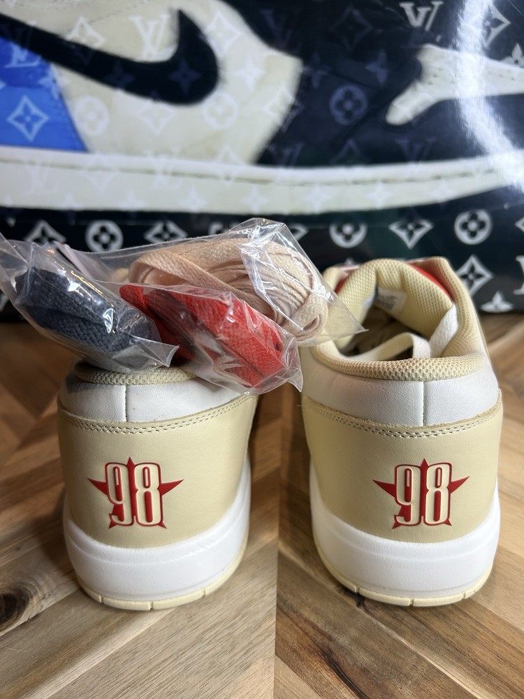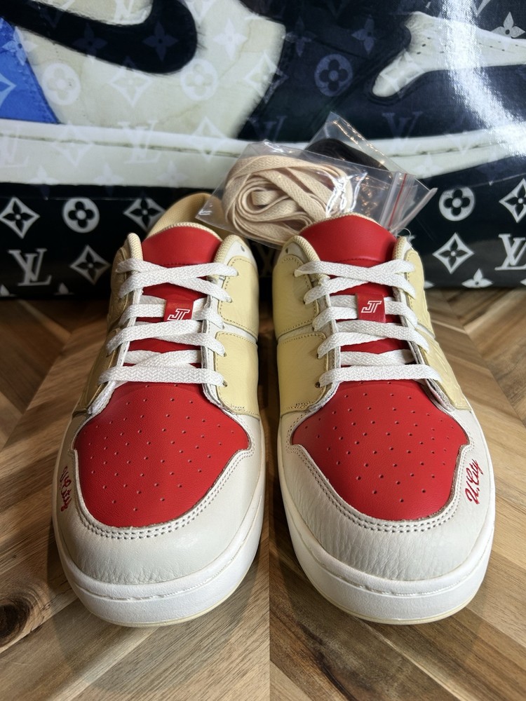 Elevate your sneaker game with these Nike Air Jordan Nu Retro 1 Low x Jayson Tatum PE shoes. The ivory and red leather upper material is complemented by the cushioned insole and foam outsole for maximum comfort during walking or basketball. These athletic shoes are perfect for both casual and activewear occasions, and their lace-up closure ensures a secure fit. The Jordan 1 Low Red silhouette adds a touch of style to these sneakers, making them suitable for all seasons. With a standard shoe width and a US shoe size of 12, these shoes are a rare find for sneaker collectors and enthusiasts alike. The shoes are part of the Jordan product line and are manufactured in Vietnam.