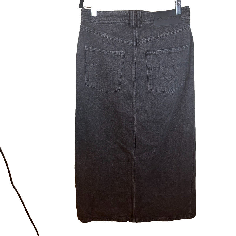 Brand: Nike Air Jordan Size: Small Features: Button Front Front Slit Back Patch Logo Midi Length 100% Cotton Vintage Black Denim Wash Condition: Preowned excellent condition. No rips/stains/holes Approximate Measurements pictured in the last photo. Please compare these to similiar items you own to ensure proper fit. Preowned items are cleaned to industry standards. They may have smell of detergent/fabric softener All new items may be stored with preowned items that have been washed or have a scent. New items may have a scent of other items/detergent *Items stored in a non smoking environment but pet friendly home