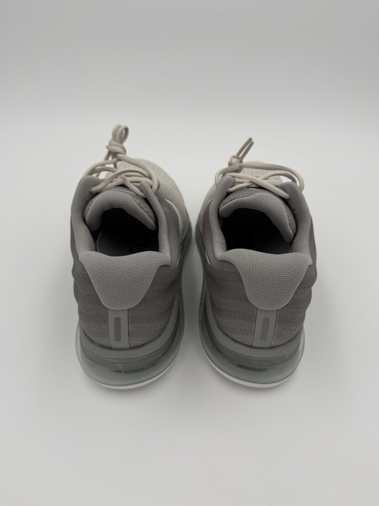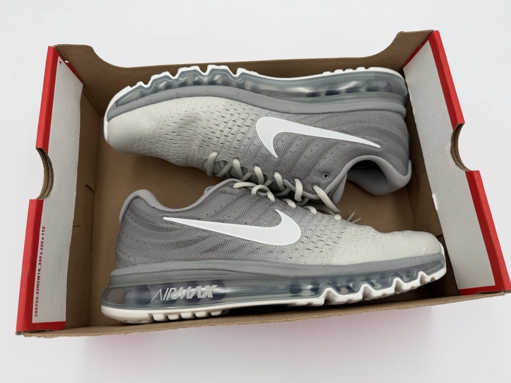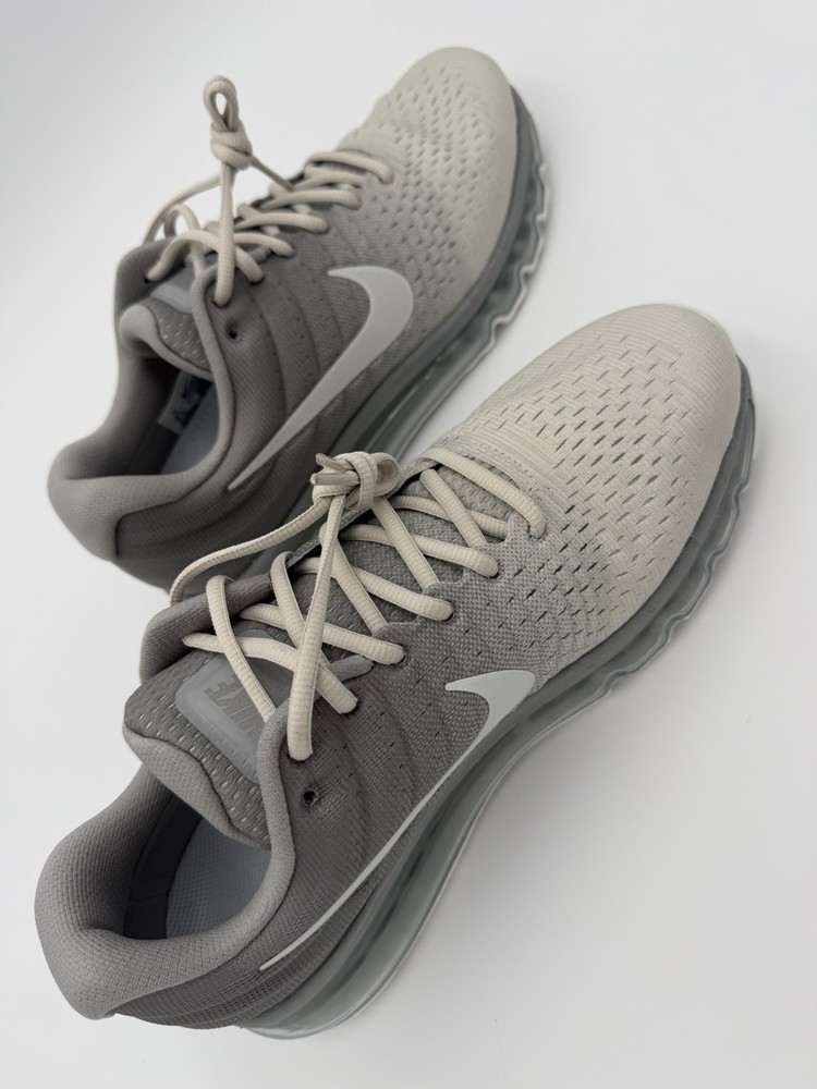 NIKE Air Max 2017 running shoes featuring the iconic full length visible Air unit for maximum cushioning and smooth comfort. Sleek Light Bone and Platinum colorway makes these perfect for workouts or everyday athleisure style. • NIKE Air Max 2017 Running Shoes Womens 9 • Engineered mesh upper with full length Air Max cushioning • Light Bone and Platinum Grey with white swoosh • Lace up athletic fit with padded collar, excellent pre owned condition • Full length visible Air unit with durable rubber outsole