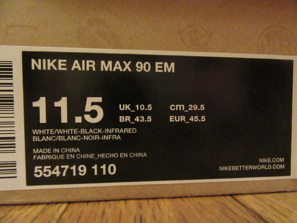 Nike Air Max 90 EM Men's Size: 11.5 Colorway: White/White-Black-Infrared Stylecode: 554719 110 Condition: New In Box 2013 Release About: PRESTO WORLDWIDE (ebay user ID: presto2005) Over 20 Years on eBay & Over 10,000 Successful Transactions! - Presto2005 only sells 100% authentic merchandise. - All items are purchased from 100% authorized retailers or the manufacturers directly (All Supreme items are purchased directly from Supreme on their online store or in one of their few retail stores -Additional items not listed or pictured such as receipts, bags or stickers are not included! Presto2005 has completed tens of thousands of successful transactions. You can purchase with confidence as we take pride in our business. Check out our Feedback if you have any reservations. Presto2005 has been collecting, buying and selling 100% authentic fashion, footwear, streetwear, collectibles, memorabilia and more since the early 1990’s. Please be sure to regularly visit our store as new items are frequently added to our inventory of over 1,000 items. SHIPPING POLICY: - All orders will be shipped out within 2 business days of the purchase (usually sooner) - We only ship to the address provided by eBay. No Exceptions! - We take extra measures to package your item securely and neatly to protect your merchandise. - You can track your package online with the tracking number provided to you through eBay that will upload automatically once we process it. - Please be sure your shipping address is up to date and accurate. INTERNATIONAL BUYERS: - We only ship overseas through eBays INTERNATIONAL SHIPPING PROGRAM. If you are not a part of this program or your country is not eligible you will not be able to complete the transaction. - We do not ship directly overseas. All items would ship through the ebay International Shipping Program *** Additional shipping charges through this program are regulated by eBay. These fees are not something we can change or negotiate. *** PAYMENT: - Approved eBay payment methods only! Please check out the other items in our store: https://www.ebay.com/str/PRESTO-WORLDWIDE?_trksid=p2047675.l2563 Don't forget to email us any questions you may have - we are more than happy to help! Thank you again for shopping with Presto2005!