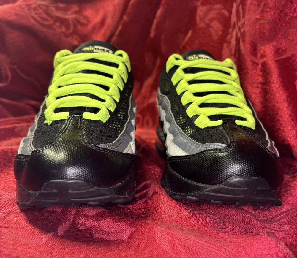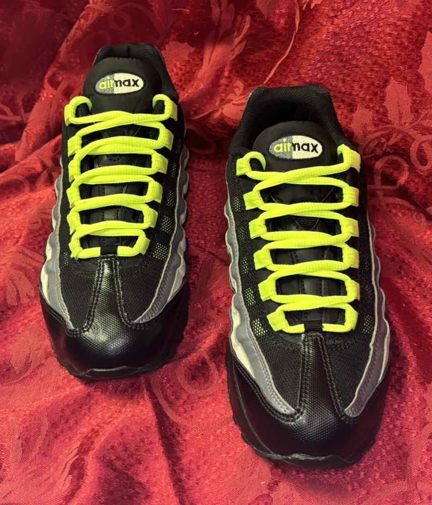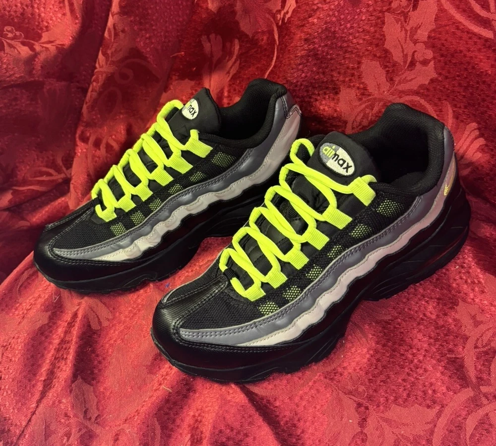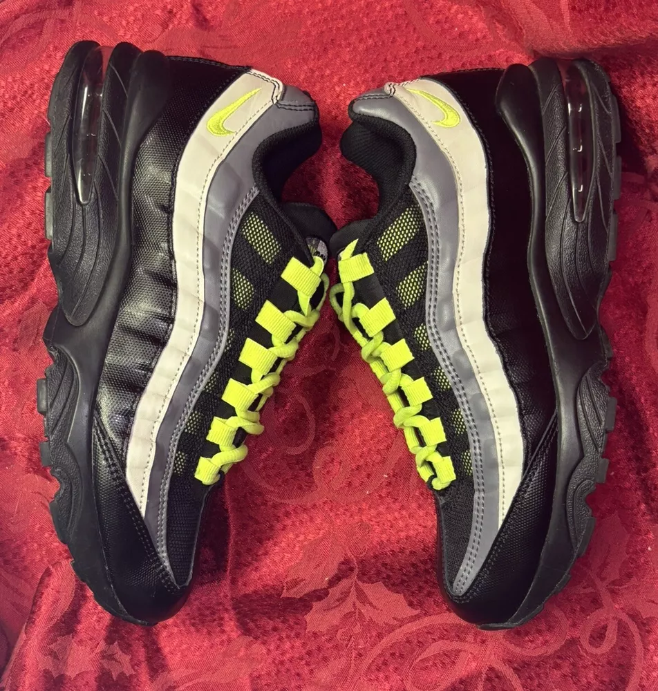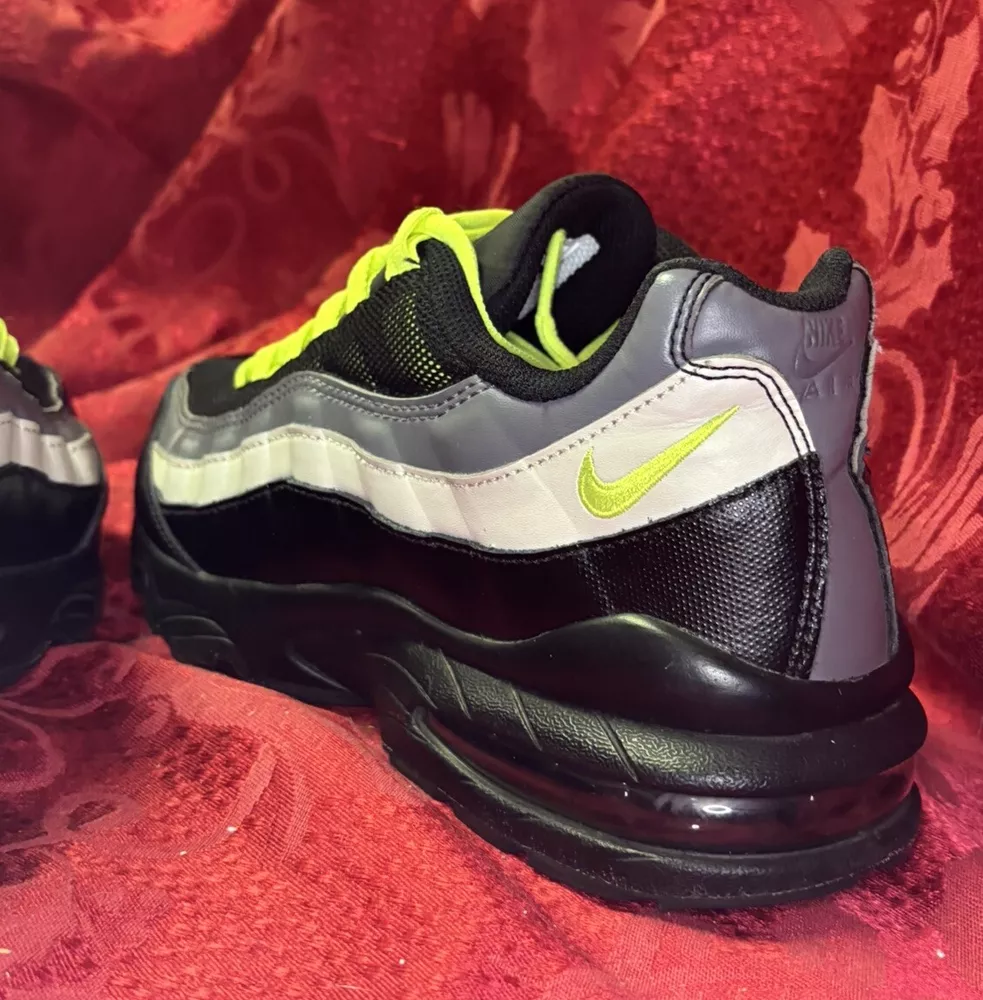 The sneakers in the pictures are the exact pair the buyer will receive. They are listed as New Other because the box was discarded and the store label is still on the bottom of the sole as you will see in the pictures. Please check out the pics and if you have questions please ask. Product Description: Nike Air Max 95 GS Black Volt & Dark Gray Sneakers Shoes, Style 905348-022, Size 7Y Product Information: A Shoe That Equals Fashion! There isn't a shoe more notable in style than the Nike Grade School (GS) Air Max 95. These kicks feature wavy lines that're bold and eye-catching, offering a modern and urban look. Not only do the unique lines draw your eyes to these Nikes, but the classic-yet-subtle Nike Swoosh also ensures instant brand recognition. The blend of materials adds to the complexity of appearance, while the waffle-patterned outsole creates a classic sneaker look. From a casual day at the park to a presentation during class, these shoes offer confidence, inspiration, and design for all. Nike Provides True Comfort A shoe is far more than a fashion statement, it is also a vehicle of support and comfort for the active kid. These Nikes offer everything you’d expect from the modern sneaker. With breathable uppers, these shoes keep feet comfortable throughout the day, and Air Sole units provide ultimate support and cushioning in every step. Durable materials across the shoe ensure that the Air Max 95 holds up to everyday wear. Find out why Nike is an iconic name for young and old when you snag a pair of Nike Air Max 95s for your grade schooler. Nike Grade School Air Max 95 features: Blend of synthetic leather, mesh, suede, and leather creates a supportive upper. Durable polyurethane midsoles paired with Air Sole® units for springy support. Strong BRS 1000® carbon rubber outsoles use waffle pattern for excellent footing.