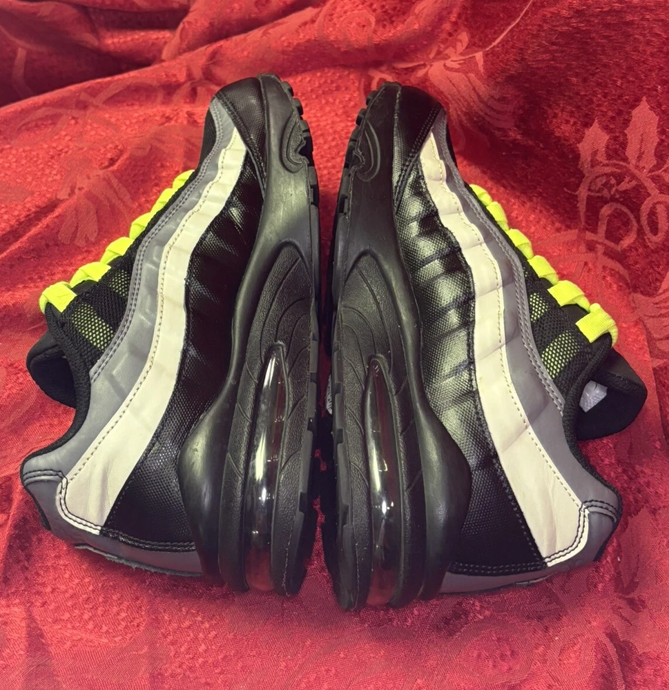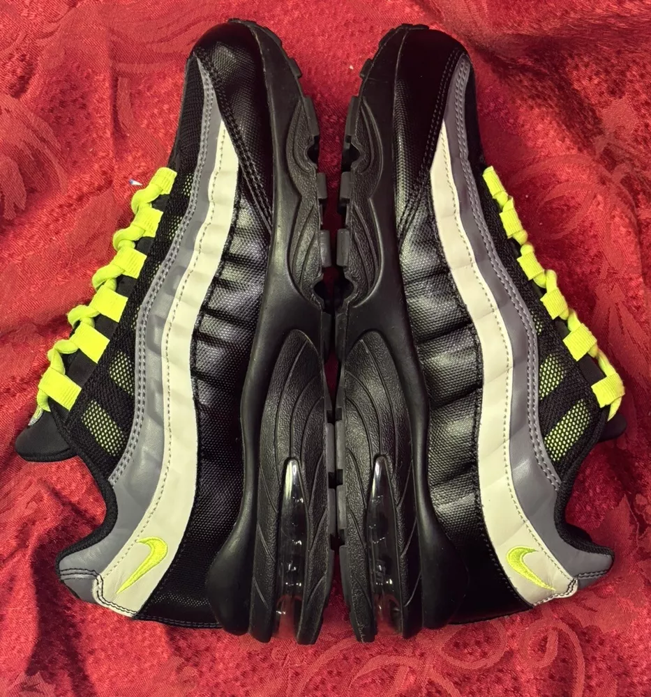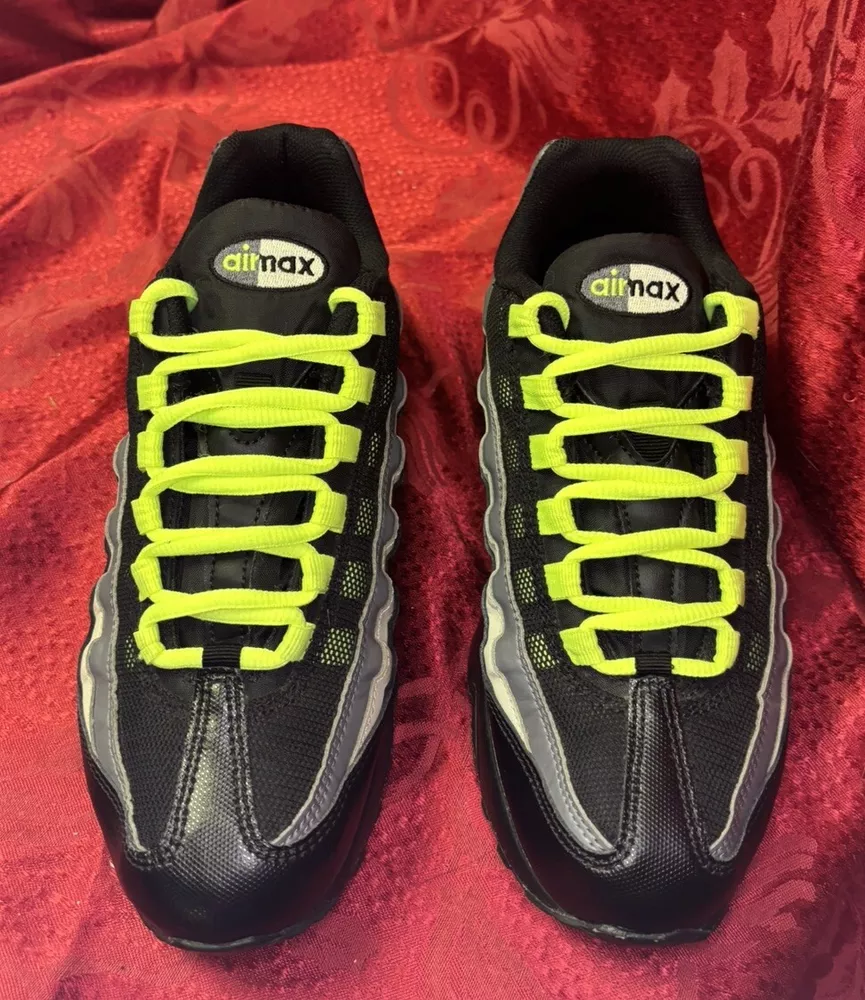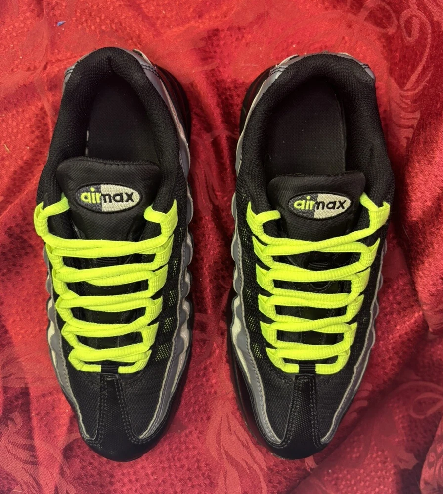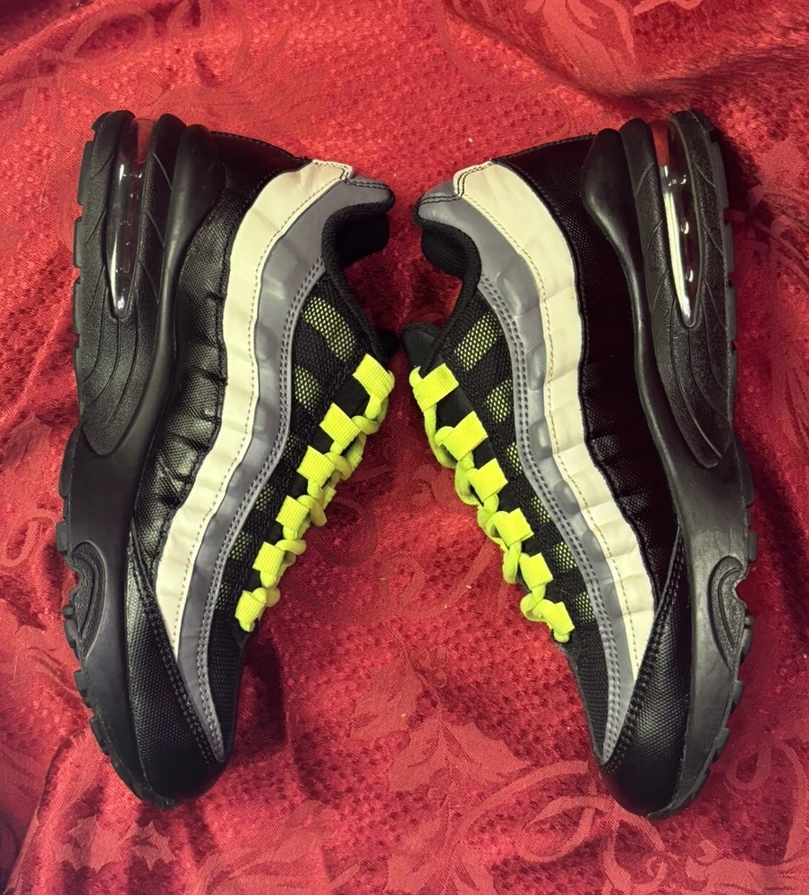 The sneakers in the pictures are the exact pair the buyer will receive. They are listed as New Other because the box was discarded and the store label is still on the bottom of the sole as you will see in the pictures. Please check out the pics and if you have questions please ask. Product Description: Nike Air Max 95 GS Black Volt & Dark Gray Sneakers Shoes, Style 905348-022, Size 7Y Product Information: A Shoe That Equals Fashion! There isn't a shoe more notable in style than the Nike Grade School (GS) Air Max 95. These kicks feature wavy lines that're bold and eye-catching, offering a modern and urban look. Not only do the unique lines draw your eyes to these Nikes, but the classic-yet-subtle Nike Swoosh also ensures instant brand recognition. The blend of materials adds to the complexity of appearance, while the waffle-patterned outsole creates a classic sneaker look. From a casual day at the park to a presentation during class, these shoes offer confidence, inspiration, and design for all. Nike Provides True Comfort A shoe is far more than a fashion statement, it is also a vehicle of support and comfort for the active kid. These Nikes offer everything you’d expect from the modern sneaker. With breathable uppers, these shoes keep feet comfortable throughout the day, and Air Sole units provide ultimate support and cushioning in every step. Durable materials across the shoe ensure that the Air Max 95 holds up to everyday wear. Find out why Nike is an iconic name for young and old when you snag a pair of Nike Air Max 95s for your grade schooler. Nike Grade School Air Max 95 features: Blend of synthetic leather, mesh, suede, and leather creates a supportive upper. Durable polyurethane midsoles paired with Air Sole® units for springy support. Strong BRS 1000® carbon rubber outsoles use waffle pattern for excellent footing.