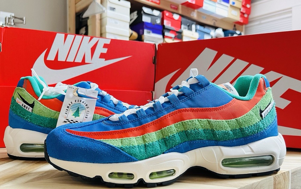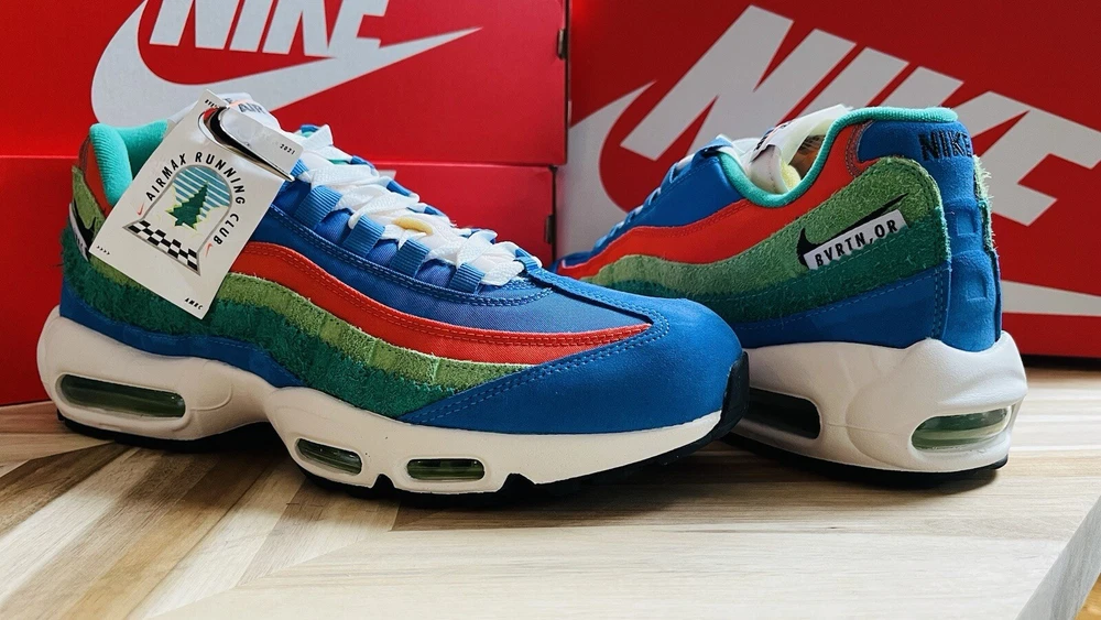 Nike Air Max 95 SE "Running Club" CPFM in size 12 features a multicolor design with Photo Blue and Roma Green accents. This limited edition sneaker, part of the Nike Air Max line, showcases a low-top silhouette with suede upper material, lace-up closure, and rubber outsole. The design is influenced by various themes such as USA, celebrity, college, and classic, making it a standout choice for those seeking comfort and performance in their athletic shoes.
