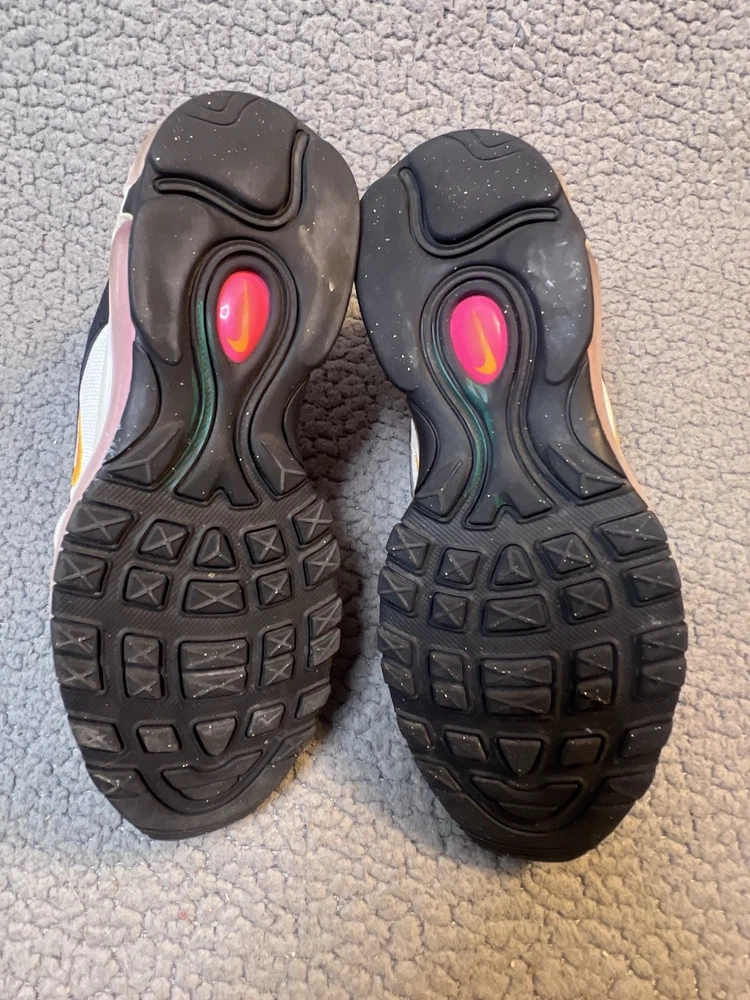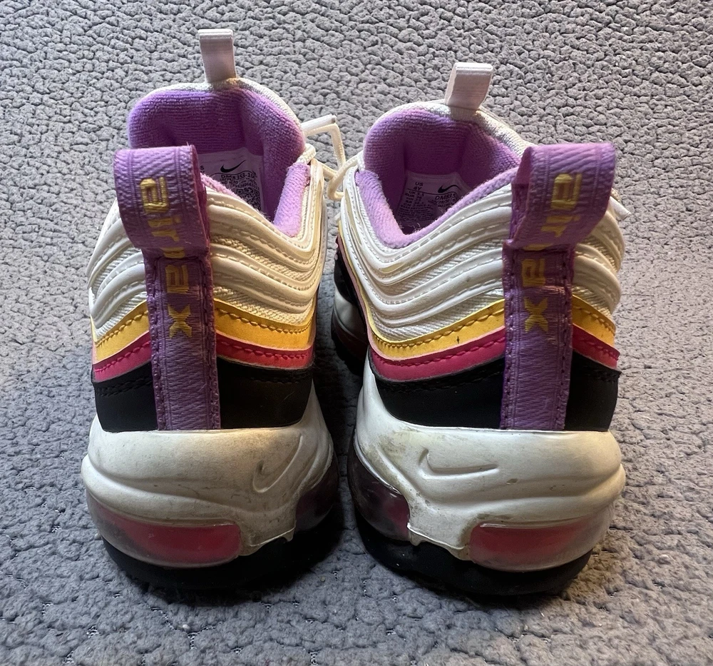 Nike Air Max 97 GS Dawn & Dusk Sneakers Girls Size 4Y White And Yellow DM8353100 good condition any flaws are shown in photos one shoe has what looks to be a slice on front as shown in photos other than that shoes are in good condition SKU(A315)