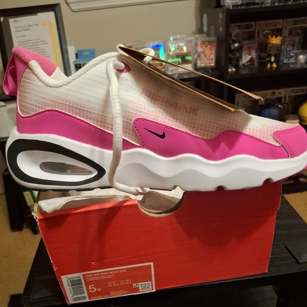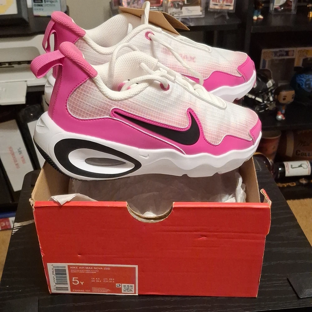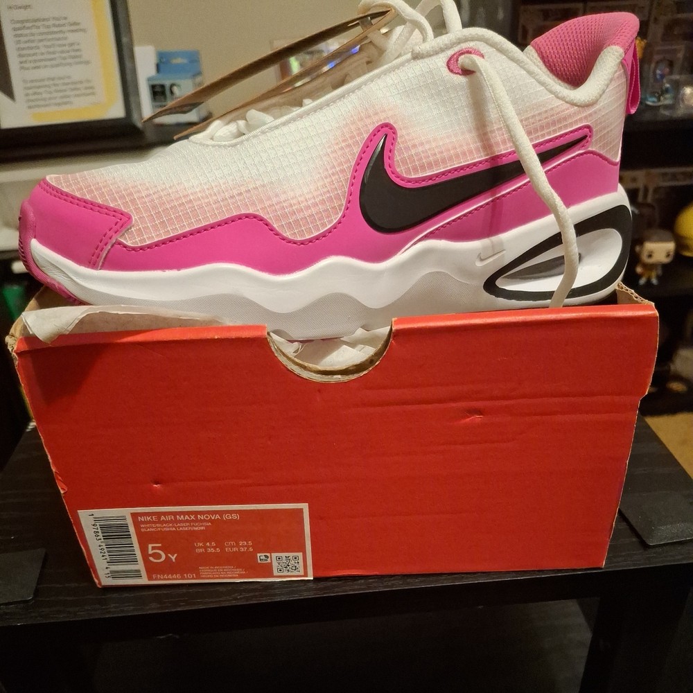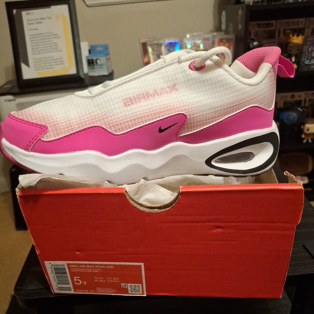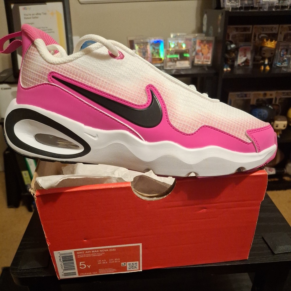 The Nike Air Max Nova (GS) 5Y White/Black/Laser Fuchsia Sneaker is a stylish athletic shoe designed for kids. Featuring a lace-up closure and synthetic upper material, this model offers both comfort and durability. The color scheme of white, black, and laser fuchsia adds a fun and vibrant touch to the design. Perfect for active young individuals, these sneakers are part of the Air Max product line, known for their quality and performance in sports and everyday wear. The sneaker comes with the original box, although the lid is not included.