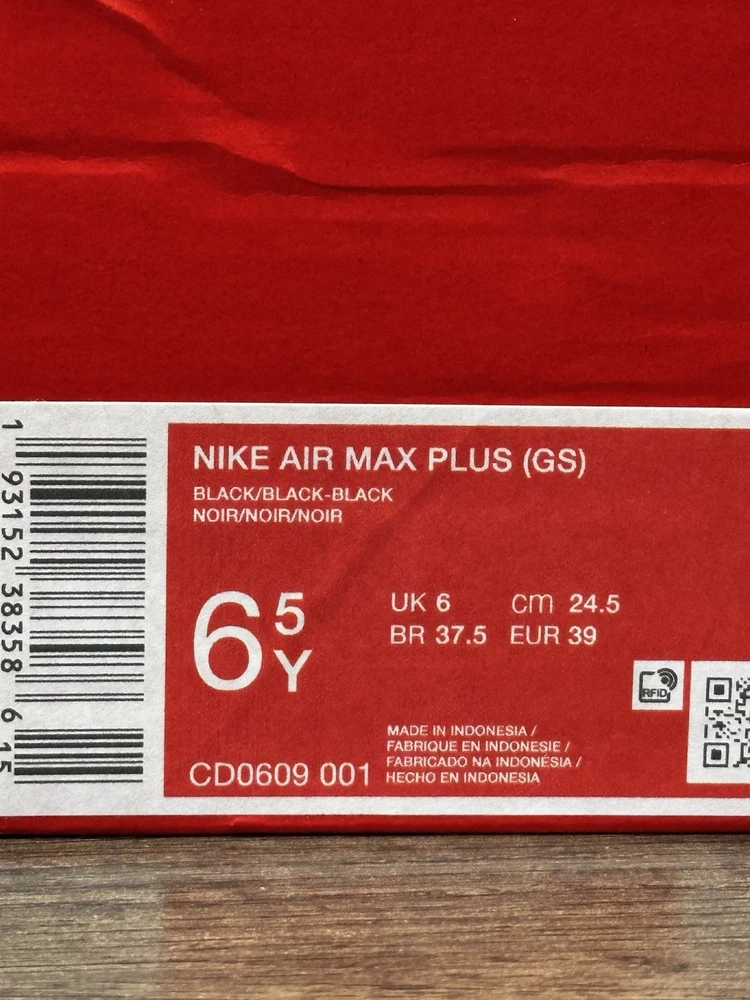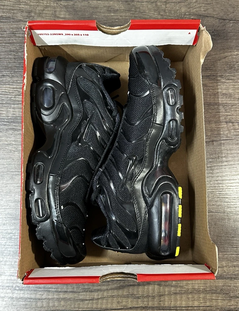 Thank you for considering our store! We appreciate your business and support! Item: Nike Air Max Plus Triple Black Size: Youth Size 6.5 / Women’s size 8 Box may have some minor shelf wear or shipping wear such as small tears , dent , etc. Shoe is new i and unused. “New with box without lid" Item number: CD0609-001 You must do so from your end within one hour of the order. Communications between buyer & seller are blocked by Ebay from the moment you purchase or at the acceptance of an offer. 100% authentic NO LID Shipped to you fast via USPS Priority Mail We consider all reasonable offers! With that said, we invite you to “watch" our items to receive special offers sent directly to you! Thank you for visiting