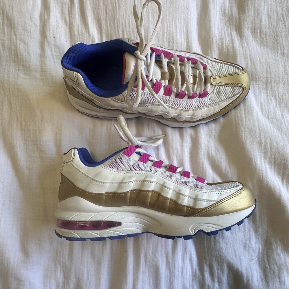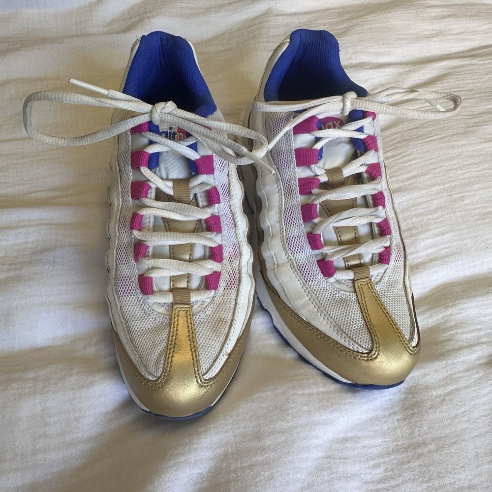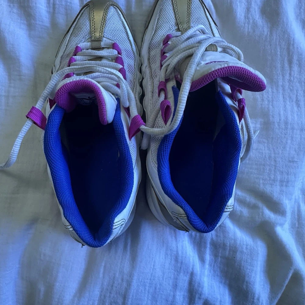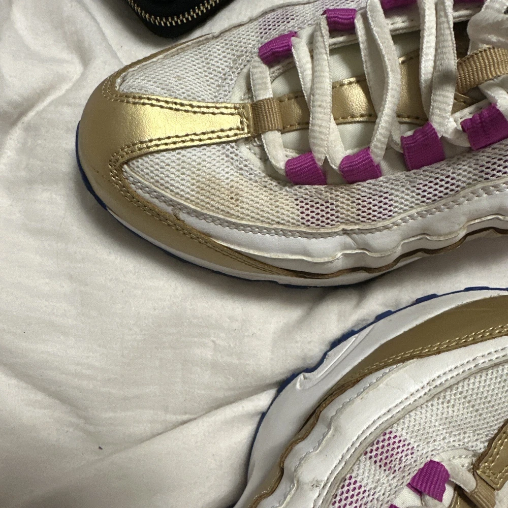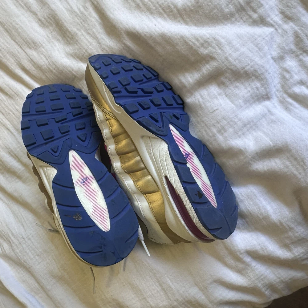 nike airmax 95 shoes in the colourway ‘peanut butter jelly’ soles look as thought they have only been worn a few times. some staining on the left shoes toe as pictured.