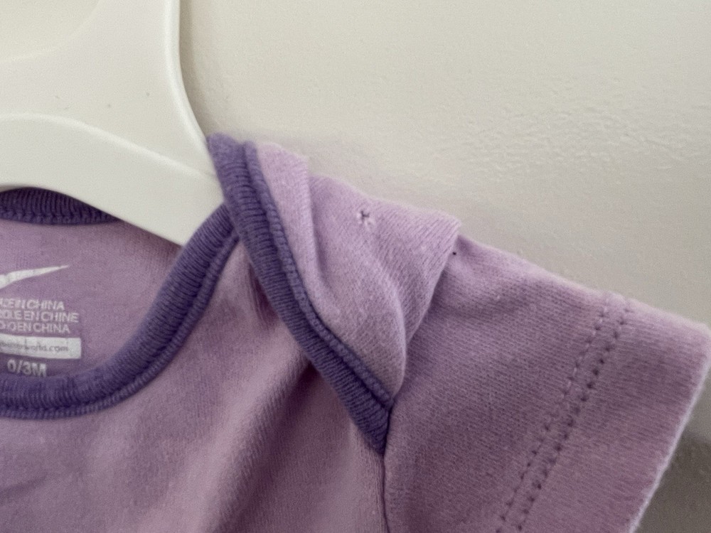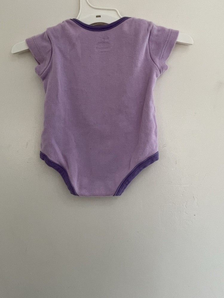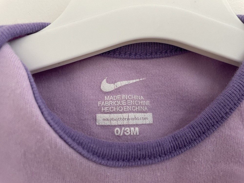 Department: Girls Features: Comfort, Easy Care, Lightweight, Stretch Season: Spring, Summer Material: 100% Cotton Seller Notes: “In very good condition. Free of rips or stains.” Country of Origin: China Number of Pieces: 1 Piece Garment Care: Machine Washable Theme: Heart Pattern: Graphic Print Closure: Snap Size: 0-3 Months Brand: Nike Sleeve Length: Short Sleeve Set Includes: Bodysuit Color: Purple Type: One-Piece Occasion: Casual Style: Bodysuit