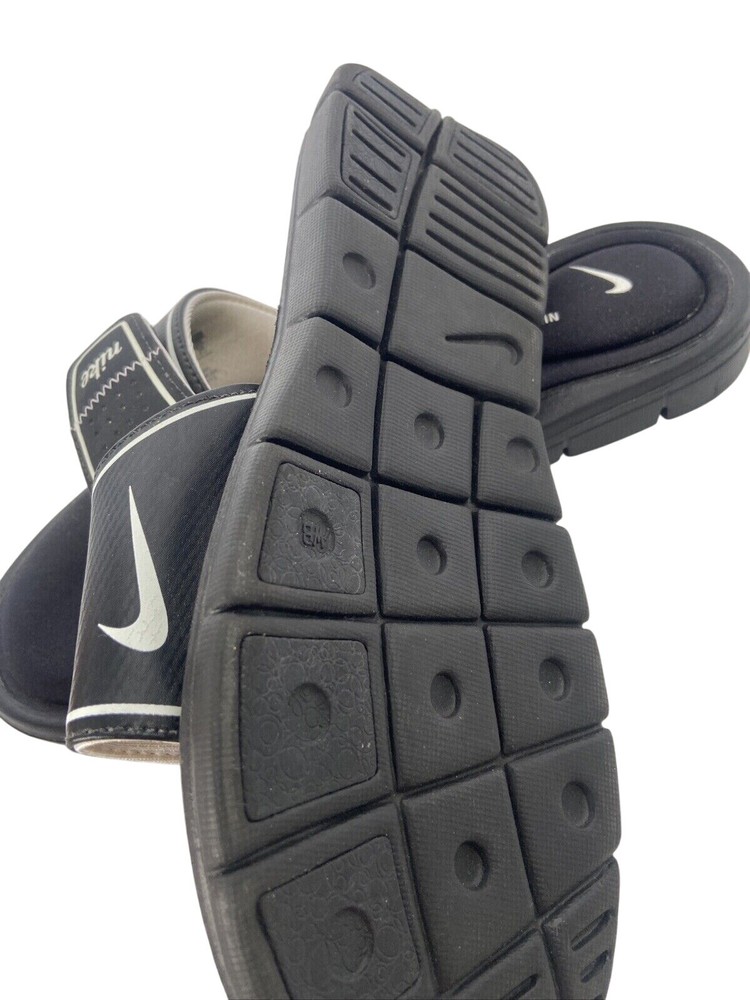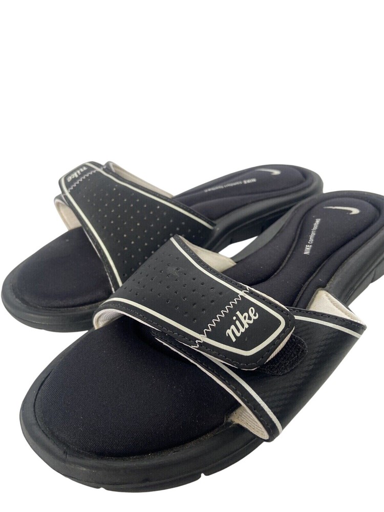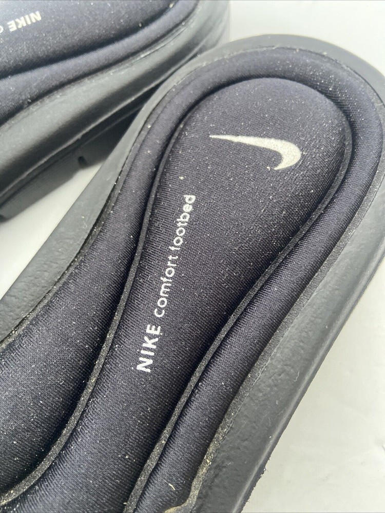 These Nike Comfort Footbed Slides are slip-on sandals in black, designed for women in size 8W. They feature a low heel, cushioned footbed, adjustable strap, and a rubber outsole for comfort and support. Perfect for travel, activewear, or casual wear during summer, fall, and spring seasons. The sandals have a standard shoe width and a flat heel style.