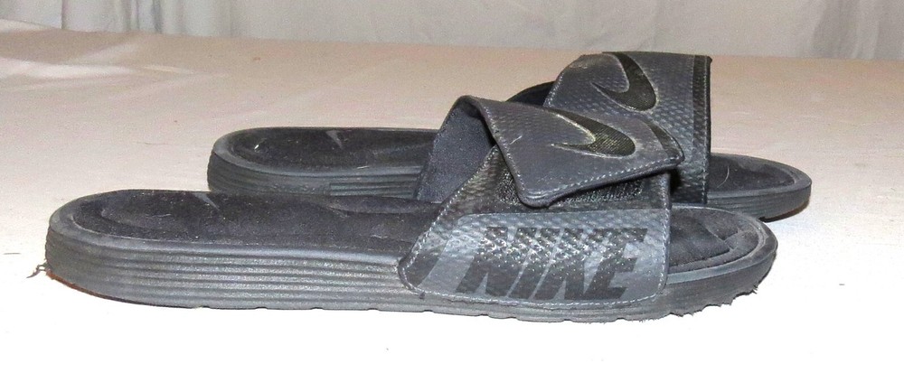 Nike Black Slides Sandals Size 10 -------------------------------------------------------------------- We try to declare all issues. Any white spots in the pictures that have not been mentioned are more than likely glare from the camera flash, but if you have any doubts, please don't hesitate to ask. Please look at our other auctions, and especially our ebay store items, and save on shipping with multiple wins Please email us with any questions. Honest Shipping : We do not insult your intelligence by hiding the shipping costs in the price of our items, and then offering "free" shipping - trying to fool you into thinking that we are absorbing the shipping costs. What nonsense! Our shipping costs are based on an estimate of the shipper's rates, ebay shipping fees, plus a small handling charge. If you can find the same item with a cheaper total cost - purchase price plus shipping - anywhere on the web - please contact us. We cannot guarantee to beat it (because of distance-based shipping), but will give it our best shot. Please be sure that you understand, and are comfortable with, the total costs before making your purchase. If you have any questions - please ask first. Combined Shipping: We always offer combined shipping for multiple purchases. Please add your purchases to your ebay "cart". When you have completed your purchases, (either multiple items from a single listing, or items from two or more listings), please contact us, using the "Requests total from seller" button, and we will generate a final combined-shipping invoice.. Note: You will possibly receive an earlier invoice (or invoices) generated automatically by ebay. These are accurate for single item purchases, but often inaccurate for multiple items, due to limitations with ebay's shipping calculator. Our combined shipping invoice will include a note stating that it reflects combined shipping. If you have any doubts - just ask. Shipping Methods: Unless otherwise noted, for each item we offer three forms of shipping: 1. Free: Personal pick-up: You can collect your purchase in San Jose, CA - with zero shipping charges. 2. Economy: One of : USPS Ground Advantage if the package qualifies, or USPS Media Mail if the package qualifies. 3. Expedited: for example, USPS Priority Express Mail We are always willing to at least consider any other valid shipping method - just ask. If the costs allow it, we will promote your package to a faster service where we can, at no additional charge to you. If shipping is not to a USA contiguous 48 state street address, or you request a faster or other shipping method, such as UPS Air, or Express Mail, then shipping costs may vary. Please allow at least 14 business days for delivery to the contiguous 48 USA states. Media Mail typically takes longer. More specific estimates are available on the USPS web site. For AK and HI , USPS Priority Mail should take 4 days or fewer, but USPS offers no time estimates for Parcel Post. Books, other printed matter, and media: We typically ship books, CDs, videos, and the like by Media Mail. This can be considerably slower than other services. If you need your book quickly, please let us know, and we will re-quote the shipping, typically at a higher cost. International Buyers - Please note: International mail is often slower than the estimates available on the USPS web site, so customers should allow a minimum of 14 days for airmail delivery - longer if your parcel is held in incoming customs. USPS no longer offers any international surface mail, or M-bag service. Air Mail is the only remaining option for international shipments. International buyers should double-check for mailing costs before bidding. Also: Import duties, taxes and charges are not included in the item price or shipping charges. These charges are the buyer's responsibility, so please check with your country's customs office to determine what these additional costs will be prior to bidding/buying. Additional charges are sometimes collected by the delivering freight (shipping) company on delivery or pick-up - do not confuse them with additional shipping charges. We do not mark merchandise with lower values, or mark items as "gifts" - US and International government regulations prohibit such behaviour. Questions. Please email us with any questions: If you have any questions, please ask at least 24 hours before end of auction as we have other commitments that require our attention, and are not always at the computer. We pack with care but after your parcel is delivered to the carrier we have no control over delivery times. Please ask all questions before bidding. Returns. Unless otherwise noted, we always accept returns - for any reason. The item must be returned within 30 days with all original packaging . The purchase price will be refunded when the item is returned in the same condition as it was shipped . If there is a relevant error in the listing description, we will also refund shipping in both directions. Problems & Issues. Please always contact us with any problems before leaving any feedback or DSRs. We will always do everything we can to resolve any issue. Once feedback has been left it cannot be changed, and we cannot guarantee to resolve your problems. Feedback: **We always work to earn 5-star feedback from you. If you have any concerns about this transaction, please contact us, preferably before bidding, but definitely before leaving feedback, so that we can do everything possible to resolve the issue.** If the transaction has gone well Positive feedback and 5-star DSRs - for each item, if you have bought more than one - is appreciated. Payment Method: For shipped purchases, all major credit card payments through Paypal. We cannot accept credit card payments directly. Payment Timing: Unless negotiated before the purchase is made, payment must be received within seven days of the listing's close. All non-paying bidders will be reported to Ebay. Wherever possible, orders are shipped within t