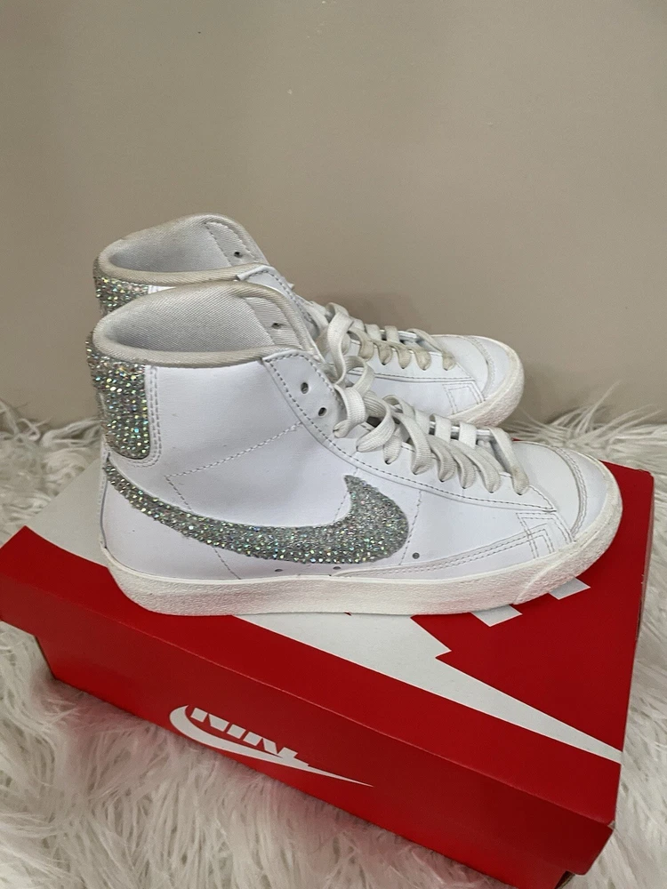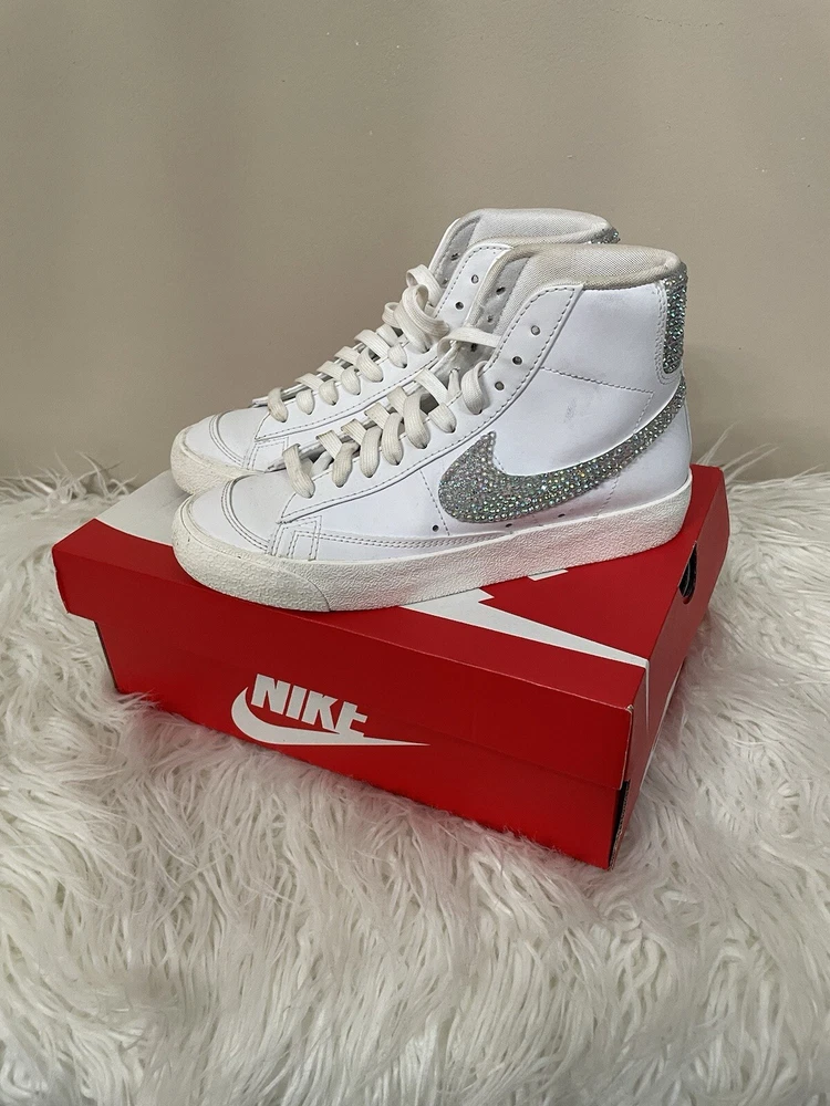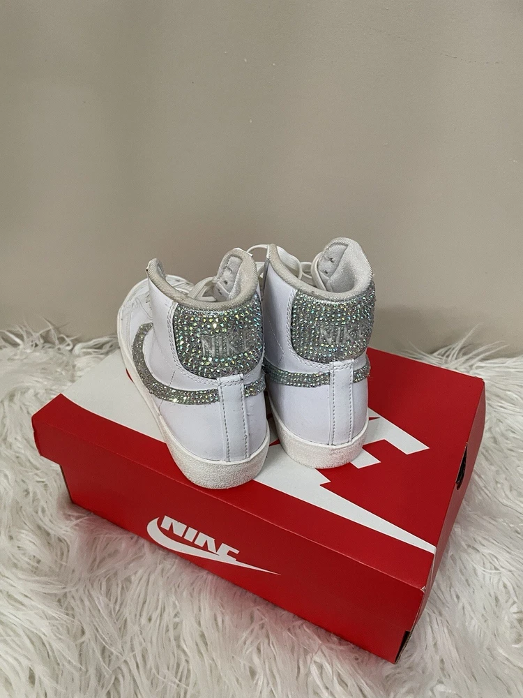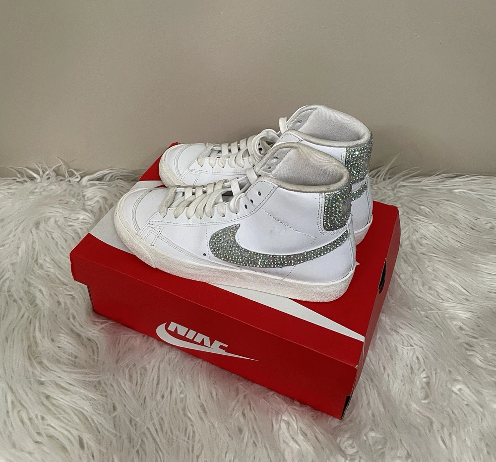Nike Blazer Mids 7.0 Custom Tennis Shoes! Must See.. Great Condition. My daughter absolutely loves shoes! We had these custom made for a dance and they were quite pricey. These are the equivalent to Cinderella’s slippers but they don’t hurt your feet. 😃 These are a one of a kind in great preowned condition with normal wear. All Sales are Final. So PLEASE see all photos and Feel free to ask any questions. I’m always happy to help. No international Shipping.. Thanks so much for looking..☺️