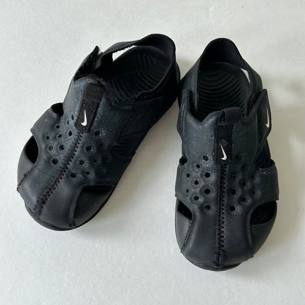 Toddler Size 7C Toddler Boys' Nike Sunray sandal Nike Sunray Sandals - LIGHT AND STRETCHY. Total toe coverage and outsole traction perfect for outdoor play. Two Hook-and-loop straps help make on and off easy. Very Good Pre-owned Condition #toddlersandal #nikesandal #nike #niketoddler #blacknike