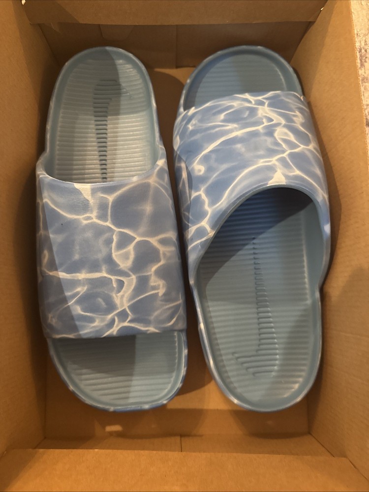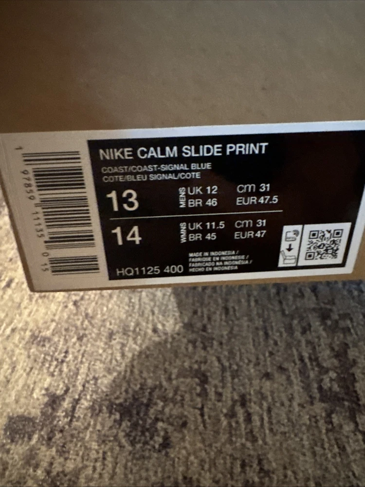 The Nike Calm Slide is a stylish and comfortable slip-on sandal perfect for activewear or casual occasions. Featuring an ocean blue color with Nike logo accents, this open toe slide is made with synthetic lining and outsole materials for added durability and comfort. Designed for summer, fall, and spring seasons, this shoe is a great addition to any man's footwear collection. Color: Coast/Coast-Signal Blue Style Number: HQ1125-400 Men’s Size 13, UK 12, Women’s 14