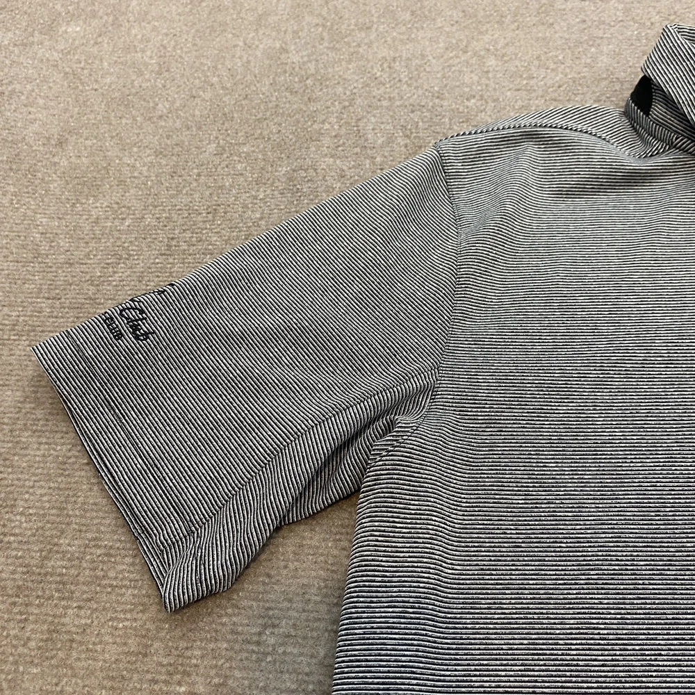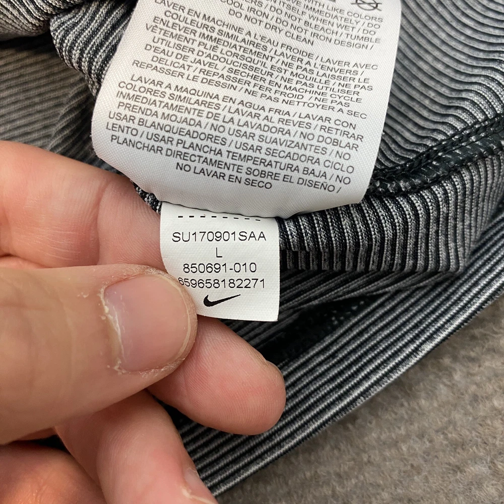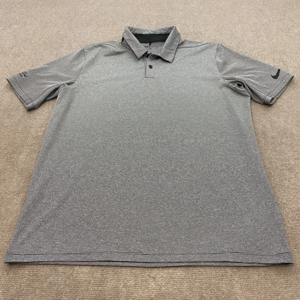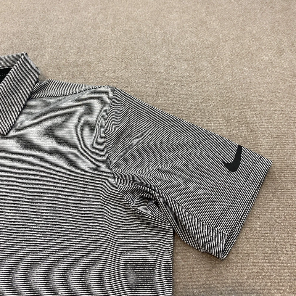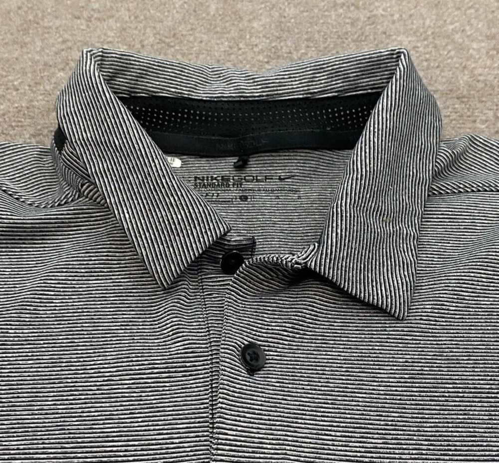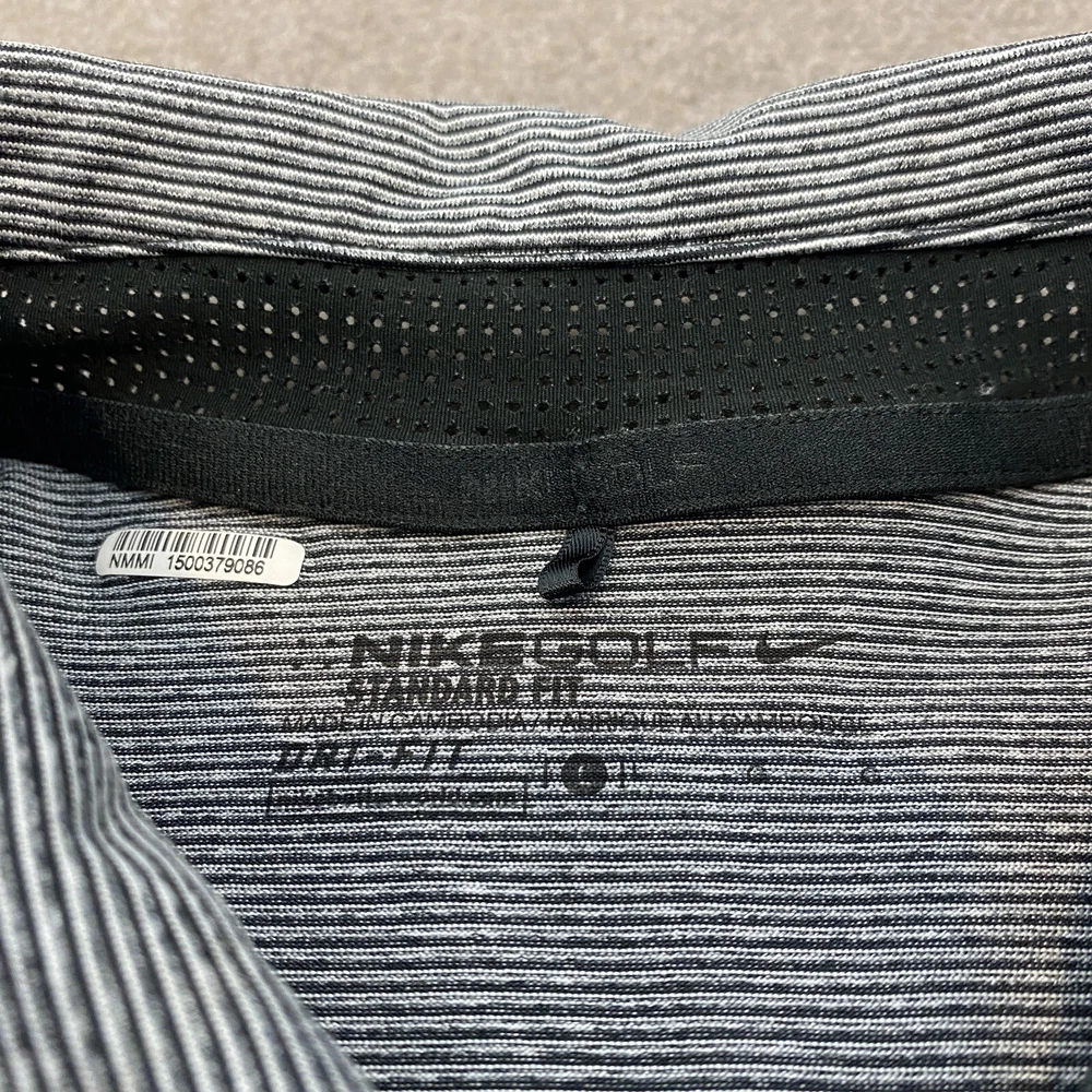 Sleeve Length: Short Sleeve Garment Care: Machine Washable Country/Region of Manufacture: Vietnam Performance/Activity: Golf Fit: Regular Pattern: Striped Signed: No Material: Polyester Blend, 92% Polyester | 8% Spandex Model: 850691 010 Department: Men Features: Stretch Theme: Logo, Sports Size Type: Regular Fabric Type: Blended Fabric Size: L Collar Style: Spread Product Line: Nike Golf Type: Polo Fabric Wash: Medium Color: Gray Neckline: Collared Closure: Pullover Handmade: No Brand: Nike