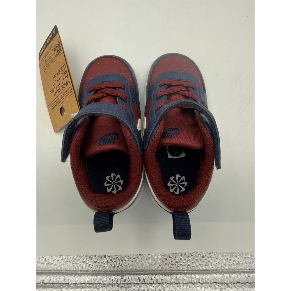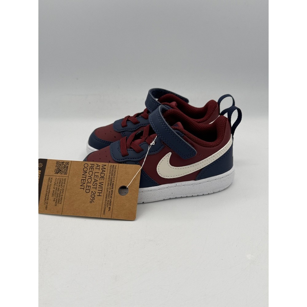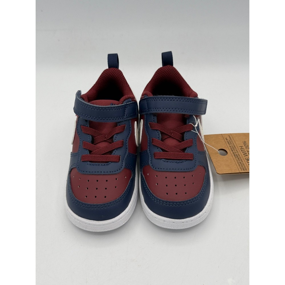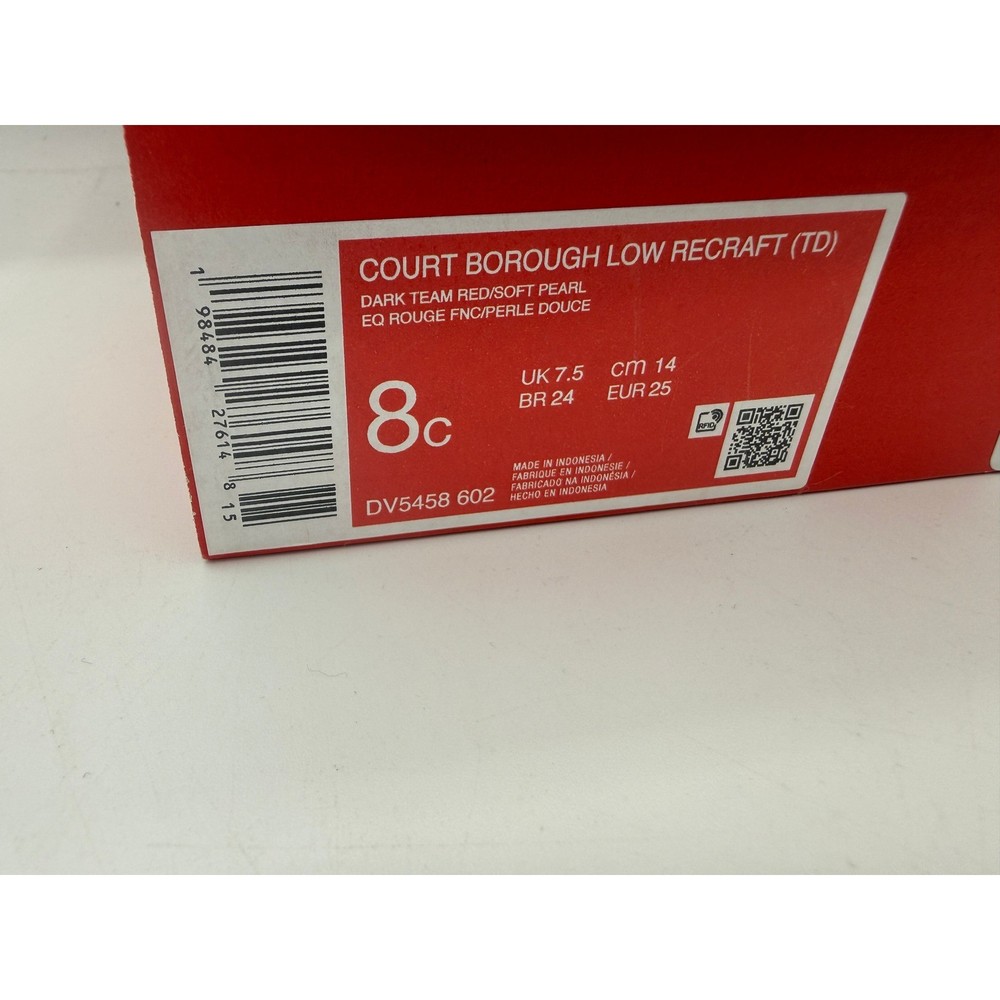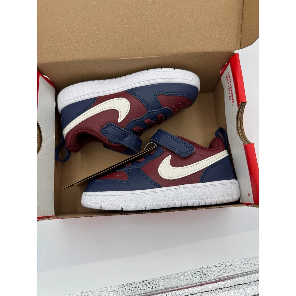 Court Borough Low Recraft (TD) sneakers offer a classic hoops-inspired look for little feet. These toddler shoes combine a durable synthetic upper with a convenient hook-and-loop strap over elastic laces for easy on and off. The dark team red and navy blue colorway is accented by a soft pearl swoosh, while the speckled rubber outsole provides reliable traction for all-day play. Brand: Nike Model: Court Borough Low Recraft (TD) Style Code: DV5458-602 Color: Dark Team Red/Soft Pearl/Navy Size: 8C Gender: Unisex Kids Closure: Hook and Loop, Elastic Laces Upper Material: Synthetic Leather Outsole: Rubber Features: Heel Pull Tab, Perforated Toe Box Sustainability: Made with at least 20% recycled content Keywords: Toddler Sneakers, Basketball Style, Low Top, Team Red, Navy Blue, Recraft, Everyday Wear, Kids Athletic Shoes, Easy On, Sustainable Fashion If you have any additional questions, please don't hesitate to contact me direclty.