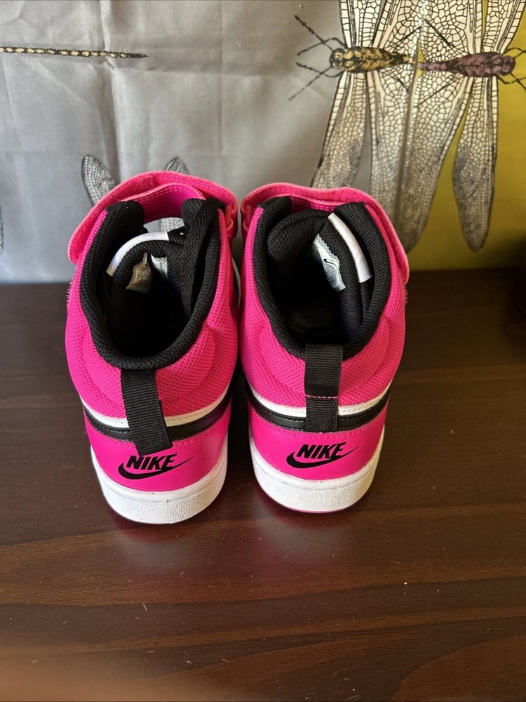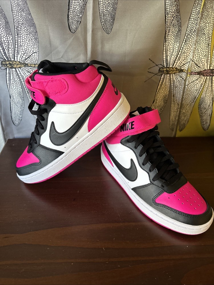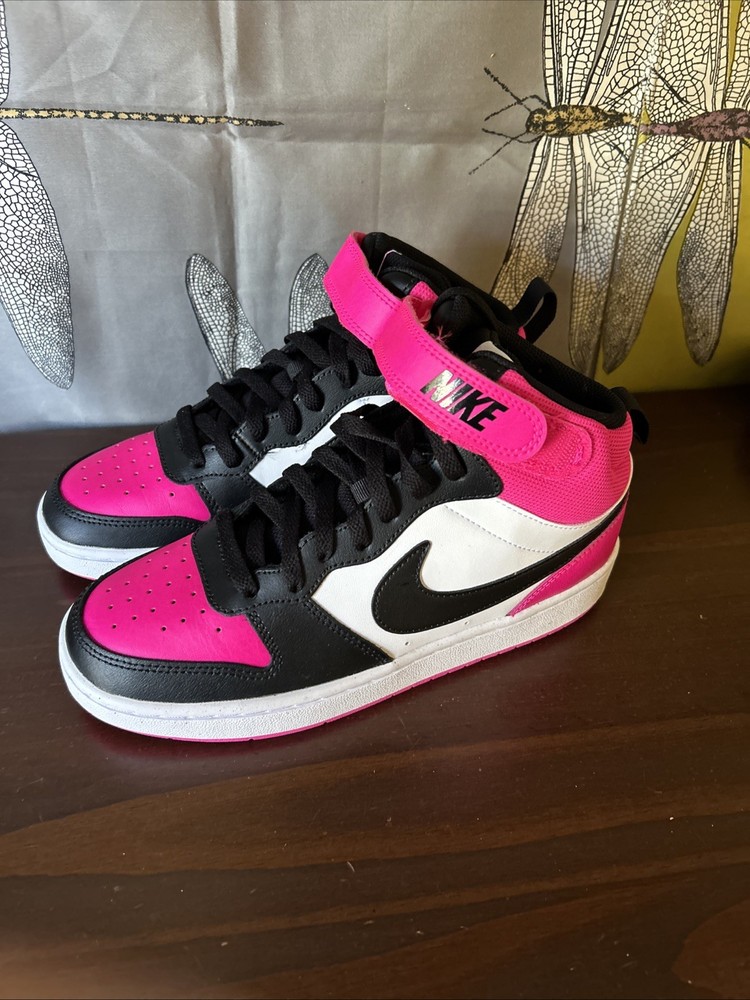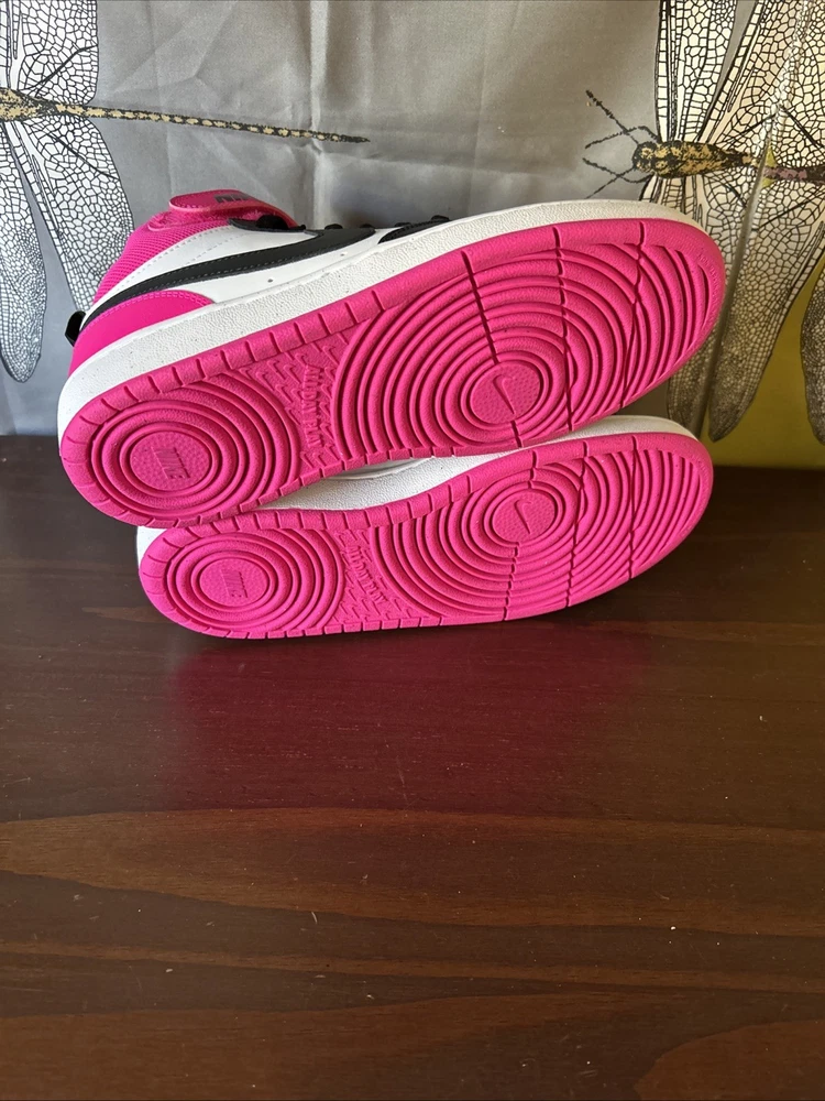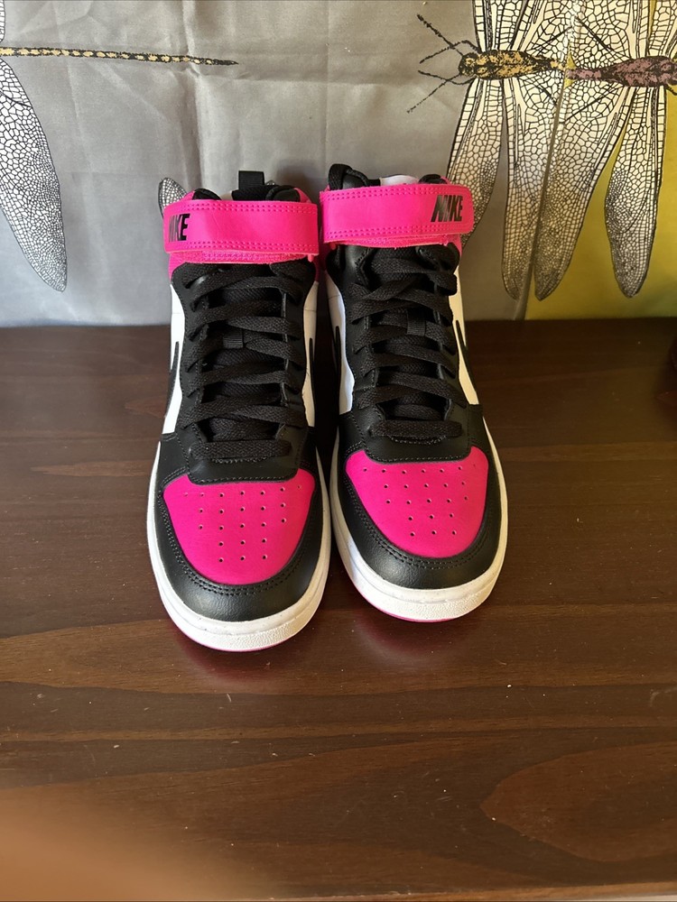 Shoe Shaft Style: High Top Insole Material: Foam Product Line: Nike NikeCourt Model: Nike Court Borough Type: Athletic Style: Sneaker Color: Black/Fierce Pink Brand: B&G Lining Material: Canvas Performance/Activity: Boxing US Shoe Size: 6.5Y or 8W Outsole Material: Rubber Season: Fall, Spring, Summer, Winter UK Shoe Size: 6 Department: Boys