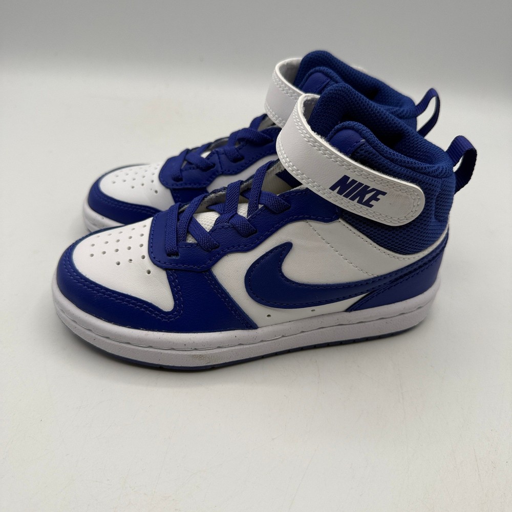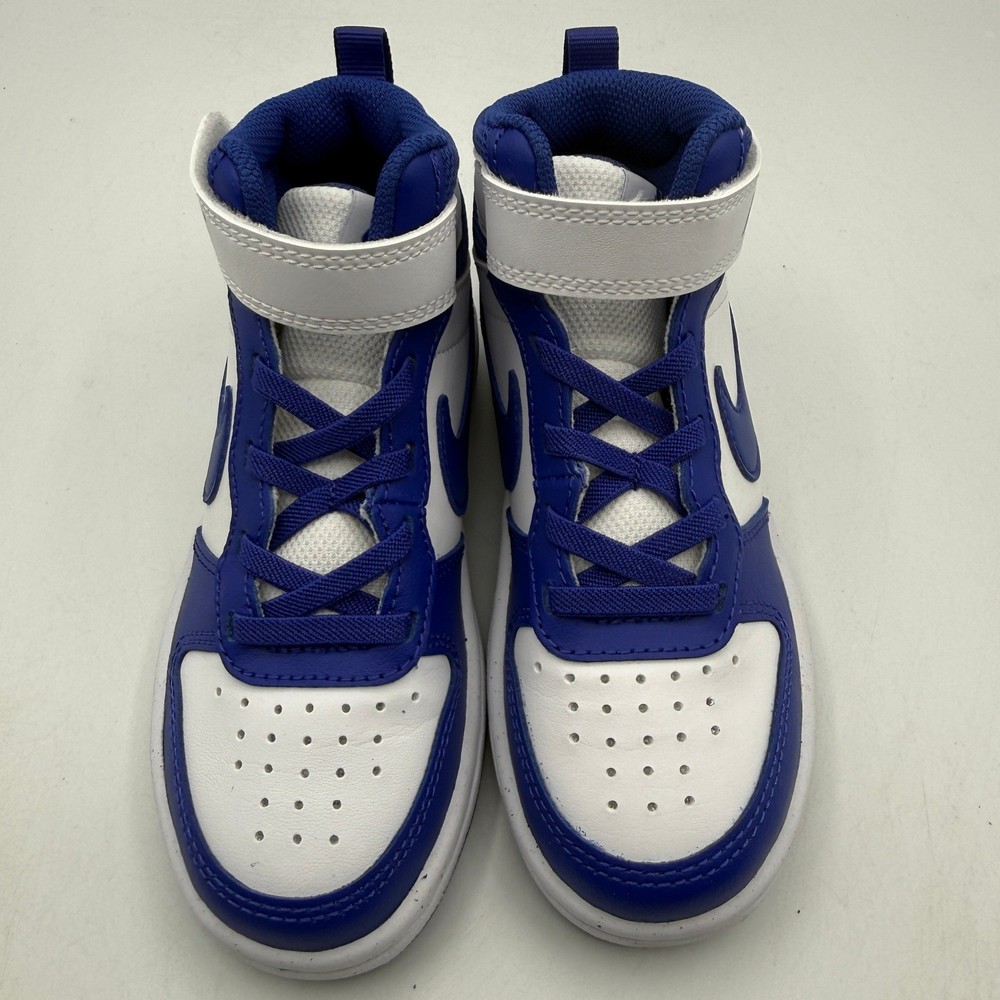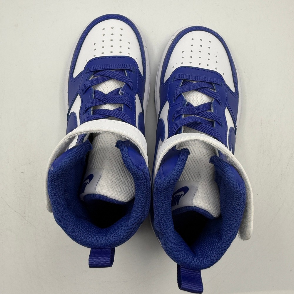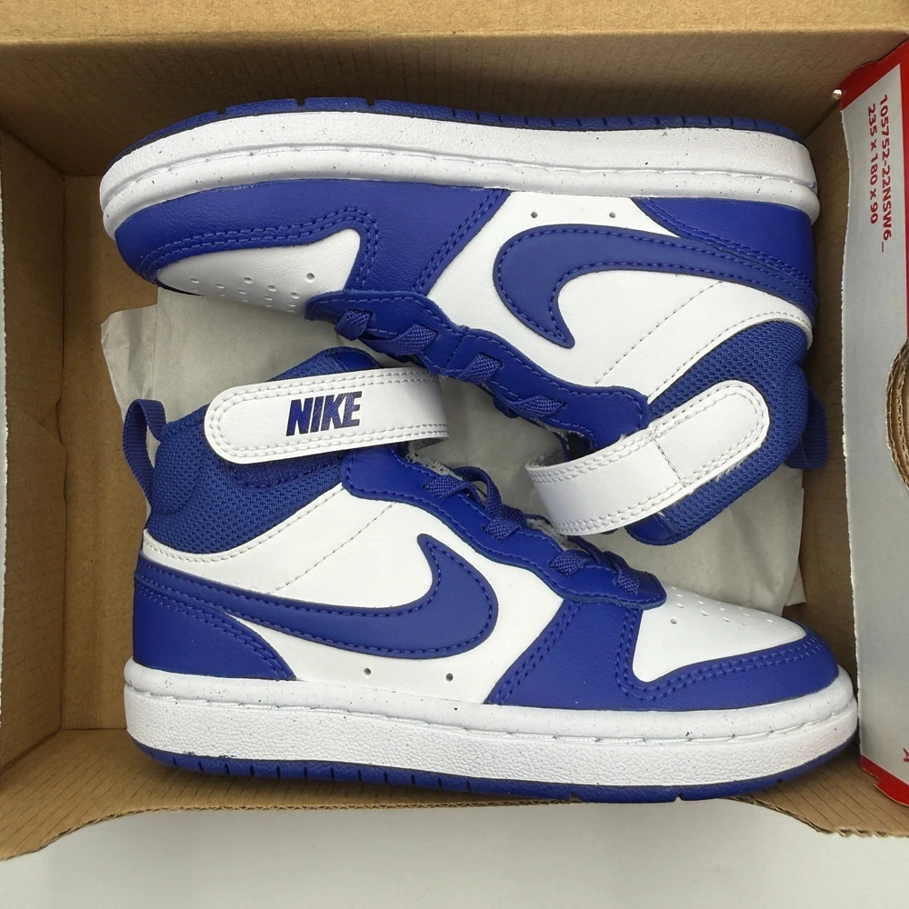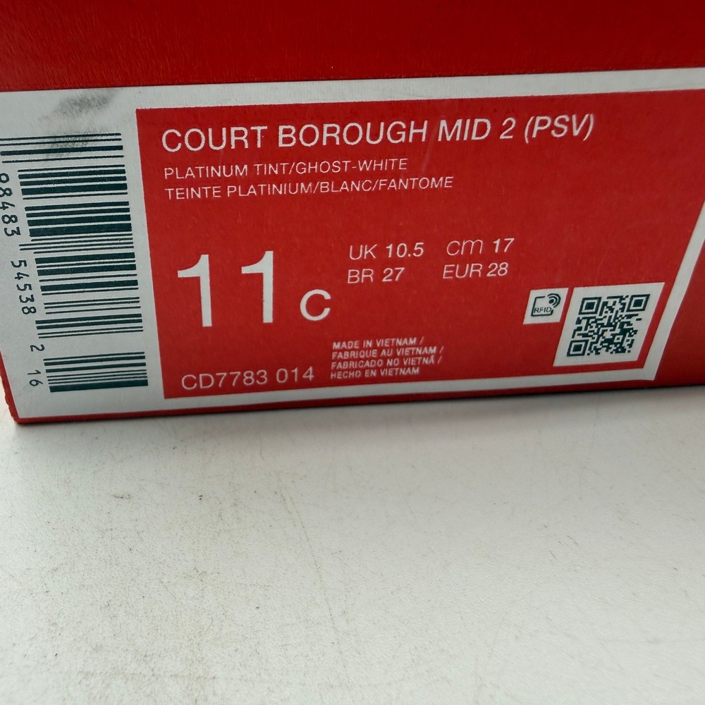 Court Borough Mid 2 (PSV) sneakers offer a classic hoops-inspired look for active kids. These mid-top shoes feature a durable leather upper in a crisp white and deep blue colorway, providing both style and support. The design includes elastic laces combined with a hook-and-loop strap for a secure, adjustable fit that's easy to put on and take off. A rubber sole with circular traction patterns ensures reliable grip for all-day play, while the padded collar adds extra comfort around the ankle. Brand: Nike Model: Court Borough Mid 2 (PSV) Style Code: CD7783-014 Color: Platinum Tint/Ghost-White/Blue Gender: Unisex Kids Size: 11C Upper Material: Leather/Synthetic Closure: Hook & Loop Strap, Elastic Laces Toe Shape: Round Toe Shoe Shaft Style: Mid Top Outsole Material: Rubber Features: Padded Collar, Heel Pull Tab Pattern: Colorblock Keywords: Basketball, Retro, Athleisure, School, Casual, Sporty, Streetwear, Durable, Comfortable, Toddler, Preschool If you have any additional questions, please don't hesitate to contact me directly.