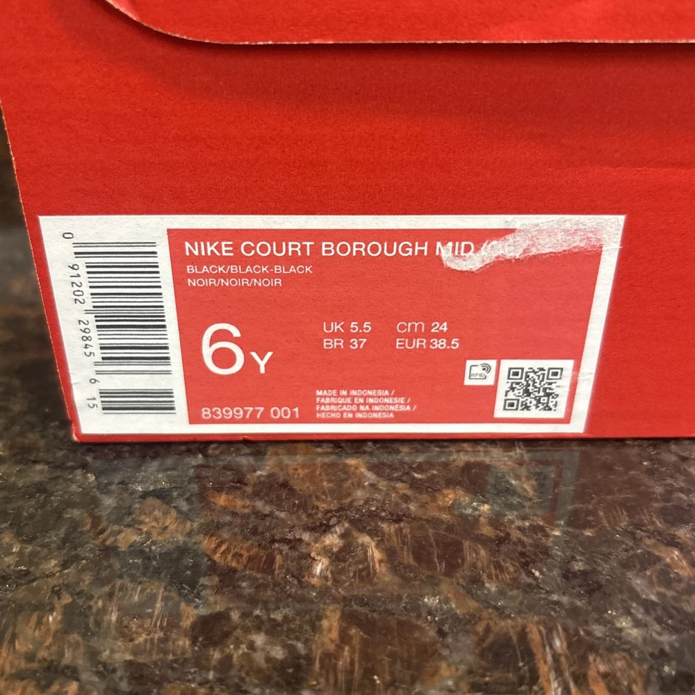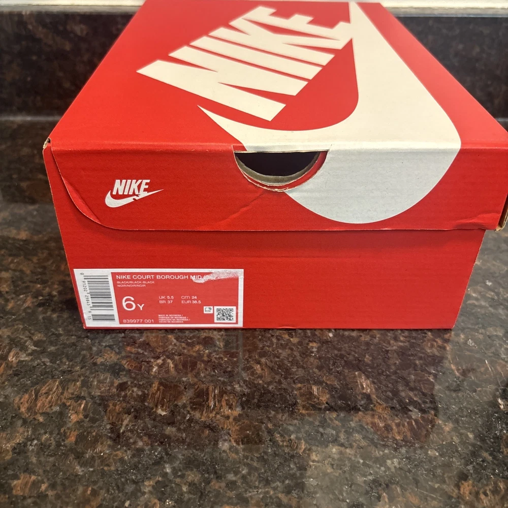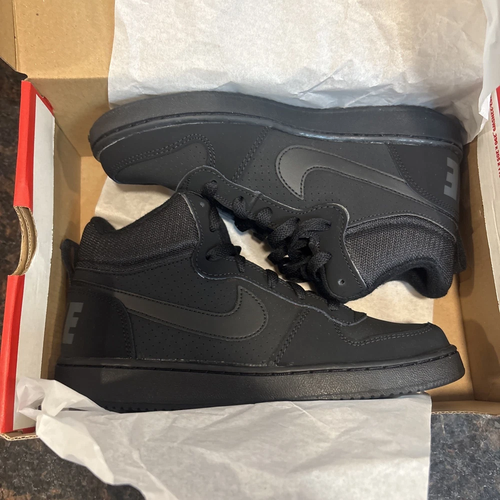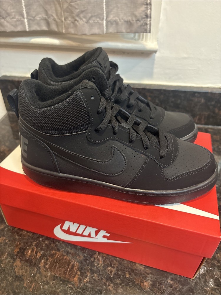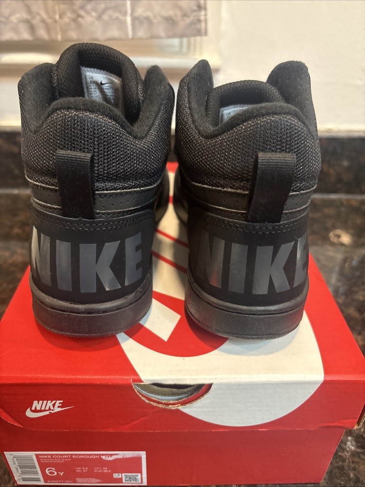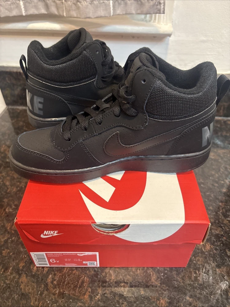 The Nike Court Borough Mid GS Trainers 839977 Sneakers Shoes in size 6 for Youth Boys are a stylish and comfortable option for young boys. Featuring a mid-top shoe shaft style, these black trainers are made of synthetic fabric with a synthetic insole for durability and easy maintenance. With the iconic Nike brand, these casual sneakers are perfect for everyday wear and come in a classic sneaker style. These shoes are designed for boys and offer a combination of style and functionality, making them a must-have addition to any young boy's wardrobe. Brand new in box!!!