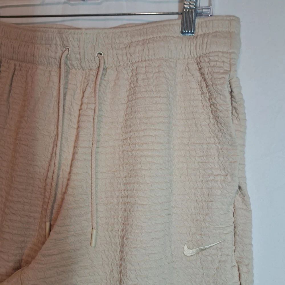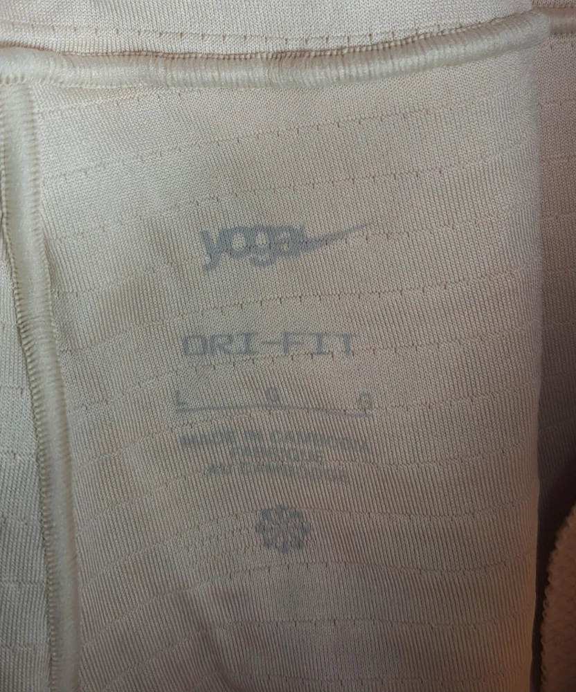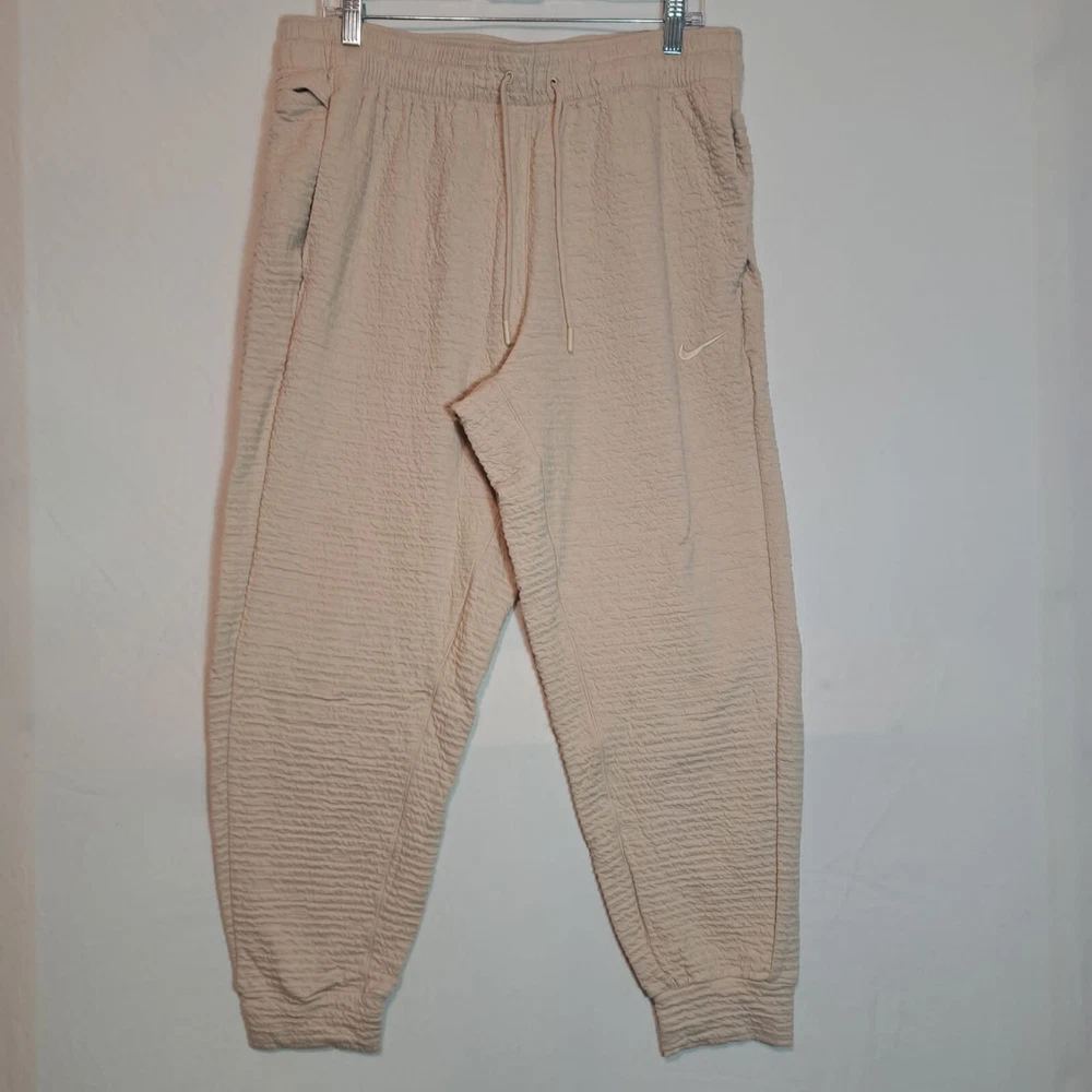 Elevate your yoga practice with the Nike Dri-Fit Flex Tapered Yoga Training Pants in a versatile beige. Designed for men, these size large pants combine function and comfort, featuring breathable fabric that helps keep you cool and stretchy material that accommodates your full range of motion. The drawstring closure ensures a secure fit while the tapered leg style offers a sleek look that doesn't sacrifice performance. With features like three convenient pockets for your essentials and a durable blend of cotton and polyester, these pants are not just for yoga but also versatile for other activewear occasions. The Nike Yoga product line emphasizes a sporty yet casual theme, making these joggers a great addition to your athletic wardrobe. The inseam length is detailed in the pictures for a perfect fit. Items are carefully inspected and sealed after photos. We carefully pack and ship out fast! We ship daily with one day handling.