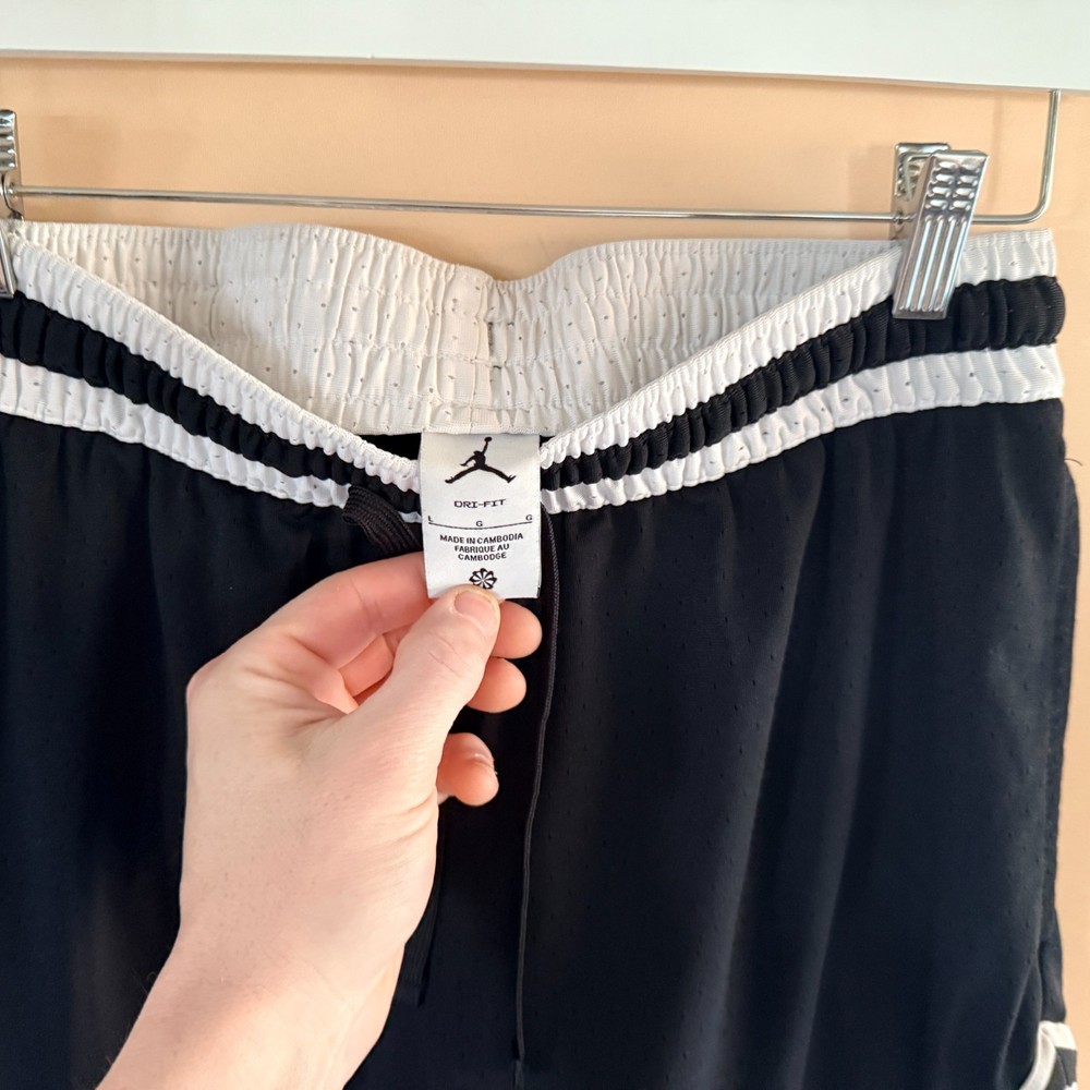The Nike Dri Fit Jordan Mesh Basketball Shorts in Black and White, Men's Size Large, are designed for athletic performance and activewear. These shorts feature a solid pattern with a drawstring closure for a secure fit. Made with mesh fabric, they are machine washable and have compression areas at the waist for added comfort. With pockets for convenience, these shorts are perfect for basketball and other sports activities during the summer, fall, and spring seasons. The Nike brand and Michael Jordan character theme add a stylish touch to this versatile and functional athletic garment.