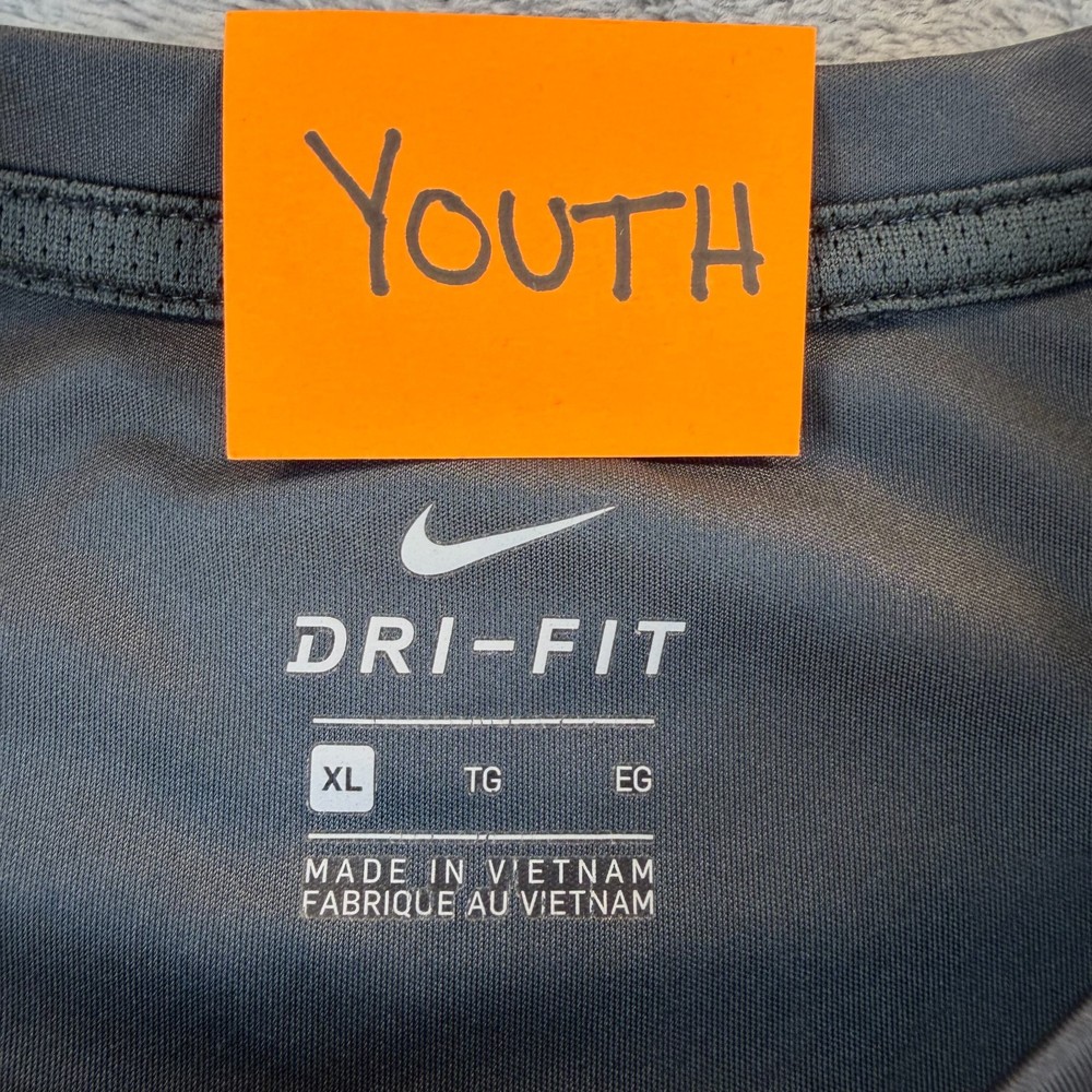 Nike Dri-FIT Youth Long Sleeve Performance Shirt Lightweight and breathable Nike Dri-FIT long sleeve athletic shirt in classic gray with reflective Swoosh logo on chest. Details: • Size: Youth XL • Color: Gray • Nike Dri-FIT Technology • Long Sleeves • Lightweight Performance Fabric • Mesh Side Panels for Ventilation • Made in Vietnam Perfect for sports, training, school athletics, or layering in cooler weather. Please see included photos for measurements and overall condition. 💛 Thanks for supporting our small family business!