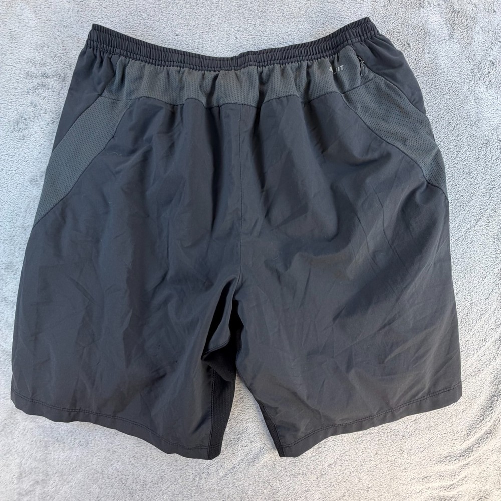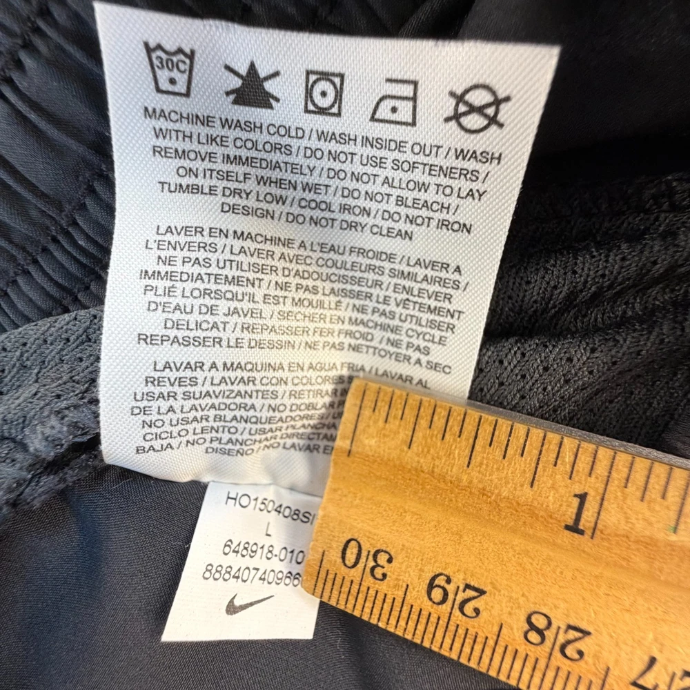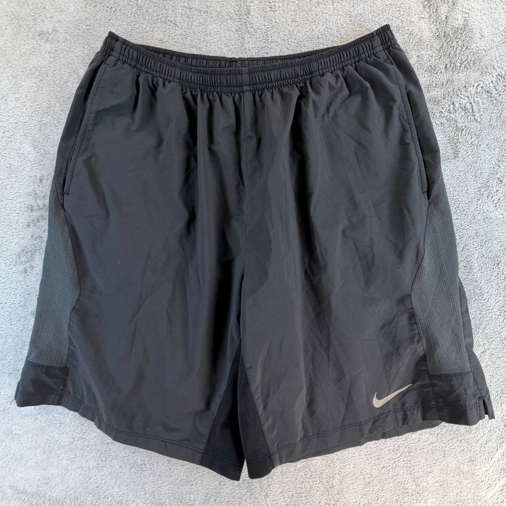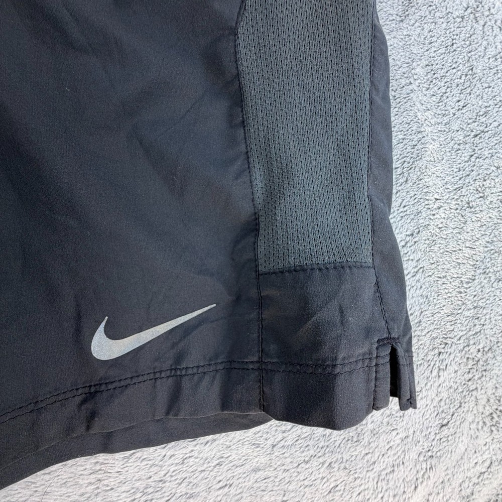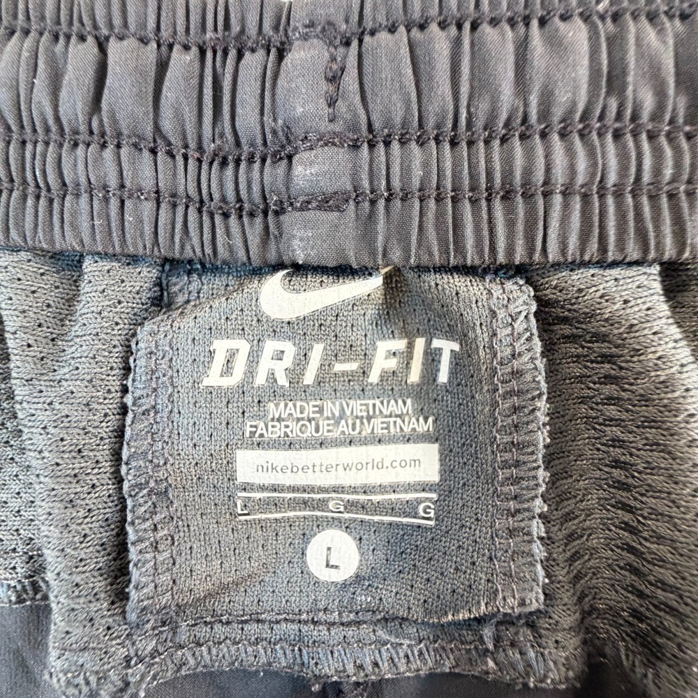 Nike Dri-FIT Performance Running Shorts Lightweight athletic shorts designed for breathability and moisture control, featuring mesh side panels and classic Nike performance construction. Details: Brand: Nike Technology: Dri-FIT moisture-wicking fabric Size: Men's Large Color: Black Material: 100% Polyester Mesh ventilation side panels Elastic waistband Reflective Nike Swoosh logo Condition Notes: Pre-owned with visible wear. Two small pinholes are present on the front fabric area (shown clearly in photos with ruler for scale). No holes in the mesh panels. No tearing, fraying seams, or structural damage noted. Please review all photos carefully prior to purchase. Measurements: See included photos for measurements. Ideal for training, gym workouts, or casual athletic wear where minor cosmetic flaws are acceptable. 💛 Thanks for supporting our small family business!