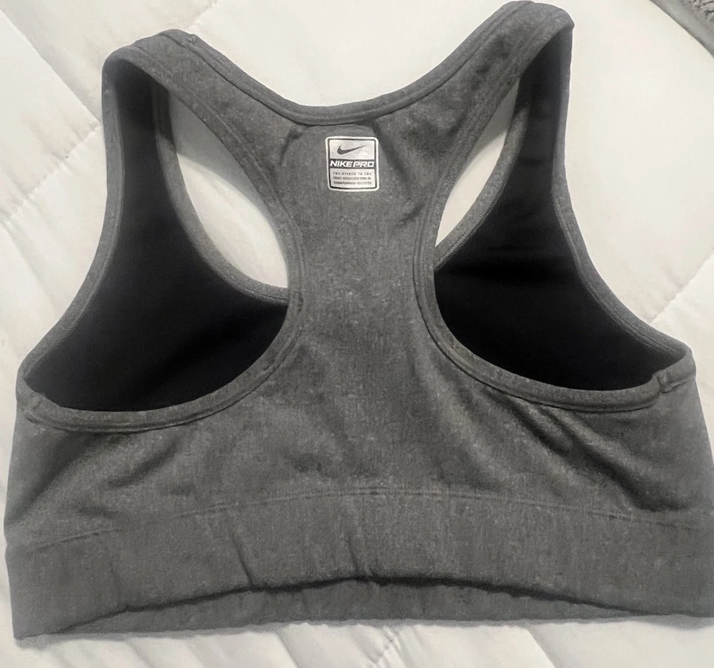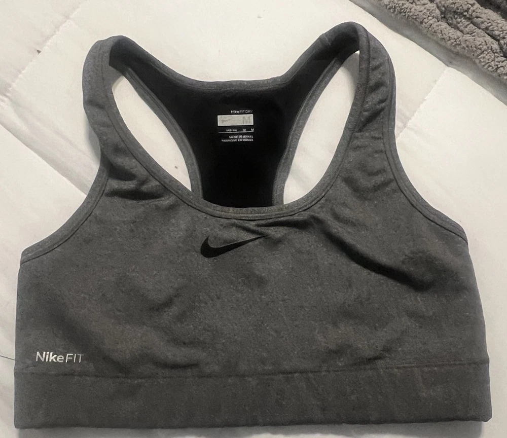 This is a Nike Dri-FIT Swoosh sports bra for women in size Medium, designed in a solid gray color with a racerback strap. It offers medium support and features the Nike logo as an accent. Suitable for gym workouts and yoga, this pullover style bra is machine washable and part of the Nike Dri-FIT product line. Perfect for active and sporty individuals.