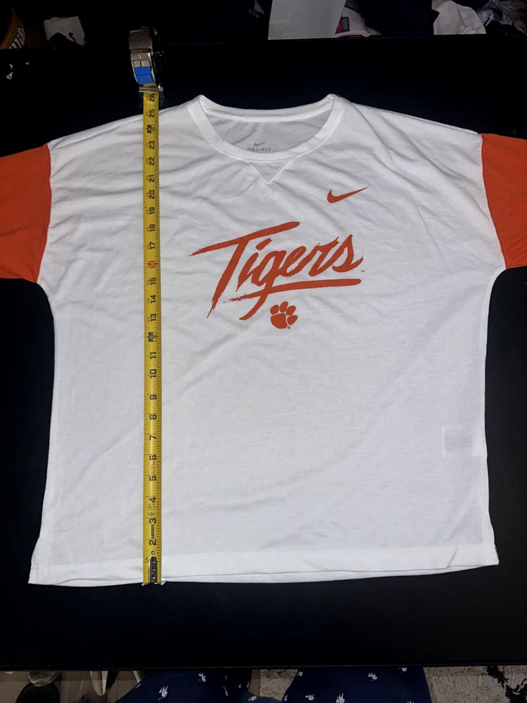Stay comfortable and stylish as you cheer for your team with the Nike Dri-Fit NCAA Clemson Tigers Women's Long Sleeve Shirt. Designed to wick moisture away from your skin, this shirt keeps you dry during intense basketball games or while you're out and about. The crisp white color complements the vibrant orange and black accents, showcasing your Clemson Tigers pride. Crafted with care in Malaysia, this medium-sized shirt is officially licensed and perfect for regular season games. It's a versatile addition to any fan's wardrobe, ensuring you're ready to represent your team at the next game or any sports-related event. The shirt's quality construction and attention to detail make it a must-have for any dedicated fan.