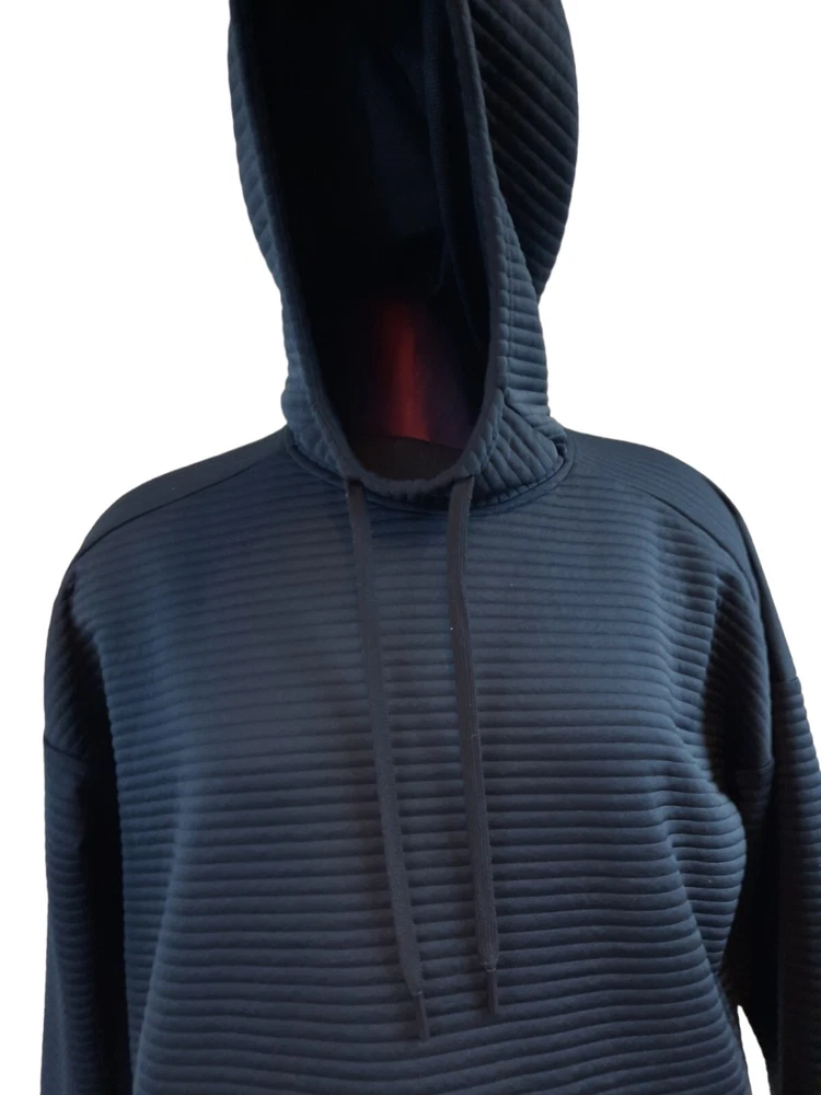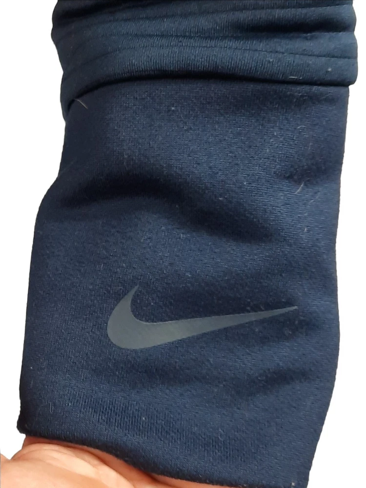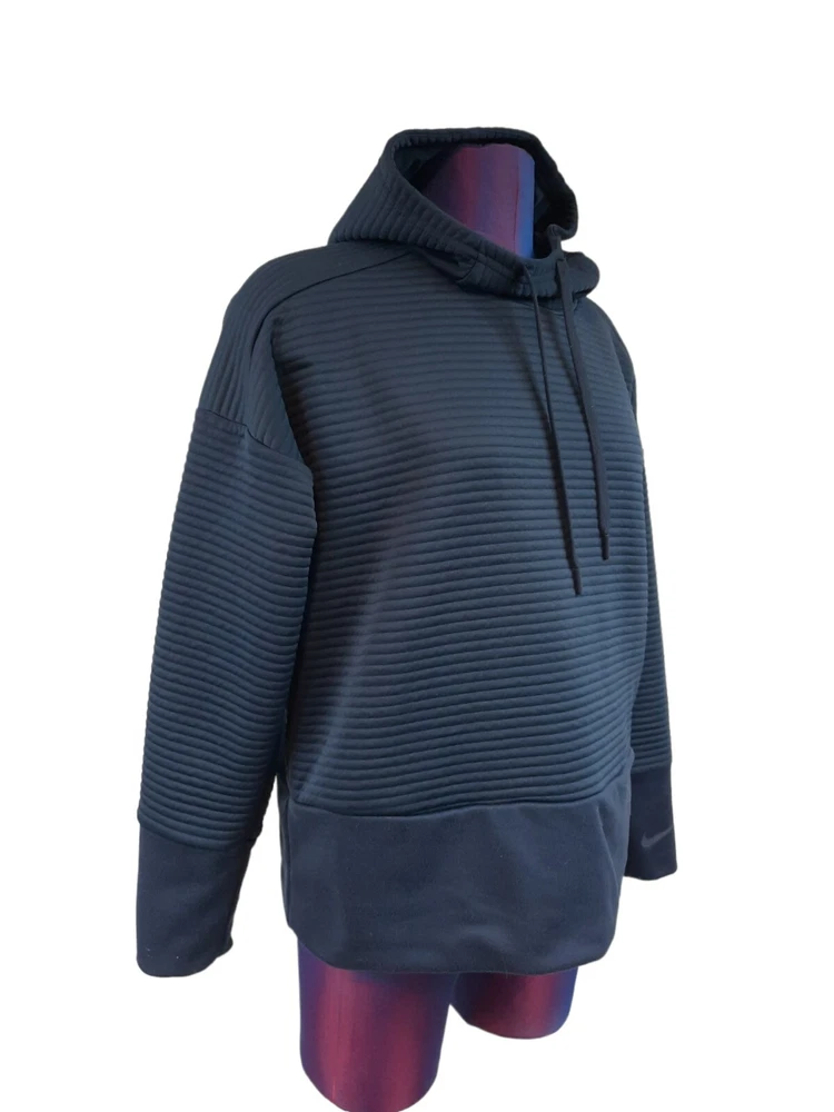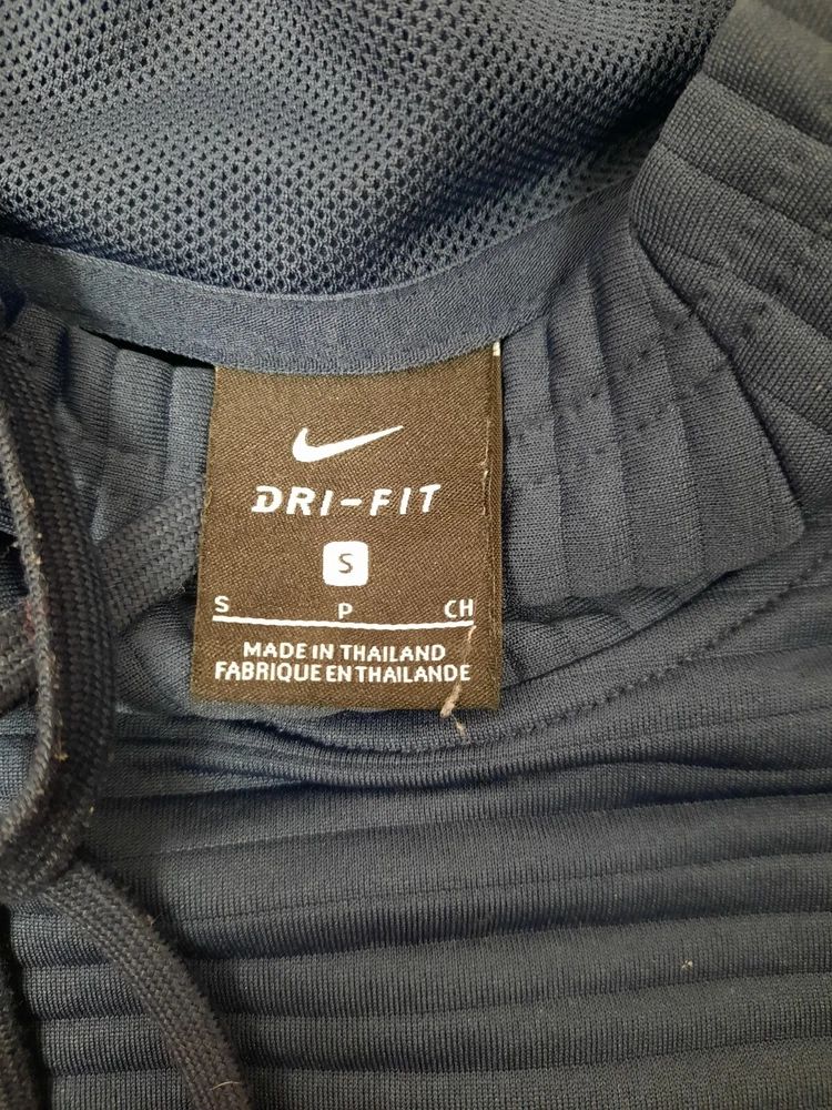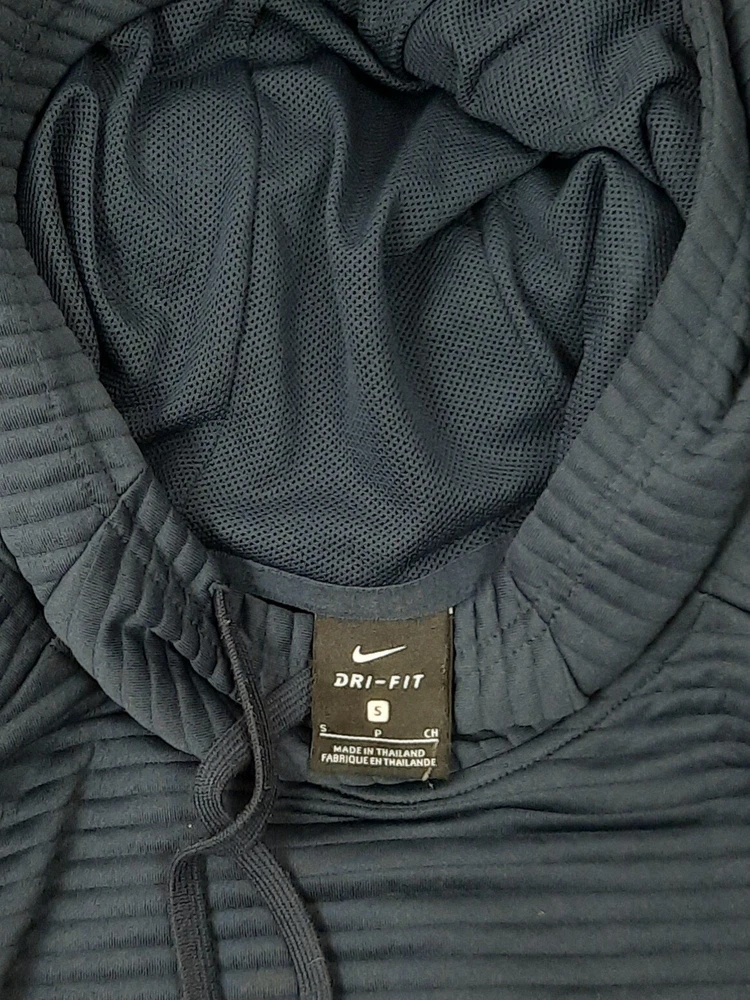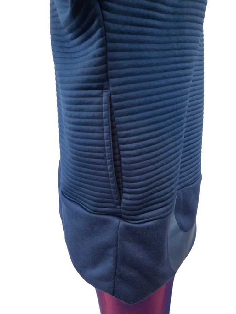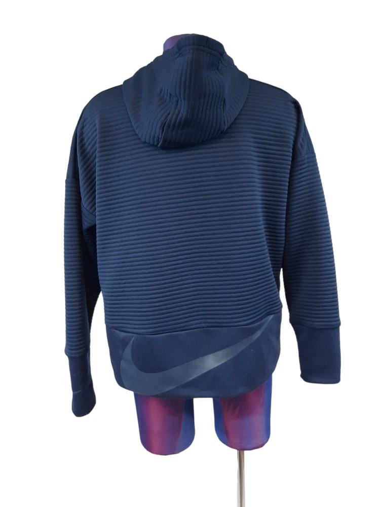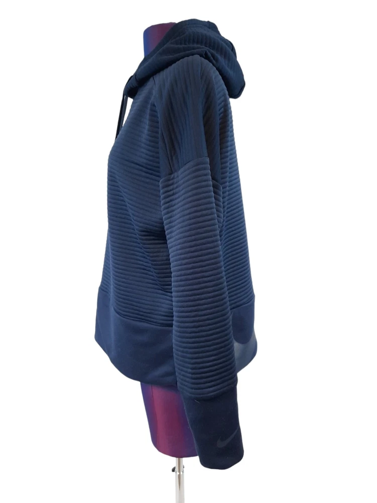 Nike Dri-Fit Navy Ribbed Cowl Neck Hoodie Sweatshirt Size Small Women's. In excellent condition Nike Dri-Fit Navy Ribbed Cowl Neck Hoodie Sweatshirt Size Small Women's. Features super soft ribbed fabric, contrasting ribbed cuffs and hem, slightly cropped, oversized, dolman sleeve, 2 hidden side pockets, mesh lined drawstring hood and pockets, Nike Swoosh logo on left cuff, Nike logo on back wide hem, dri-fit wicks sweat, navy color, streetwear. Measurements laying flat chest 22" length 23" arm inseam 16" Fabric polyester This is a pre-owned item that may show signs of wear. In excellent condition, no flaws.
