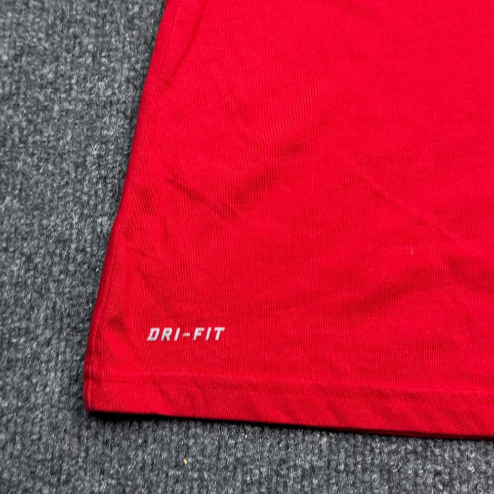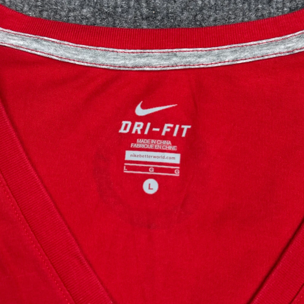 Sleeve Length: Short Sleeve Style: Pullover Pattern: Solid Occasion: Activewear Sleeve Type: Casual Sleeve Closure: Pullover Personalize: No Brand: Nike Features: Stretch Department: Women Size Type: Regular Season: Fall, Spring, Summer, Winter Vintage: No Theme: Classic Model: Nike Dri-Fit Fabric Type: Blended Fabric Strap Type: Strapless Size: L Product Line: Nike Dri-FIT Garment Care: Machine Washable Color: Red Fit: Regular Fabric Wash: Medium Performance/Activity: Running & Jogging Neckline: V-Neck Type: T-Shirt Material: Polyester