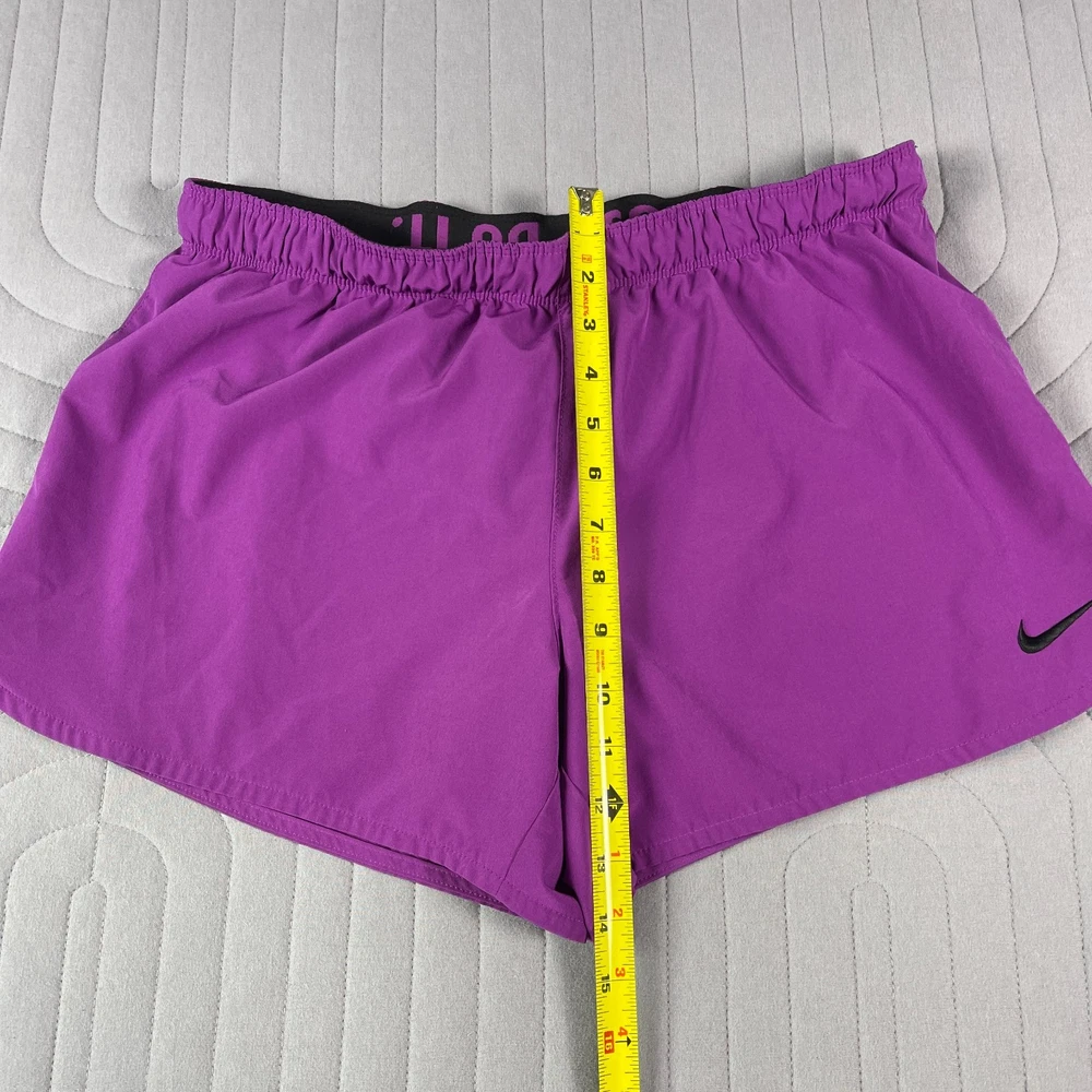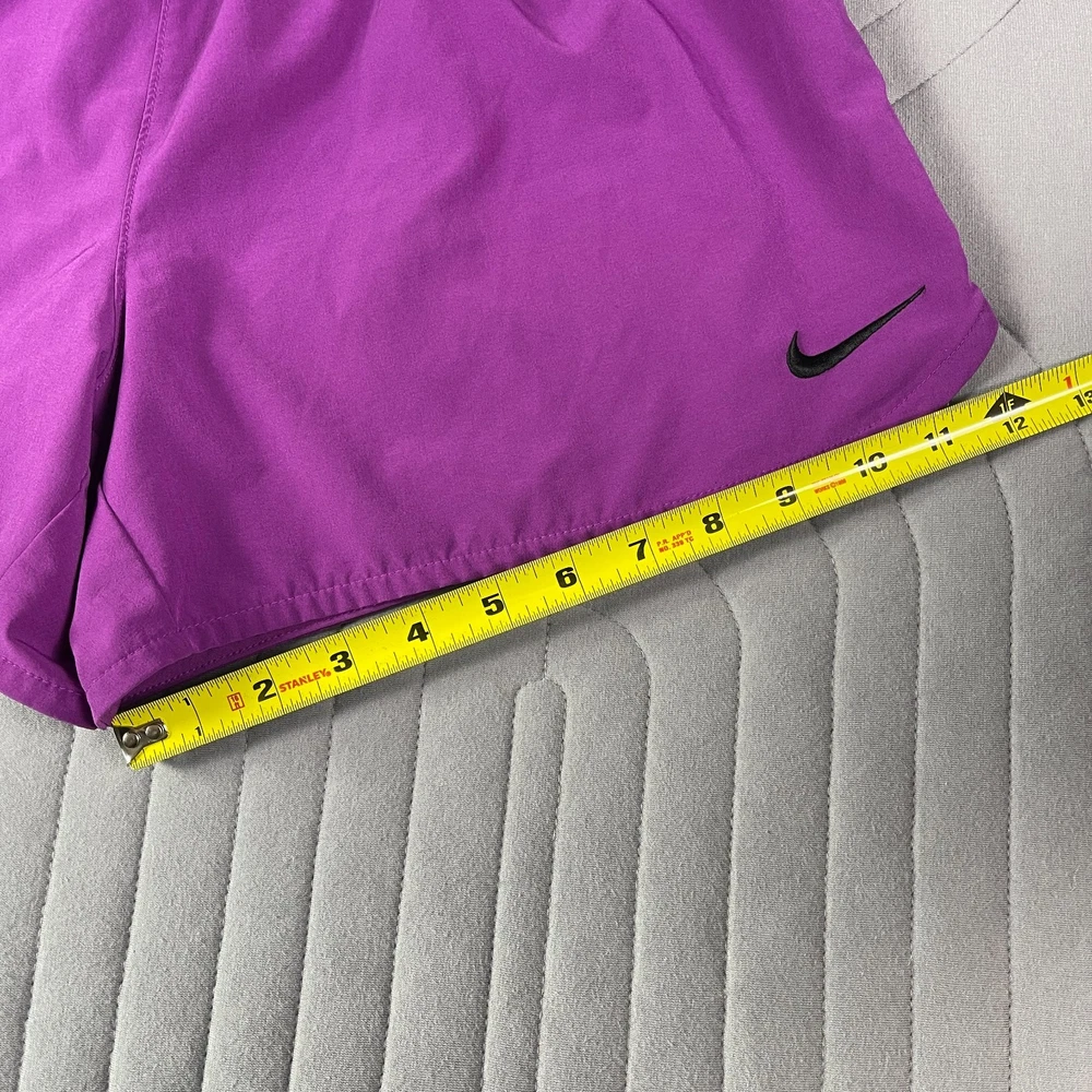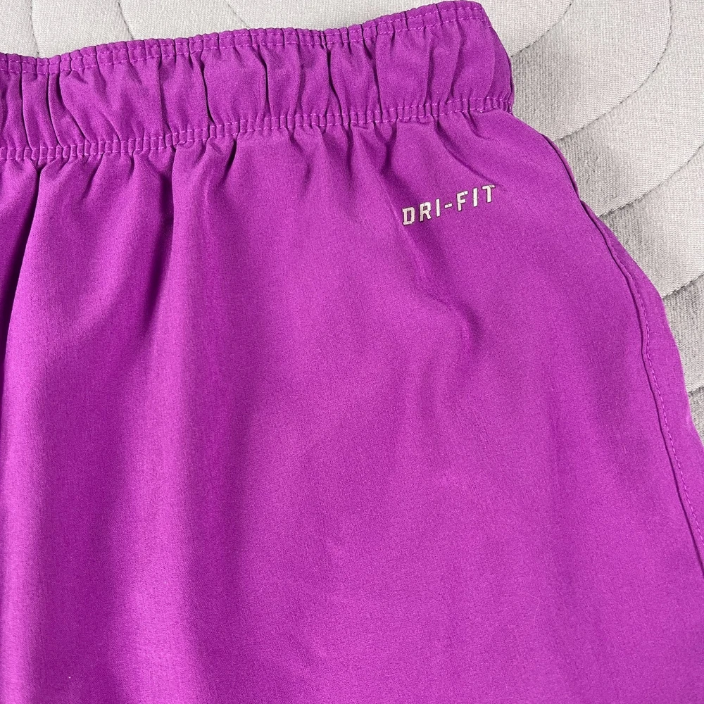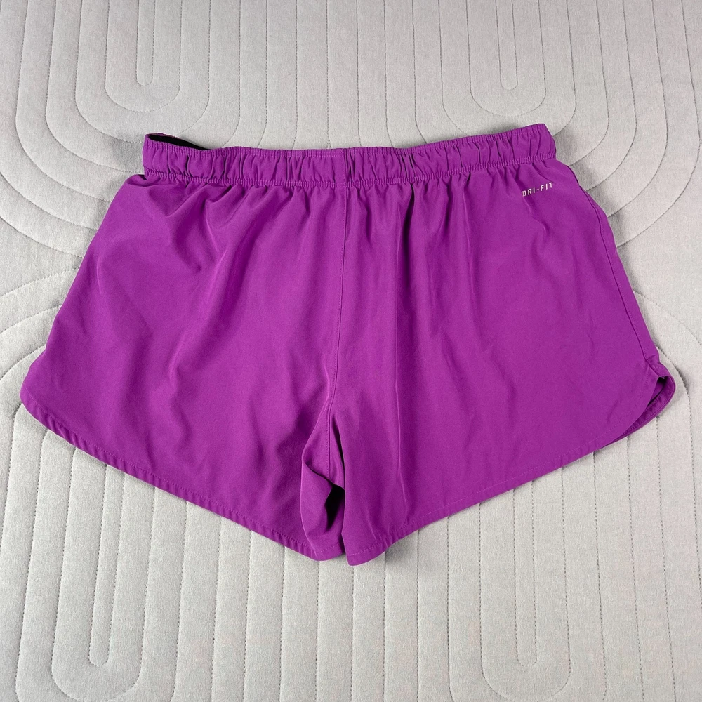 The Nike Dri-Fit Purple Running Shorts for women in size Large are designed for athletic activities, specifically running and jogging. Made of polyester with a solid purple color, these shorts feature a drawstring closure, lined interior, and stretch material for comfort and flexibility. The 3.5-inch inseam and athletic fit make them suitable for active women looking for supportive and stylish activewear for the summer, fall, and spring seasons. Machine washable for easy care, these Nike shorts are a great addition to any active wardrobe.