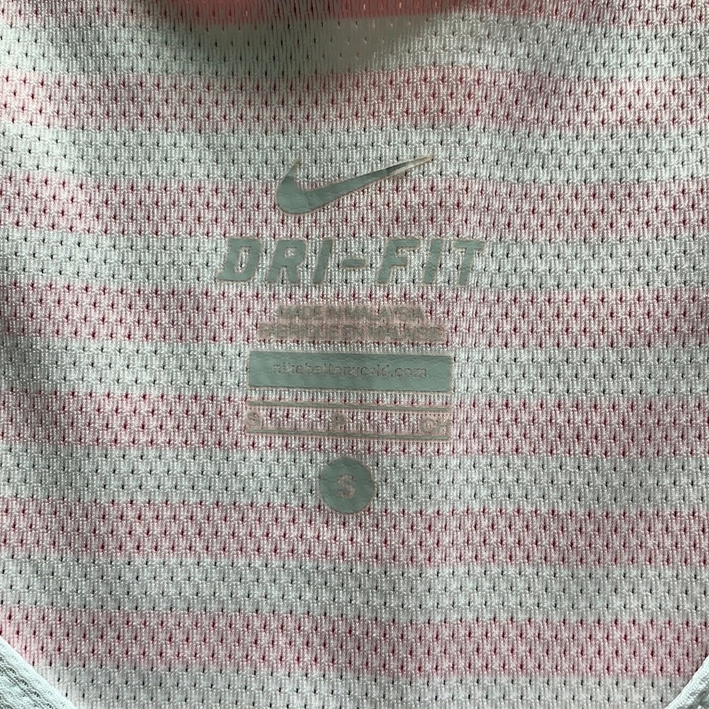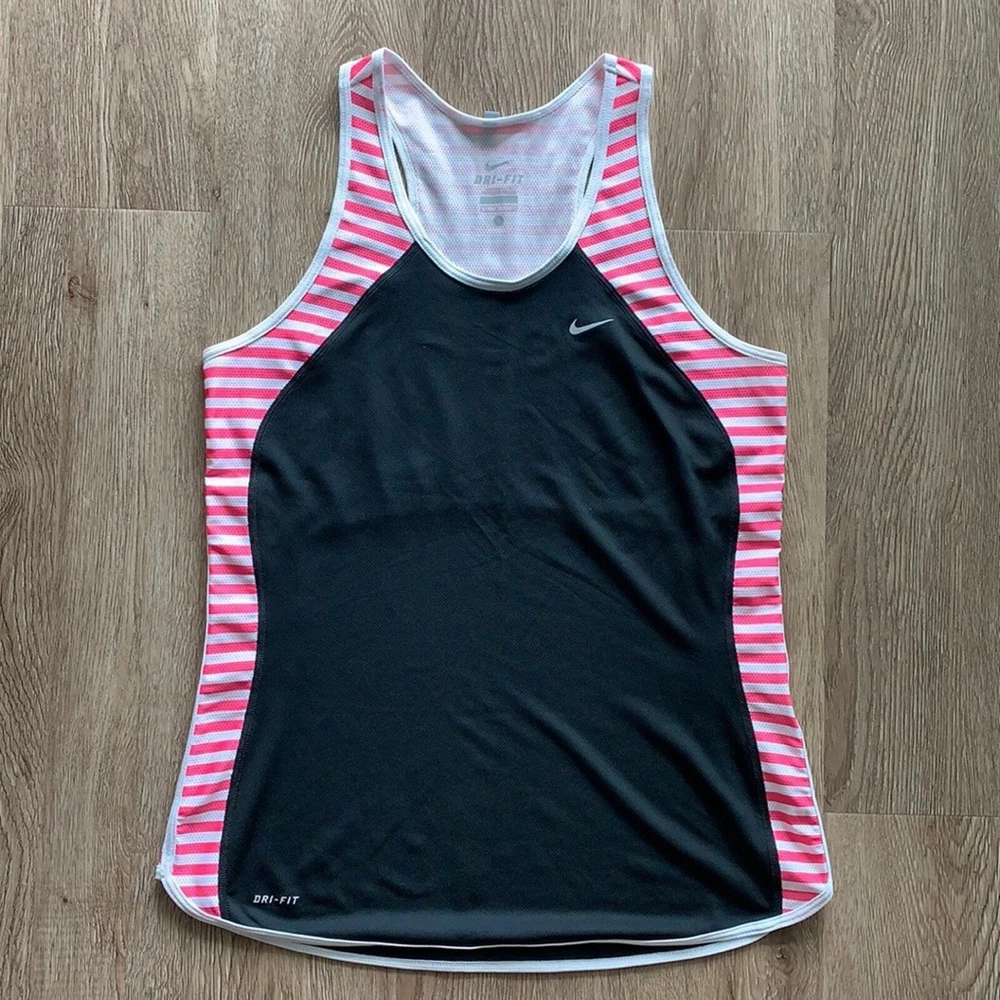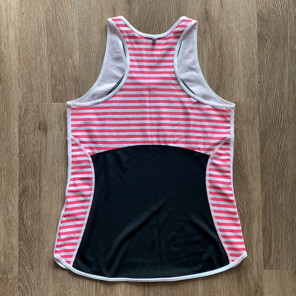 Excellent used condition. No holes or stains. Size: small -Light breathable material -Black with pink and white stripes -Higher neck line for coverage
