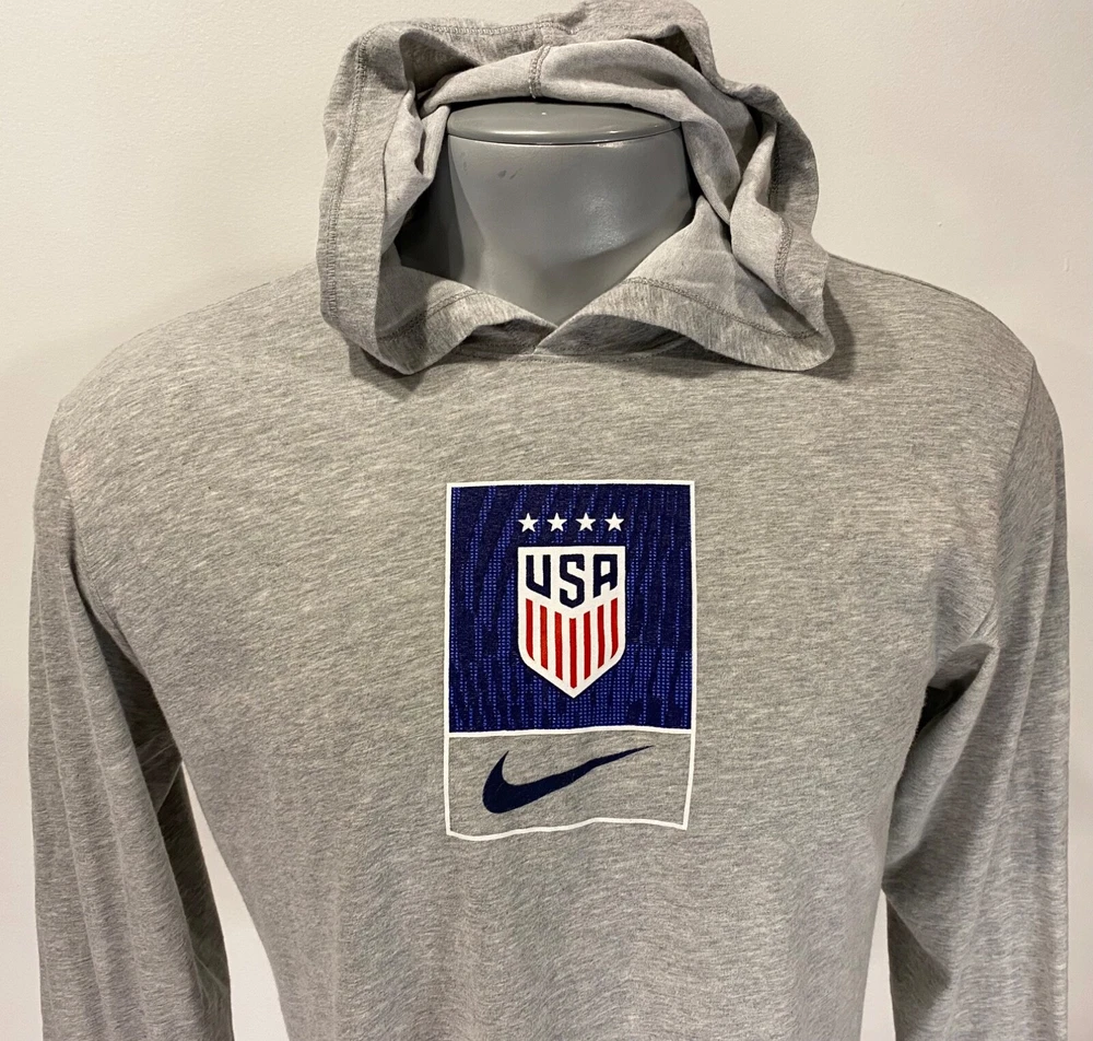 NIKE SMALL LONG SLEEVE HOODIE T-SHIRT TEE GRAY USA SOCCER ACTUAL MEASUREMENTS: 20 INCH CHEST (PIT TO PIT) 30 INCH LENGTH (TOP OF SHOULDER TO HEM) 24 1/2 INCH SLEEVES (SHOULDER SEAM TO END) 100% GENUINE AND AUTHENTIC *************************************************************** *We specialize in providing our Customers with High End, Brand Name Designer Clothing at an Affordable Cost....regardless of whether it's brand new or pre-owned. Our goal is for customer satisfaction!! If you have any questions or concerns feel free to reach out and contact us! P31 All Pre-Owned Clothing is Properly Cleaned & Laundered as per ebay policy standard